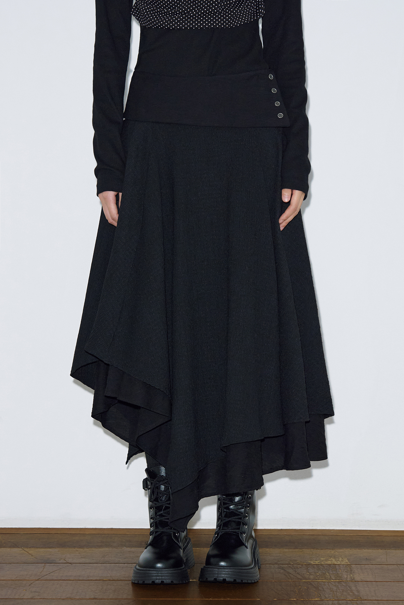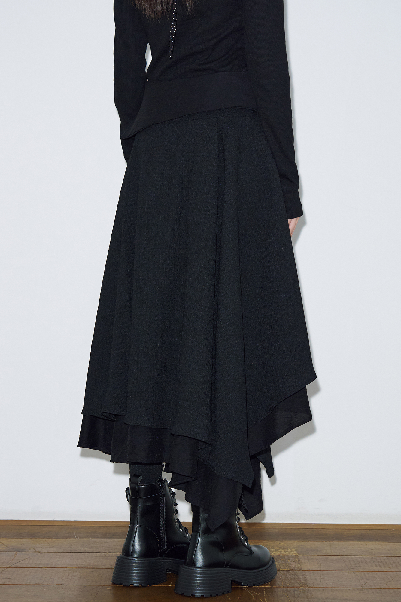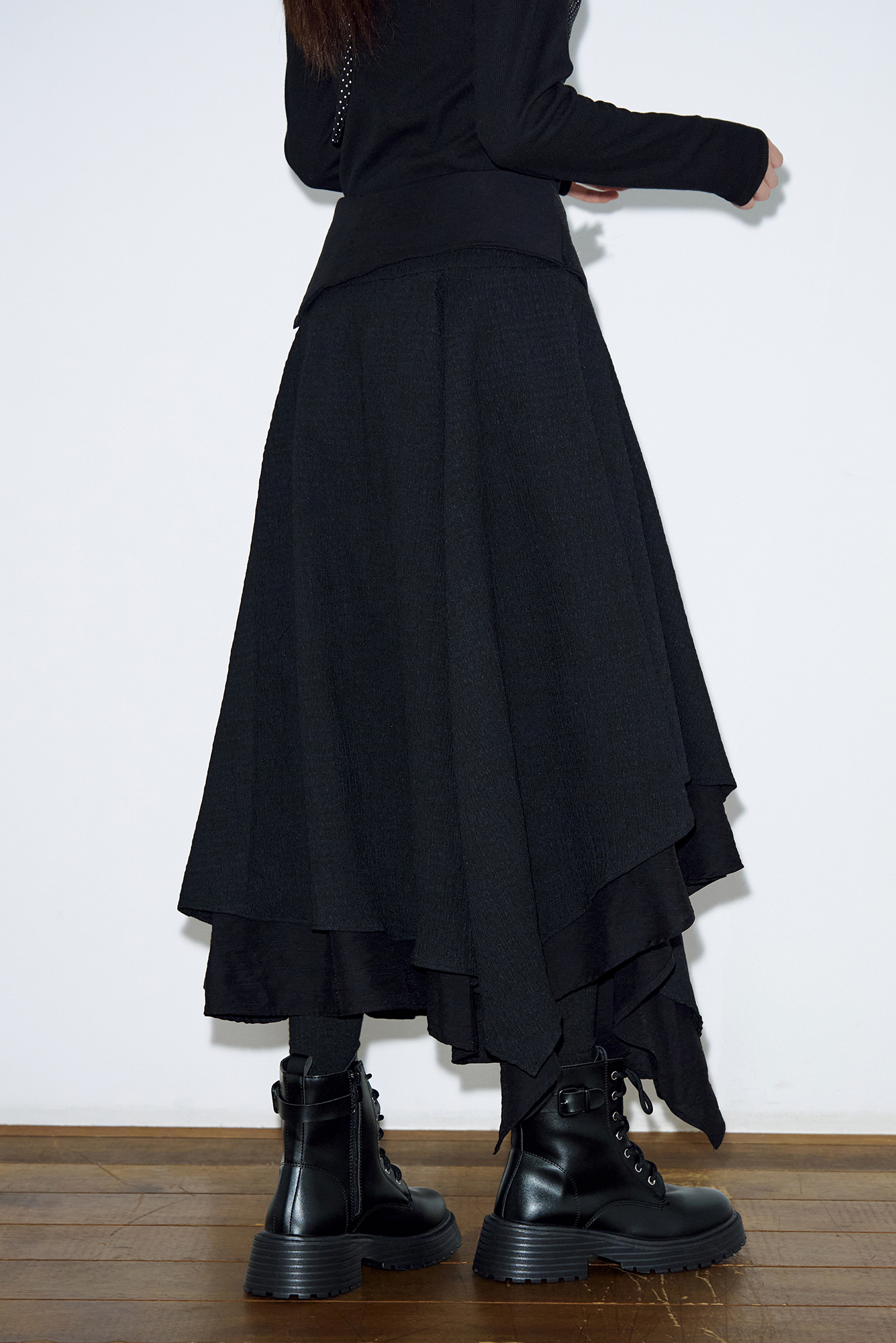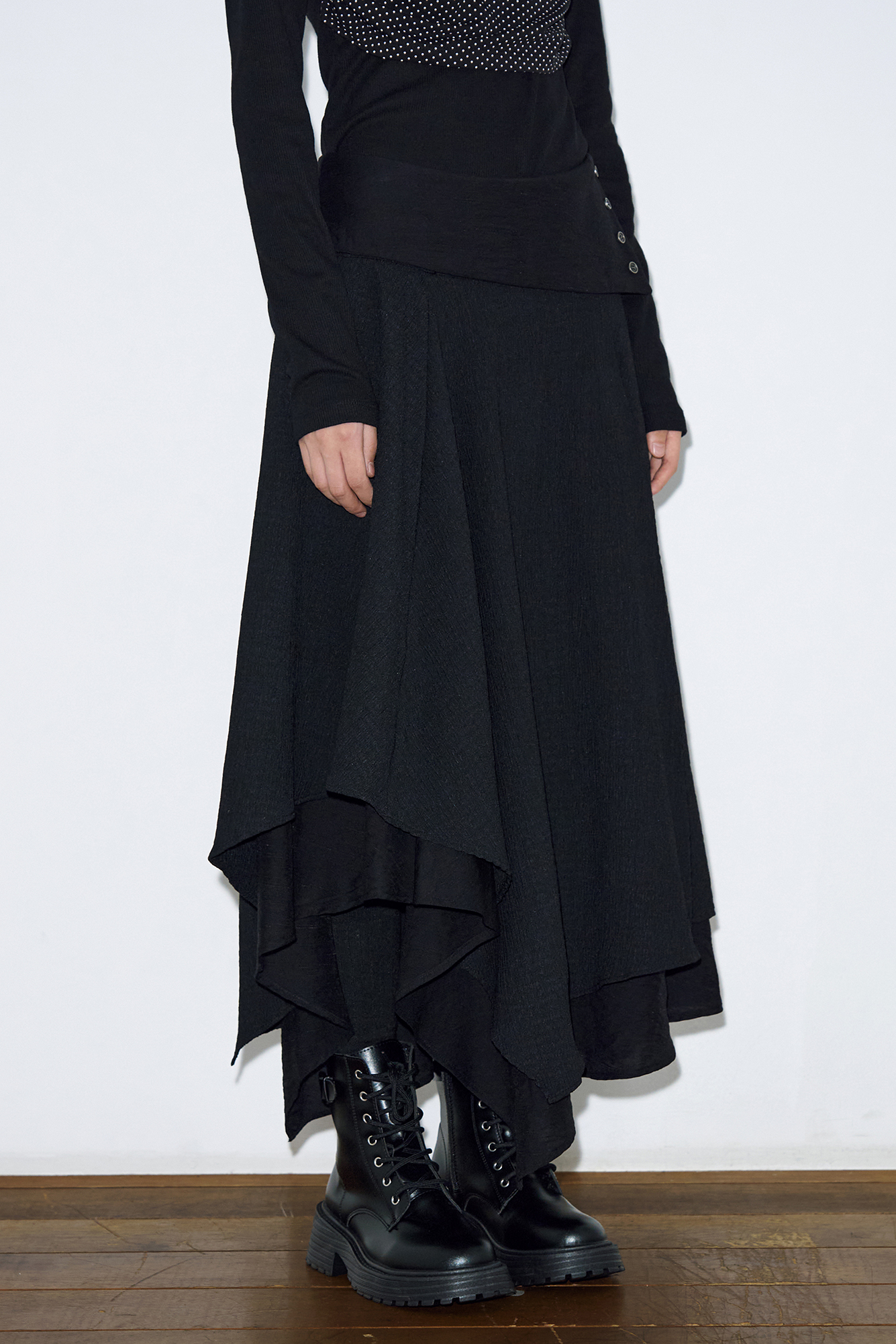크리즈 레이어드 언벨런스 롱 스커트 [블랙]