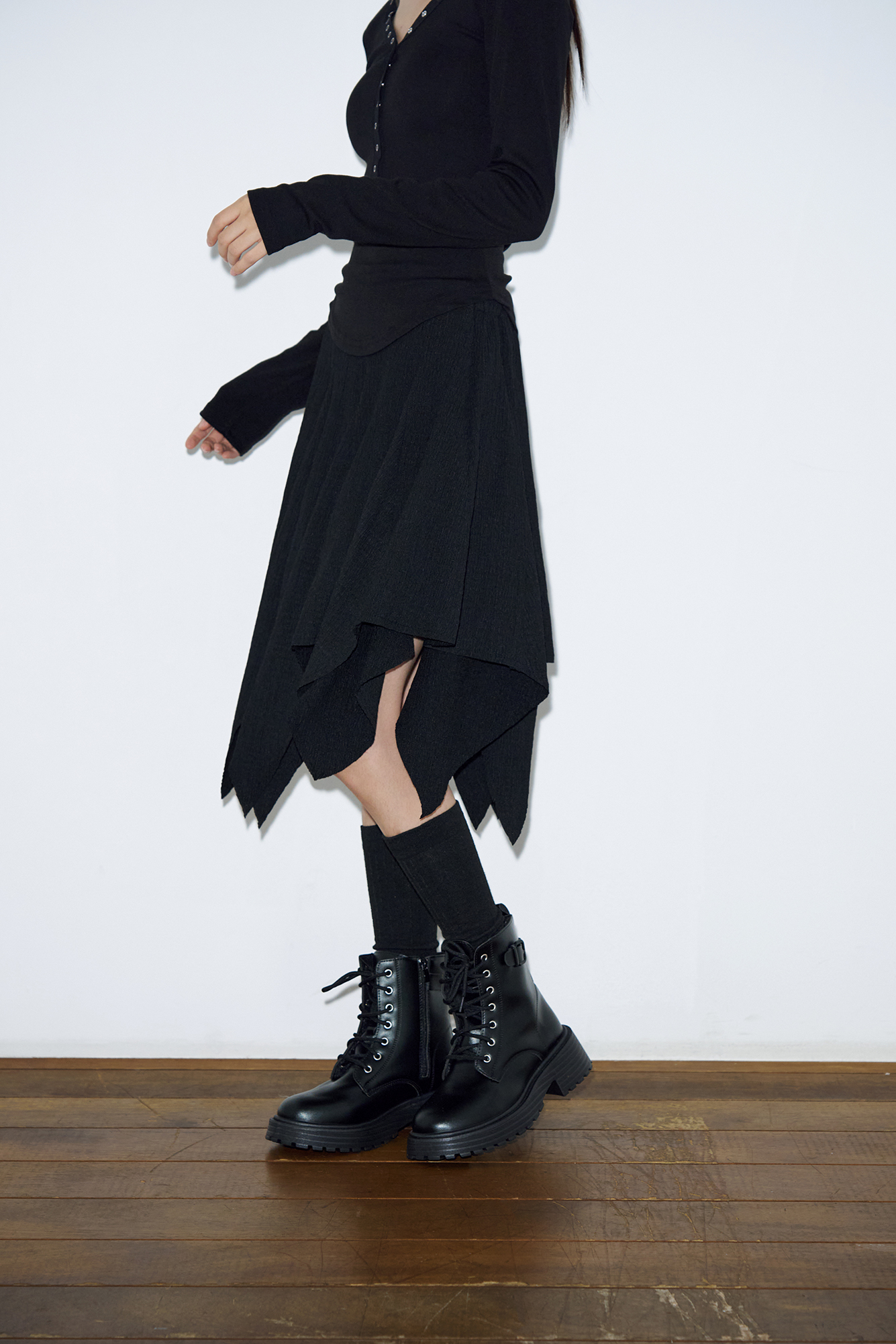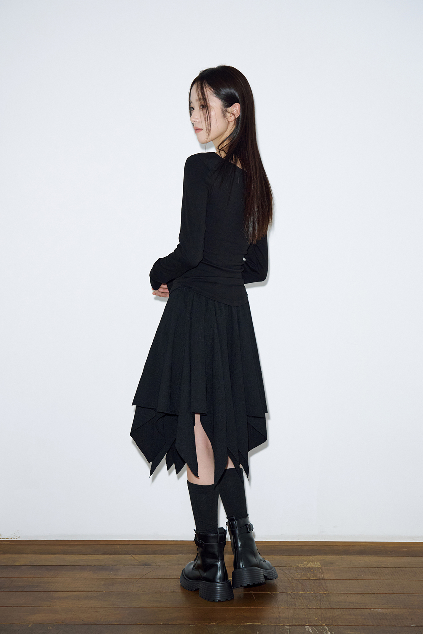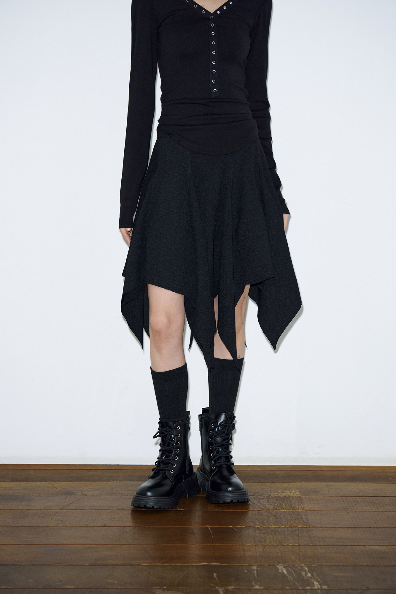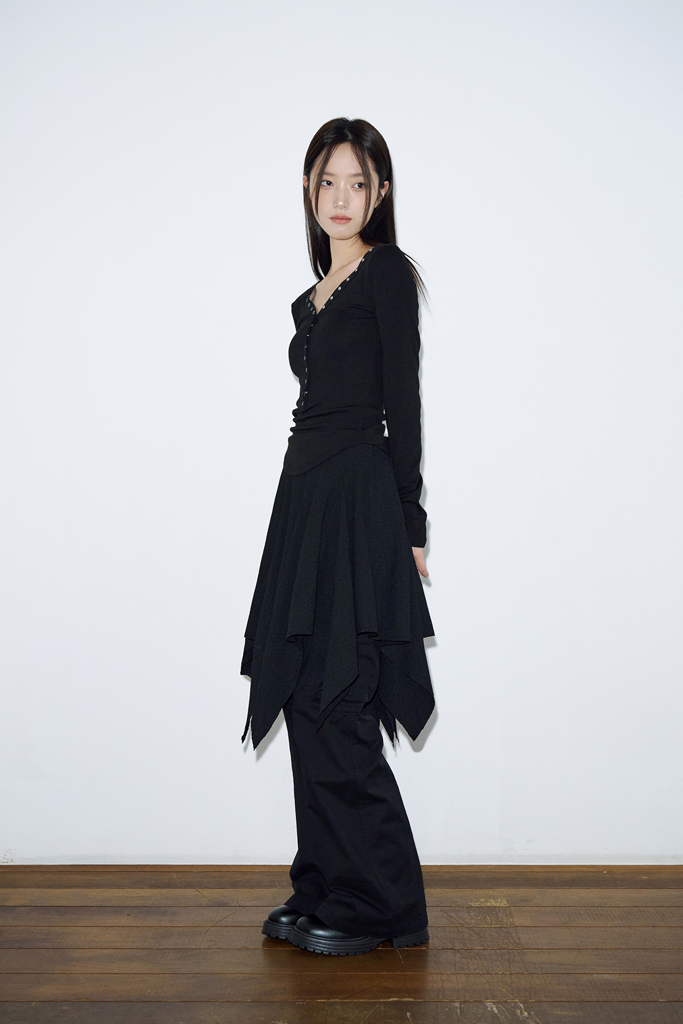- 언밸런스한 절개 패턴으로 트렌디함을 살렸습니다.