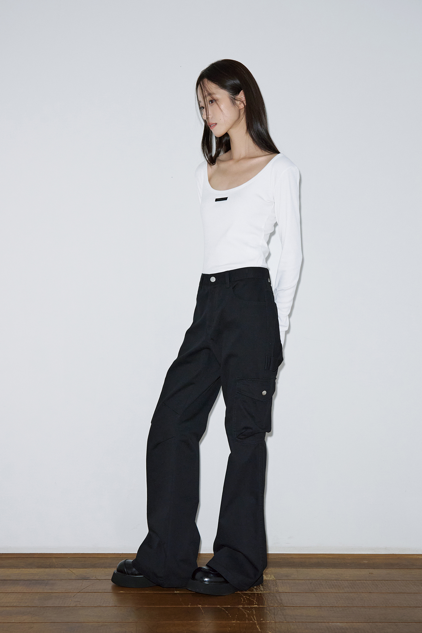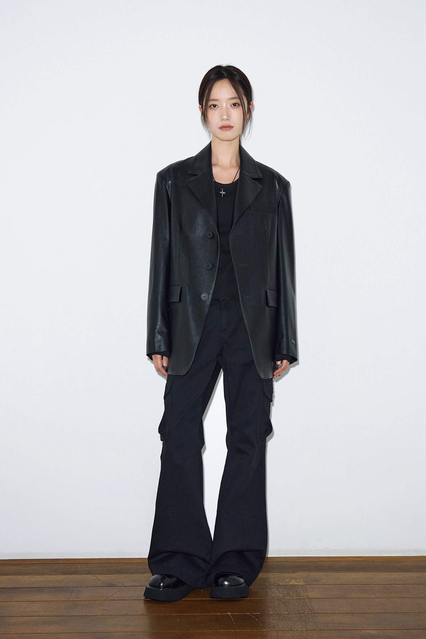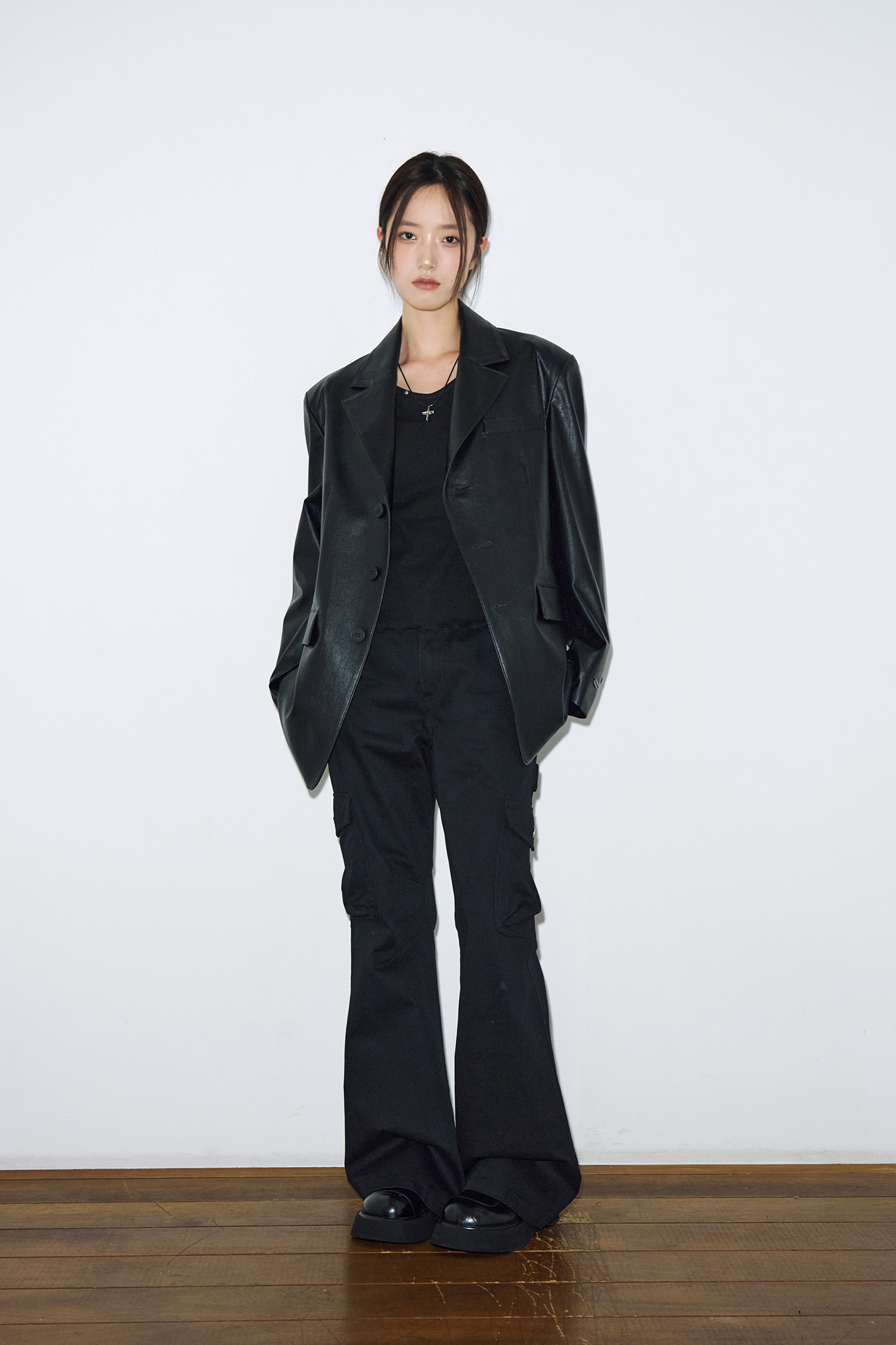 - 슬림한 허벅지 라인과 핀턱 디테일, 부츠컷 실루엣이 매력적입니다.