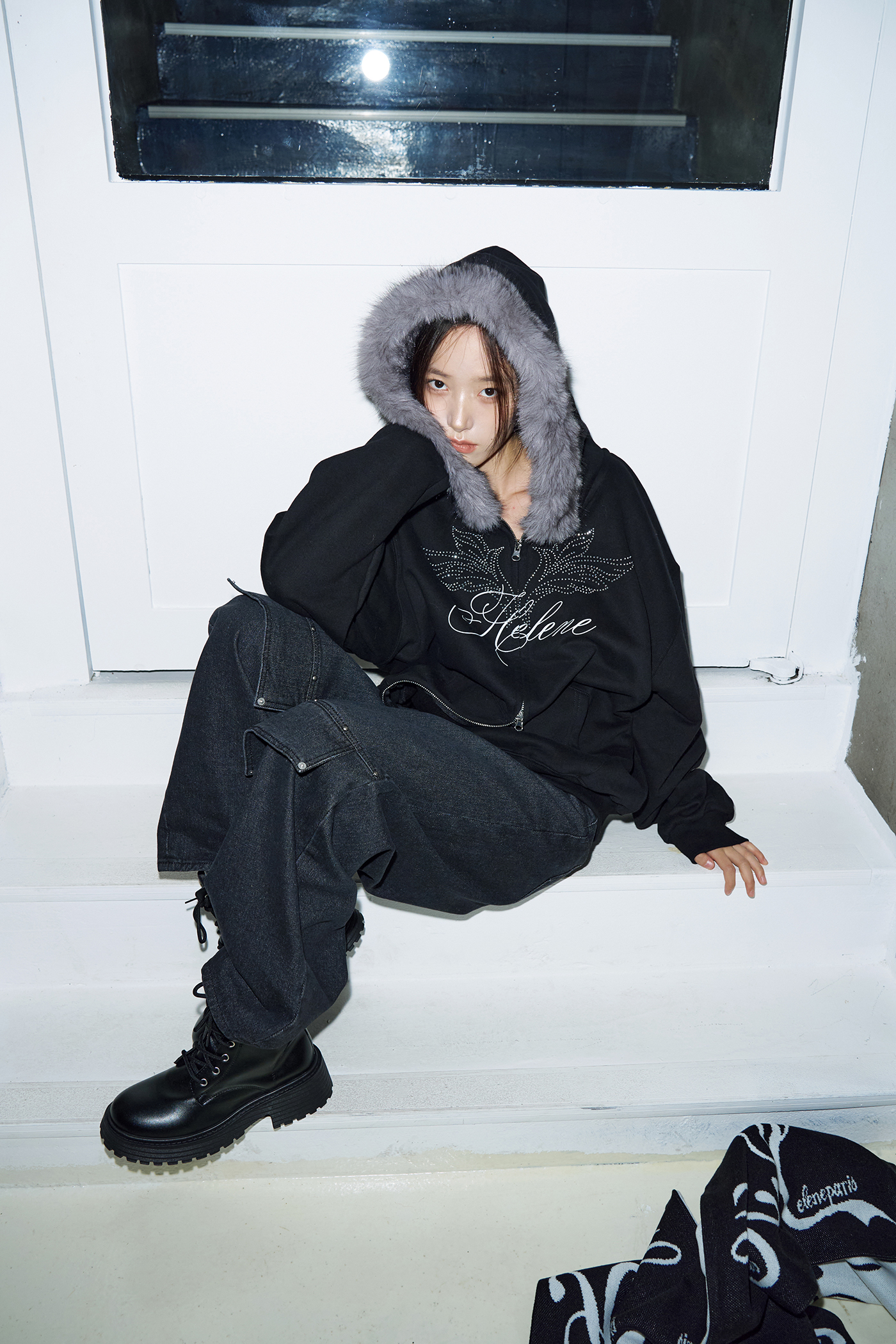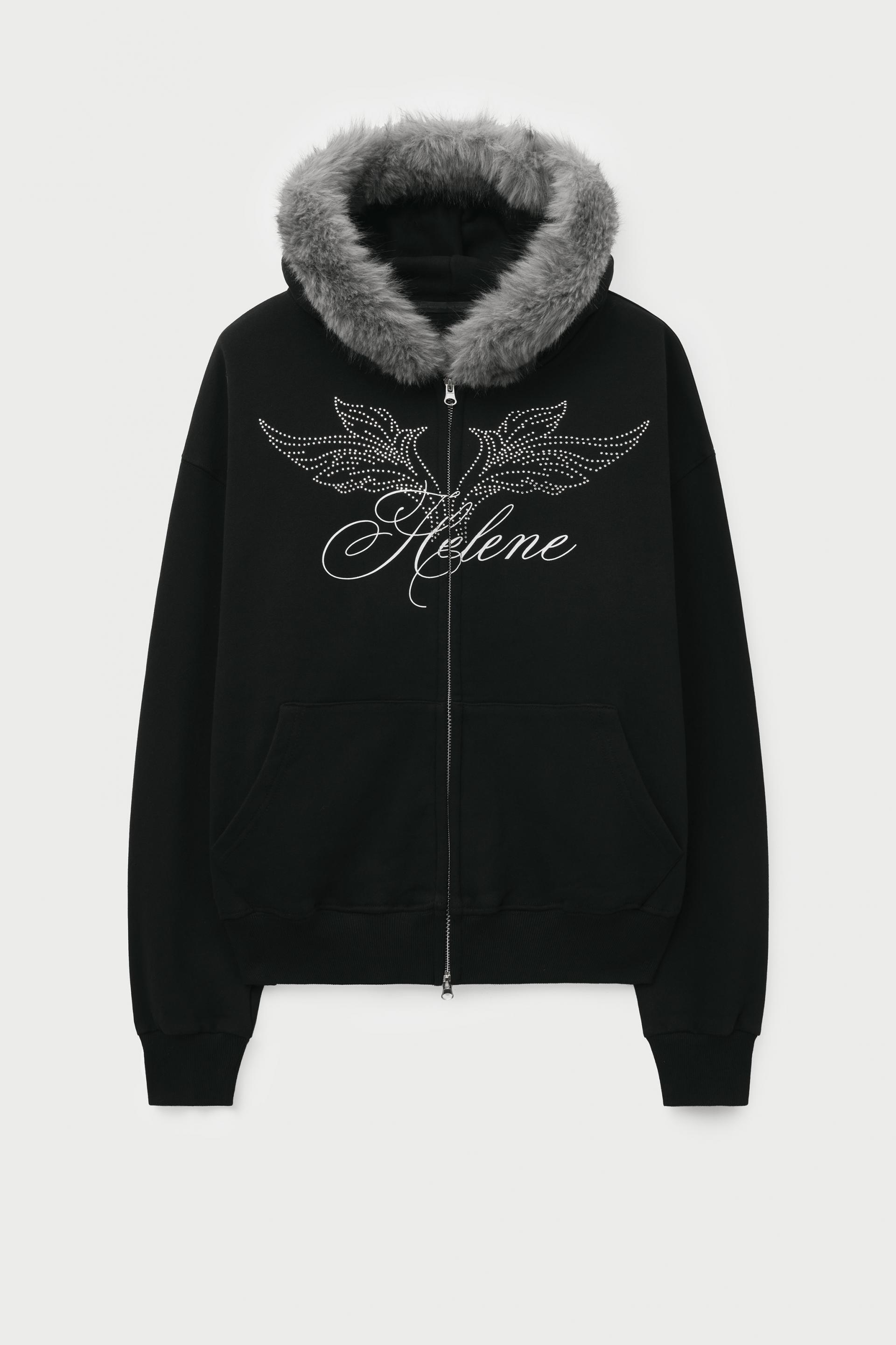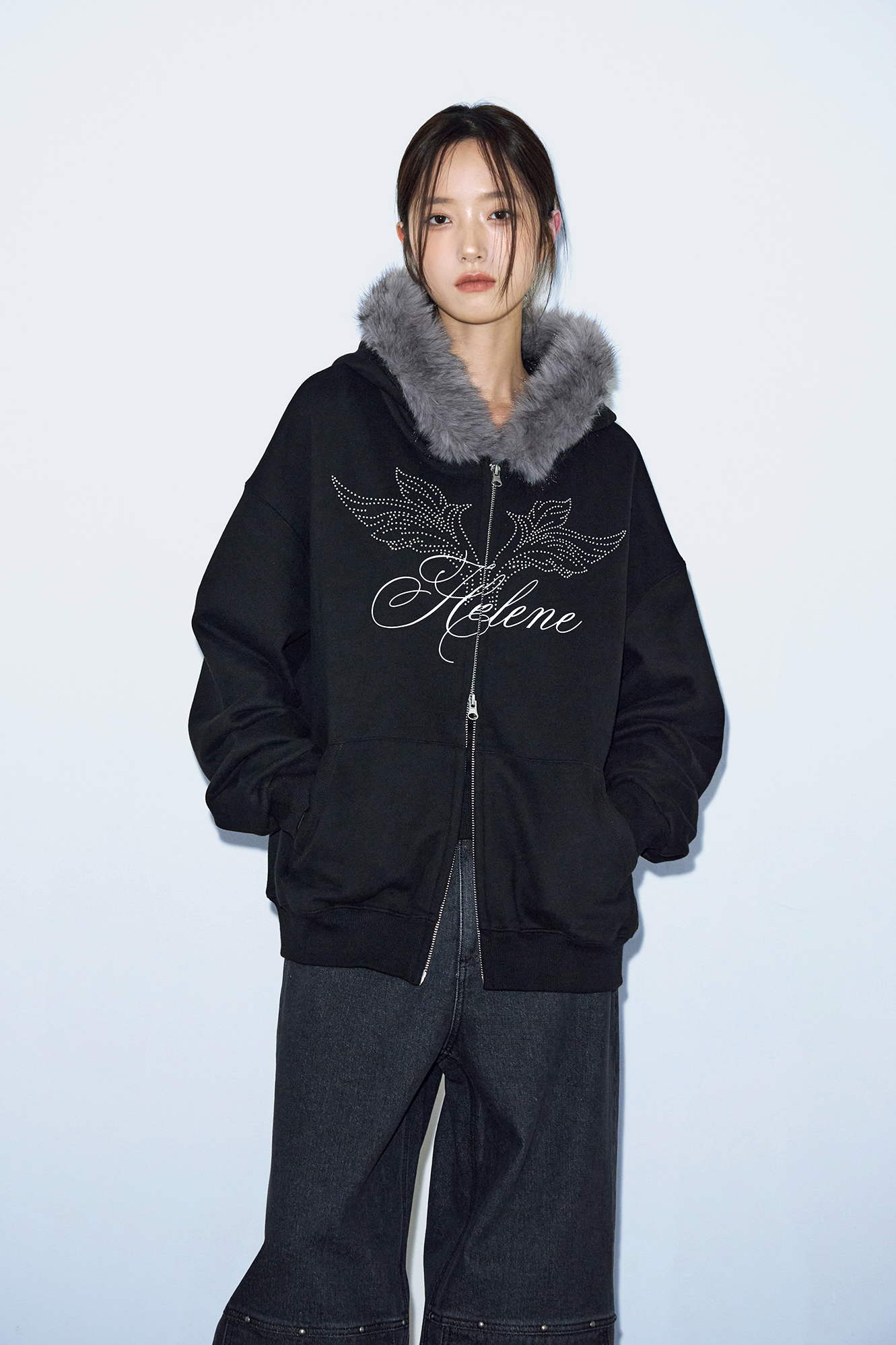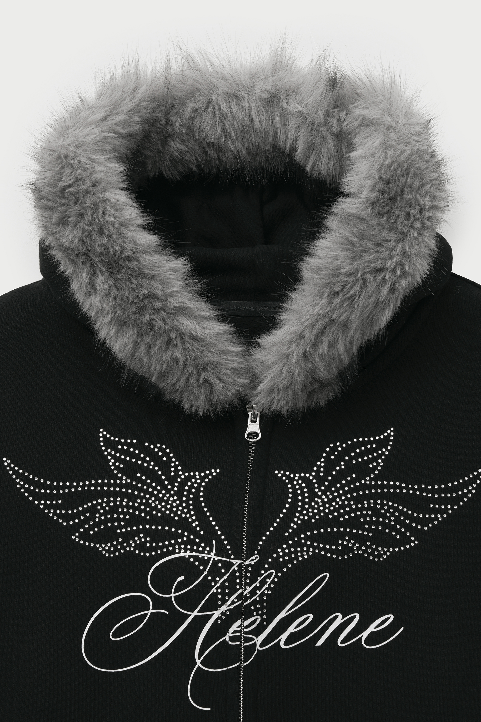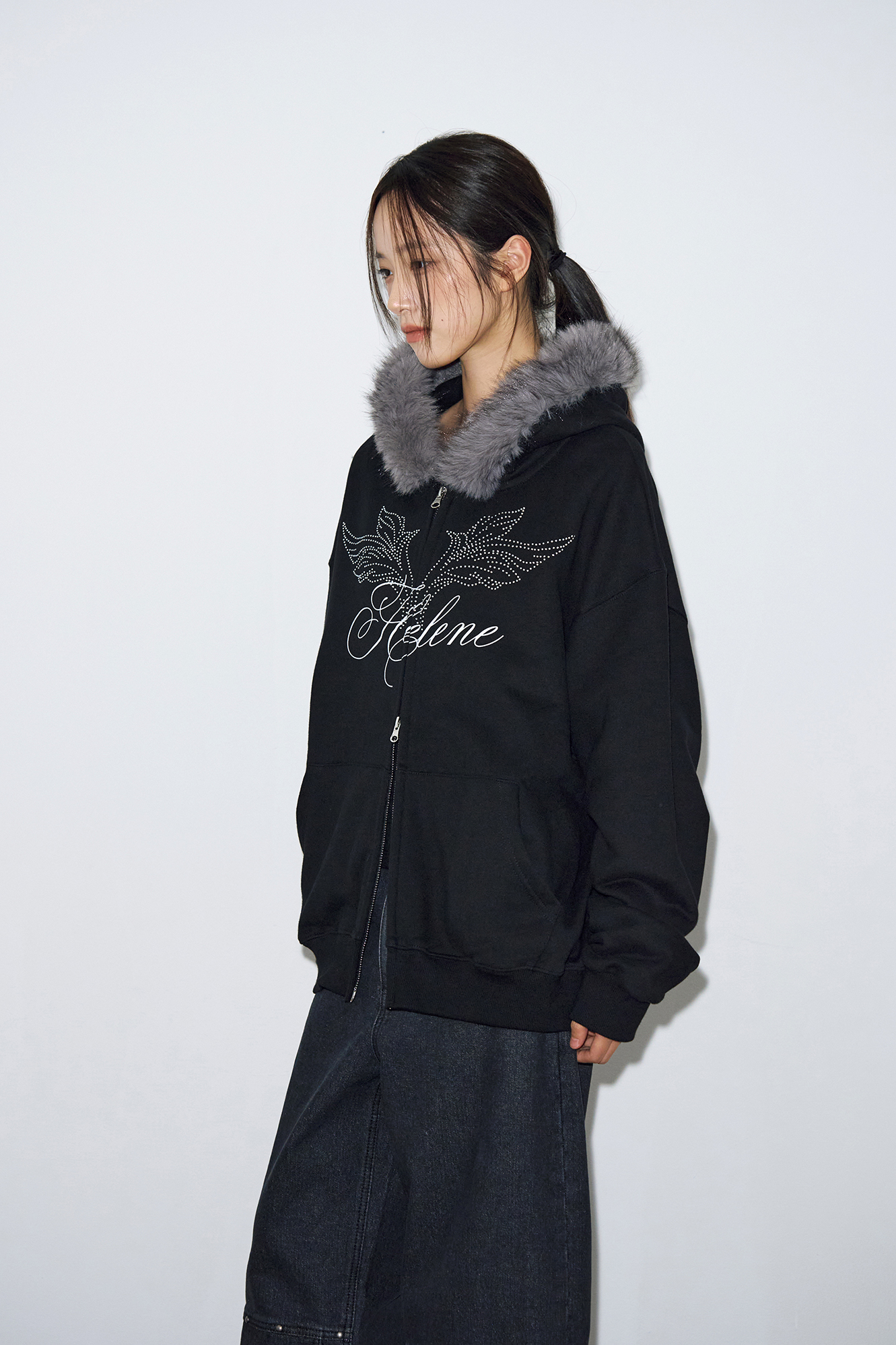 엔젤 레터링 퍼 트리밍 후드 집업 [블랙]
