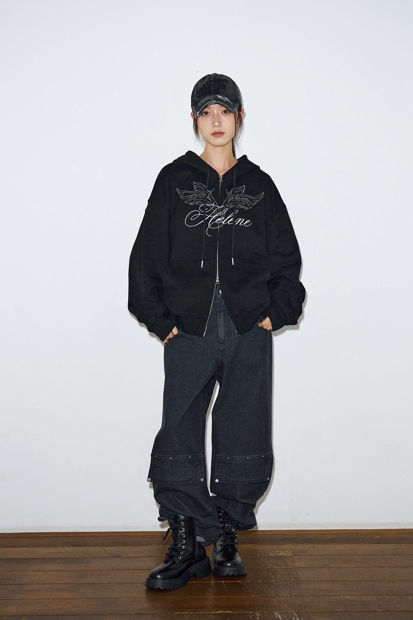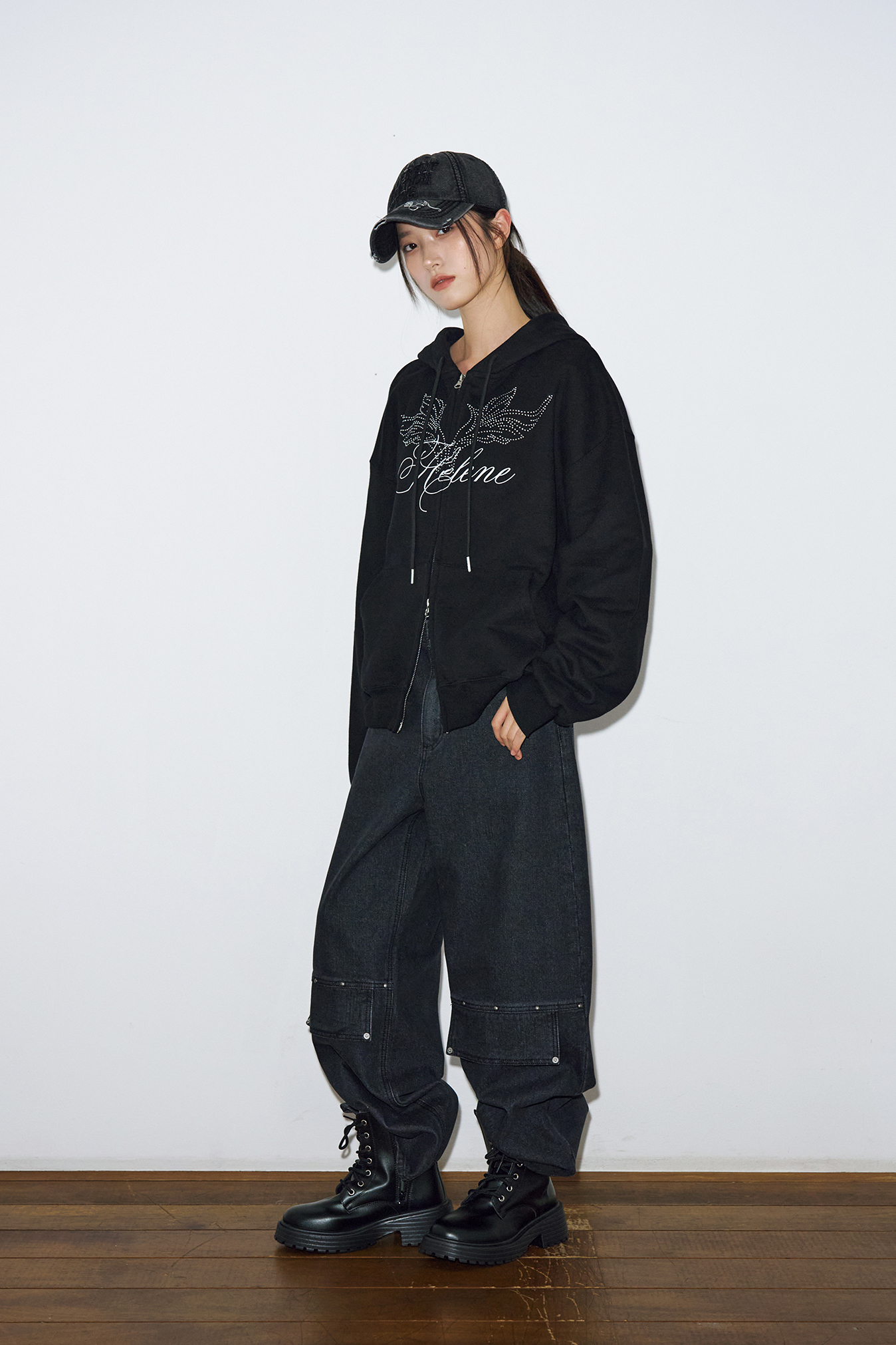 - 로고 프린팅과 큐빅 디테일이 더해진 오버핏 후드 집업입니다.
