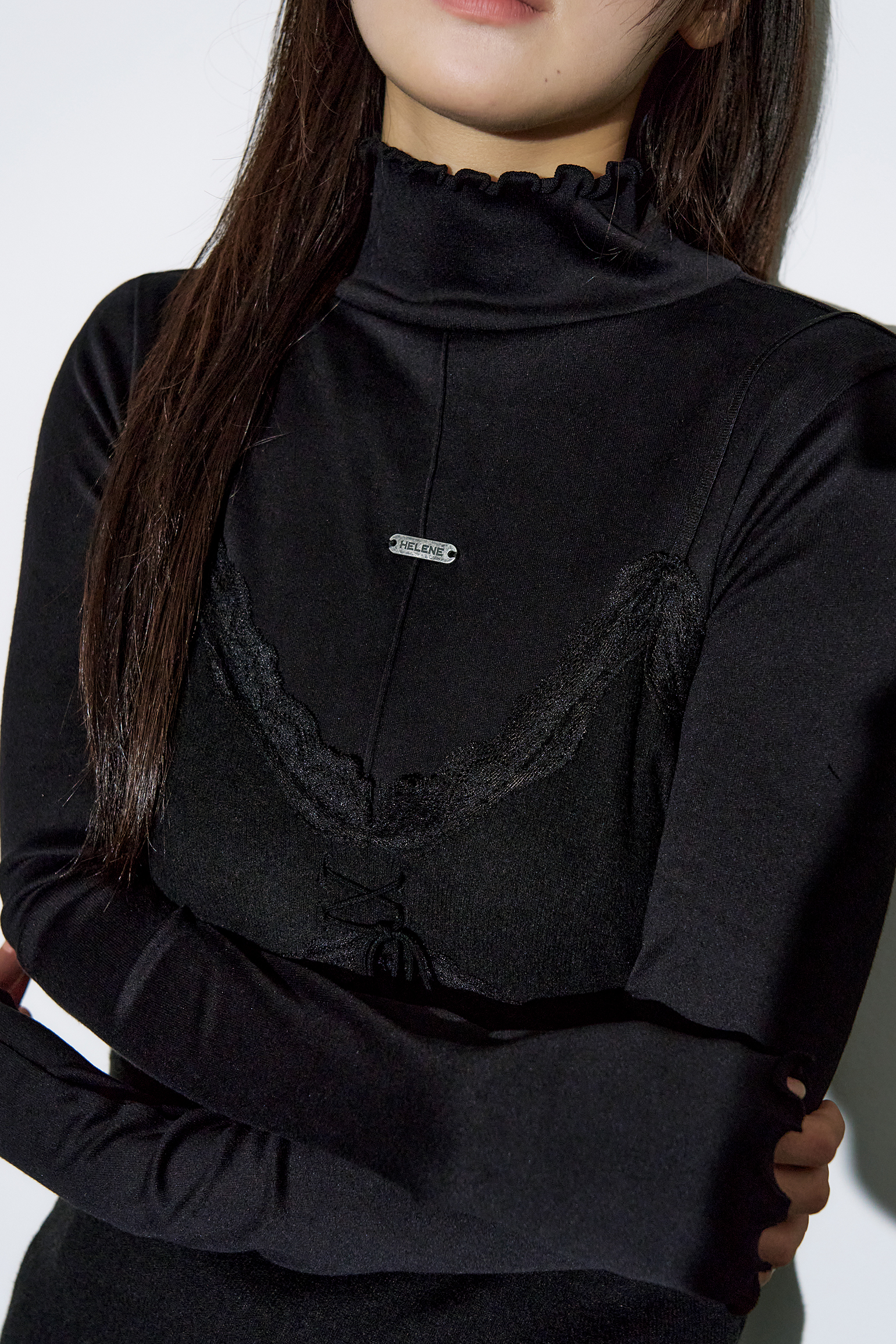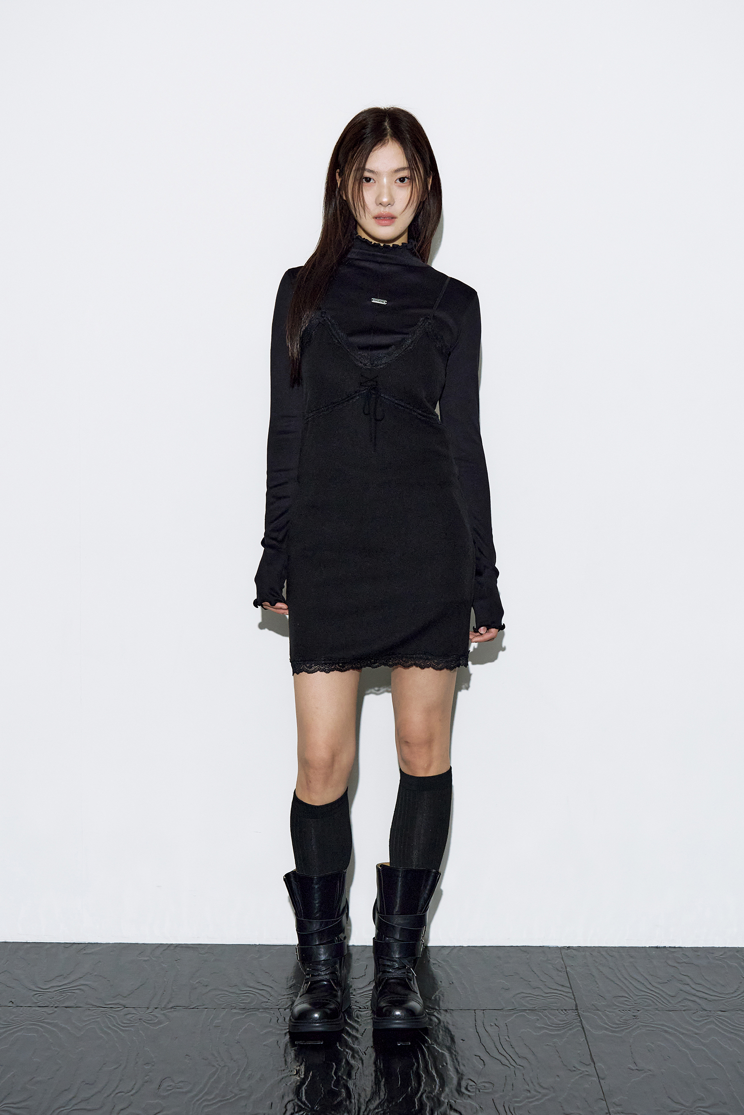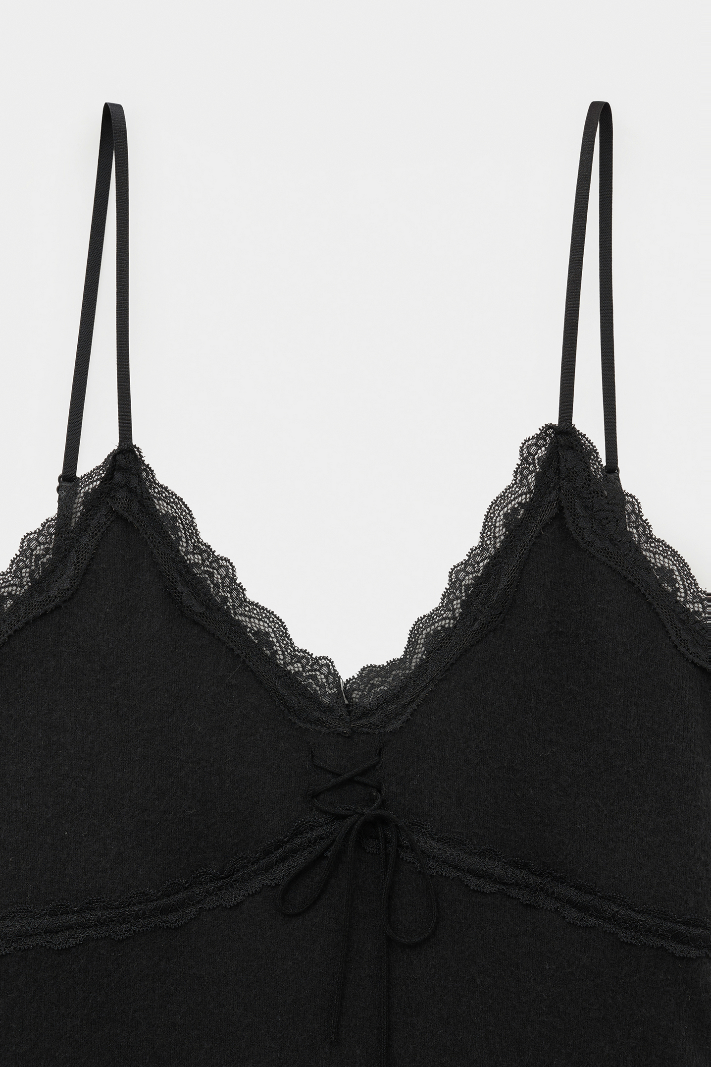 - 체스트의 스트랩 디테일과 밑단과 바스트 라인에 더해진 레이스가 로맨틱한 무드를 연출합니다.