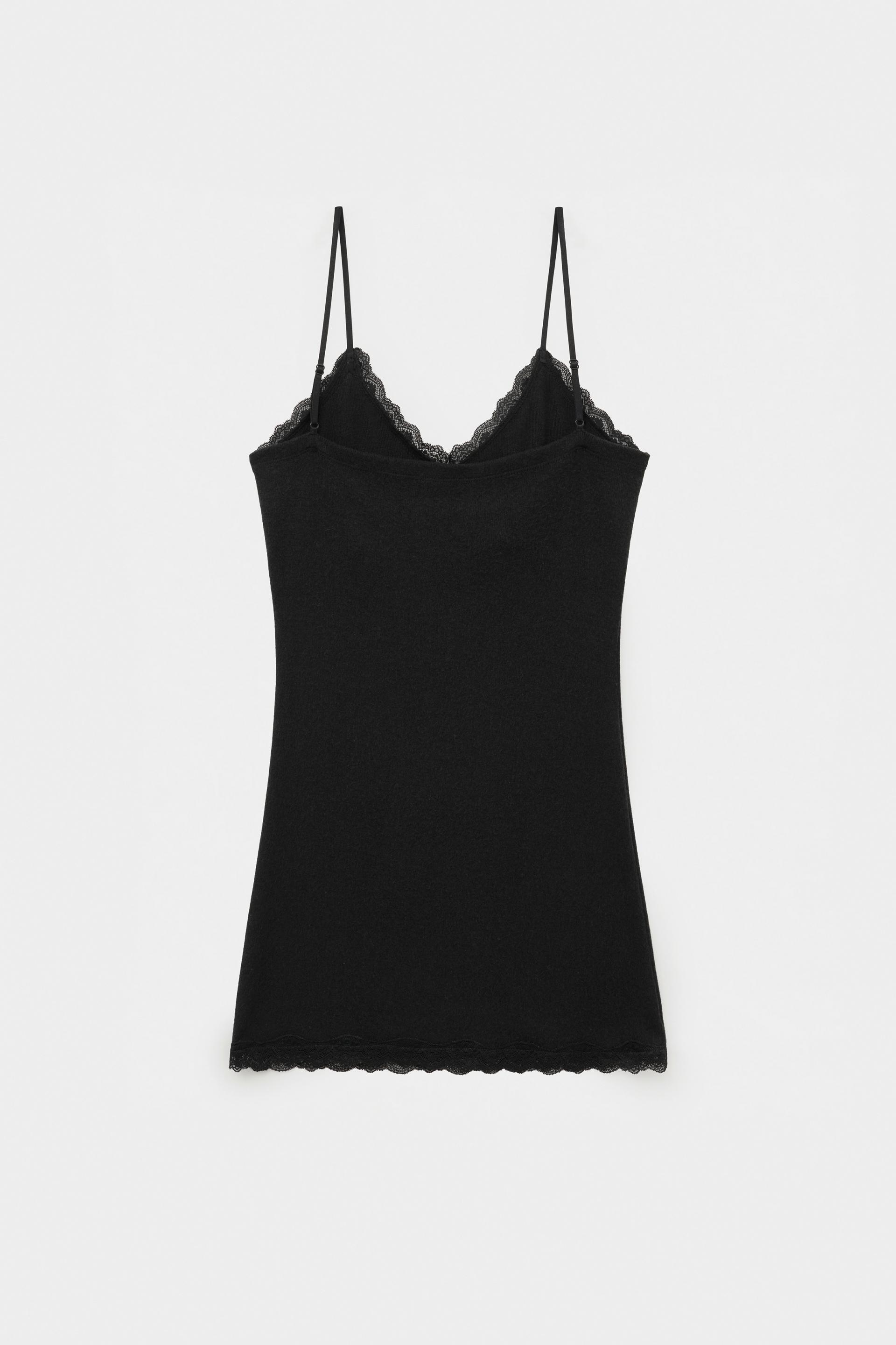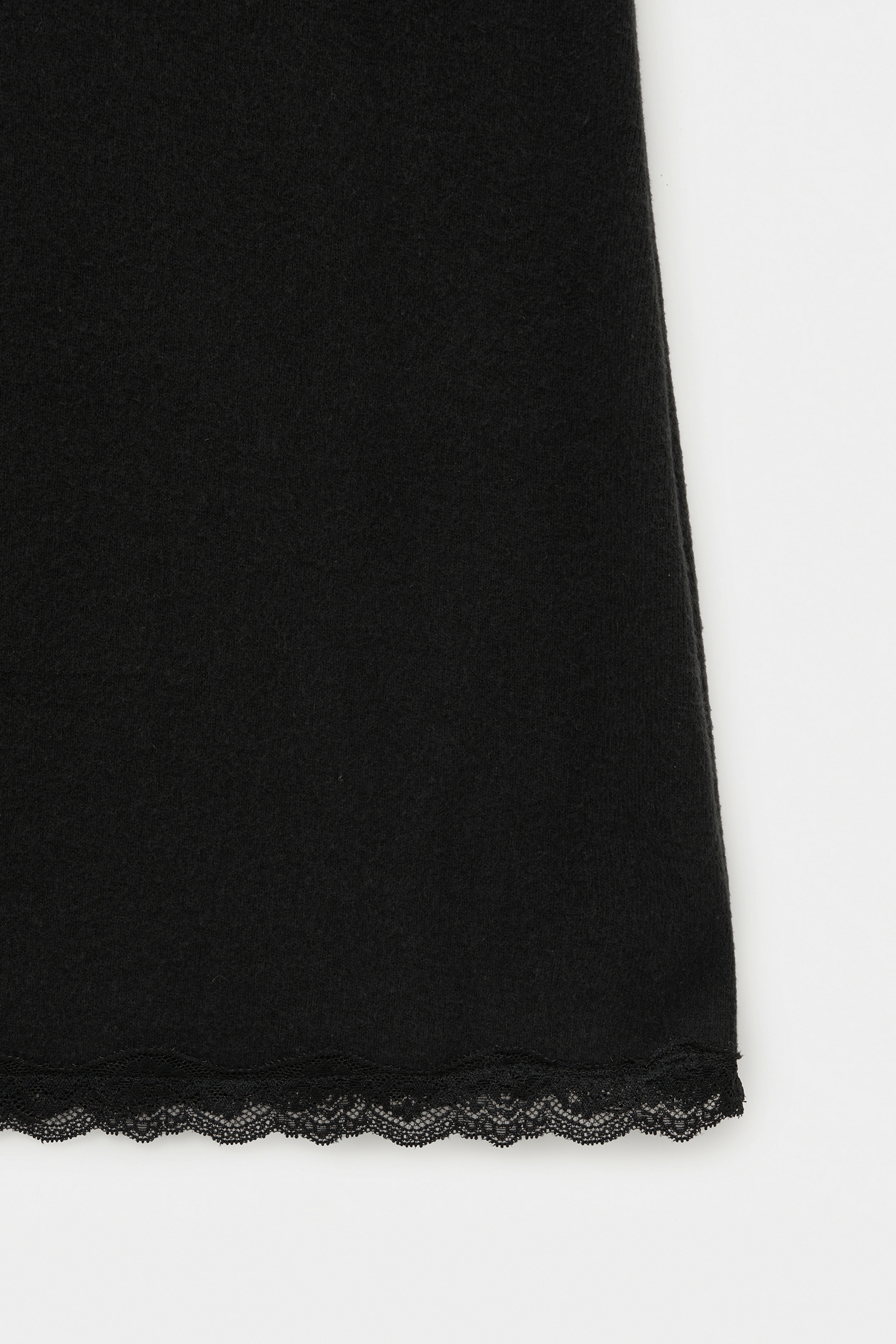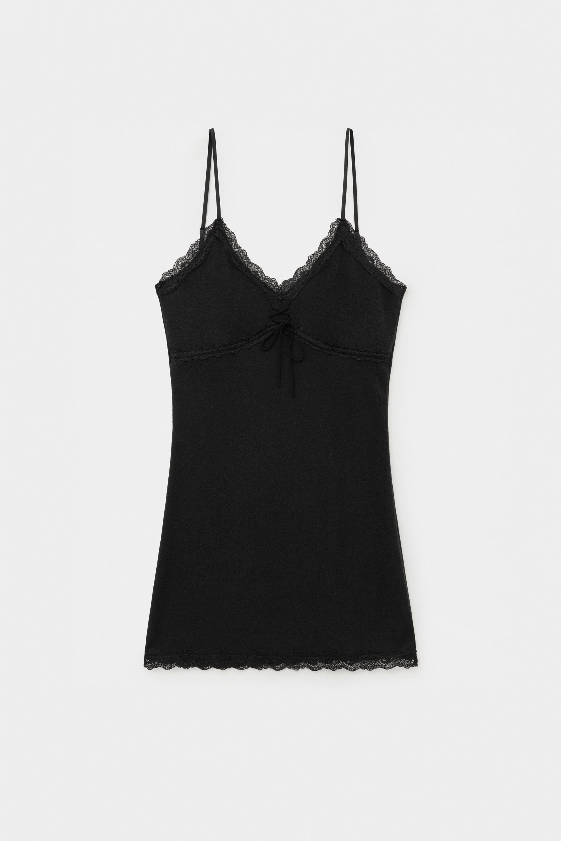 - 체스트의 스트랩 디테일과 밑단과 바스트 라인에 더해진 레이스가 로맨틱한 무드를 연출합니다.