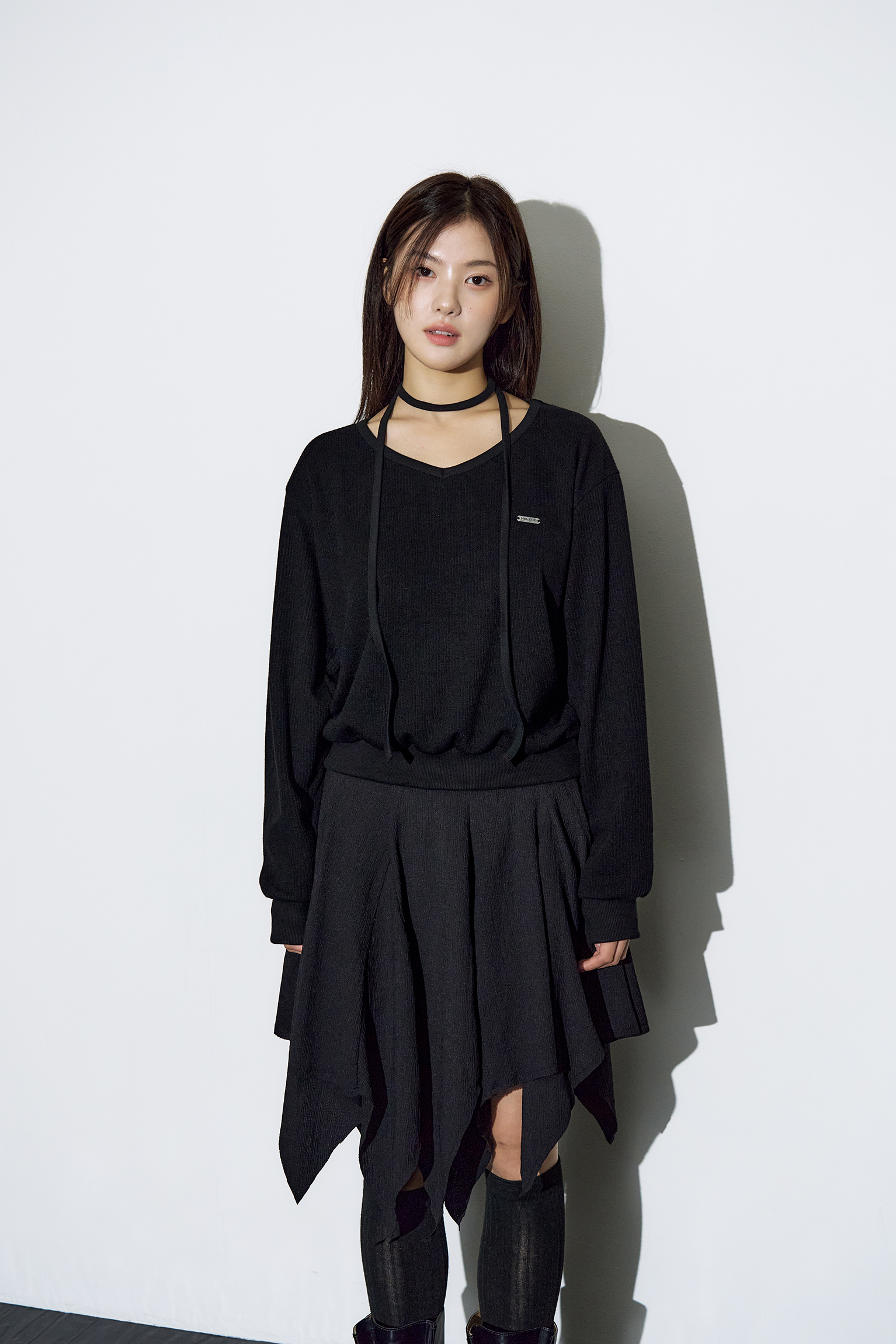 - 넥 스트랩을 레이어링하여 다양한 연출이 가능한 브이넥 스웻 셔츠입니다.