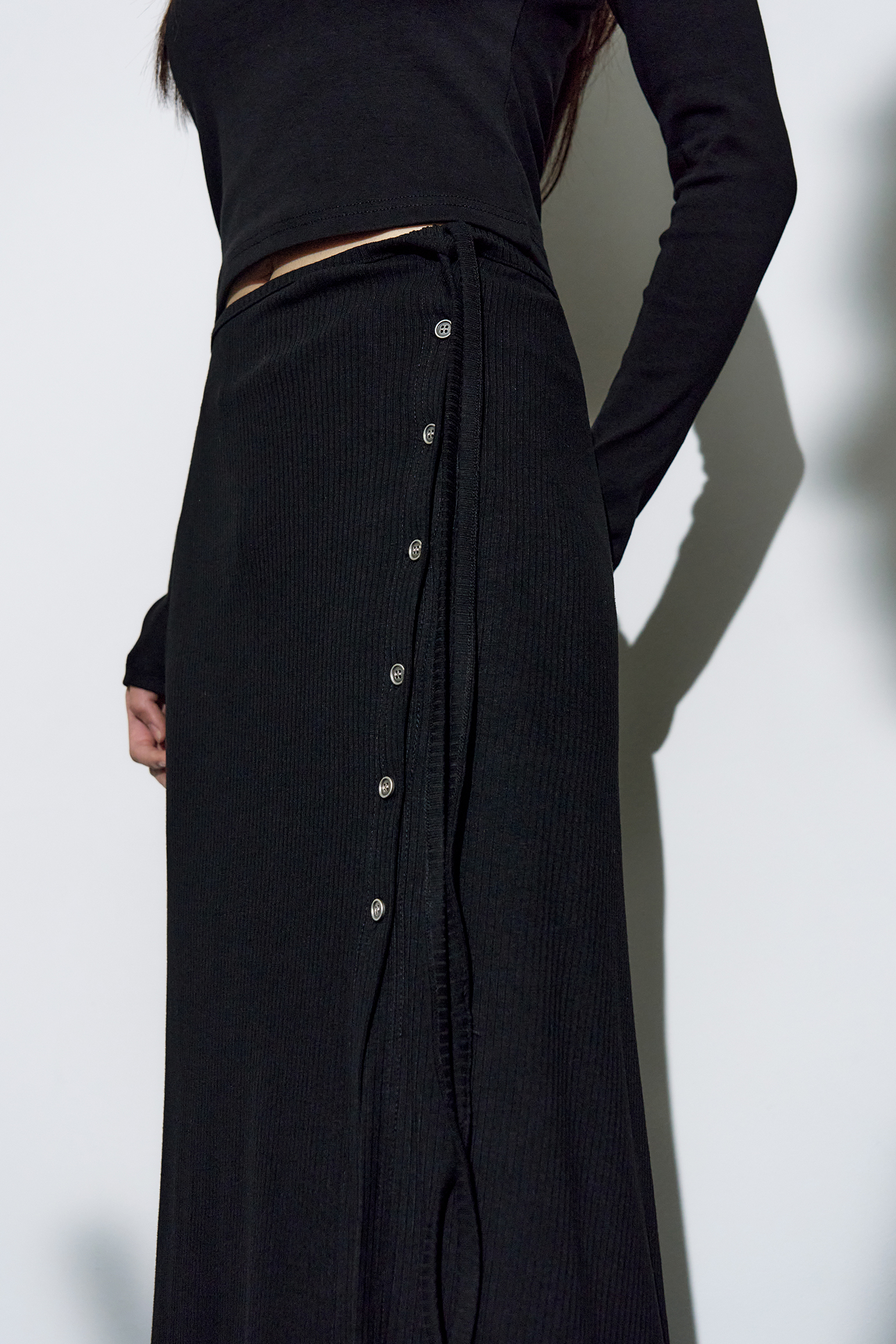 - 랩 스커트의 사이드에 더해진 메탈 버튼 슬릿을 통하여 다양한 연출이 가능합니다.