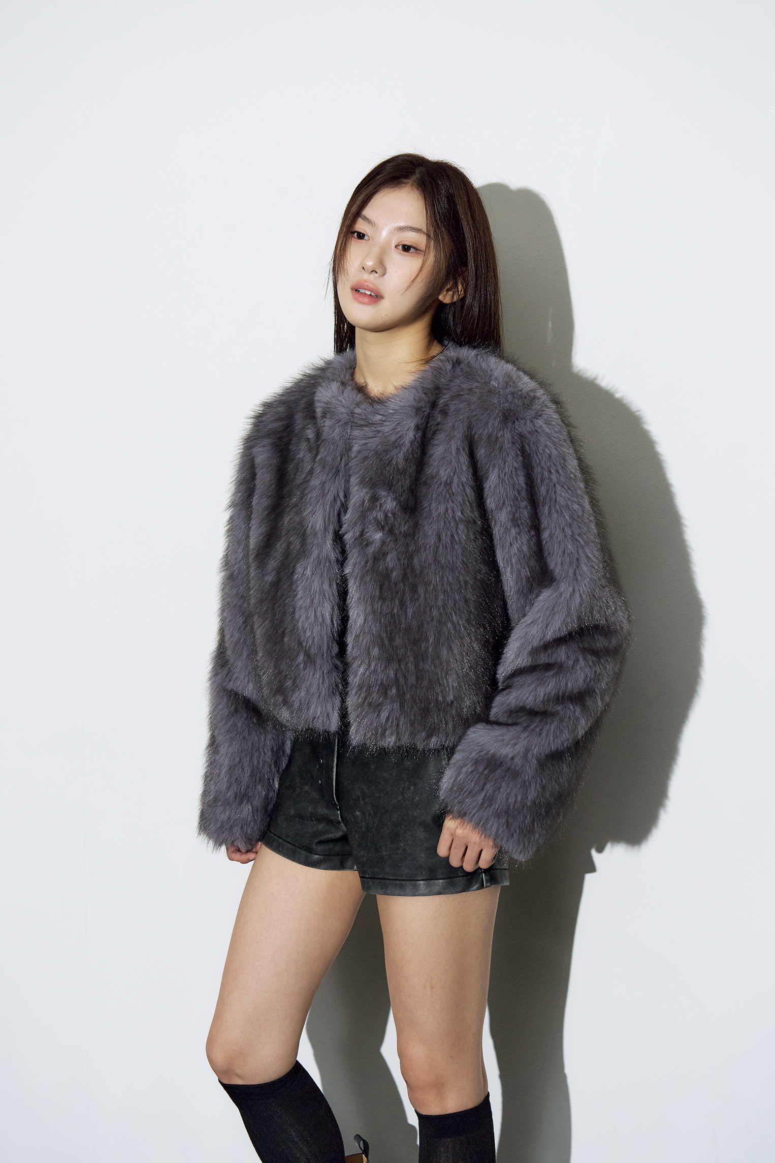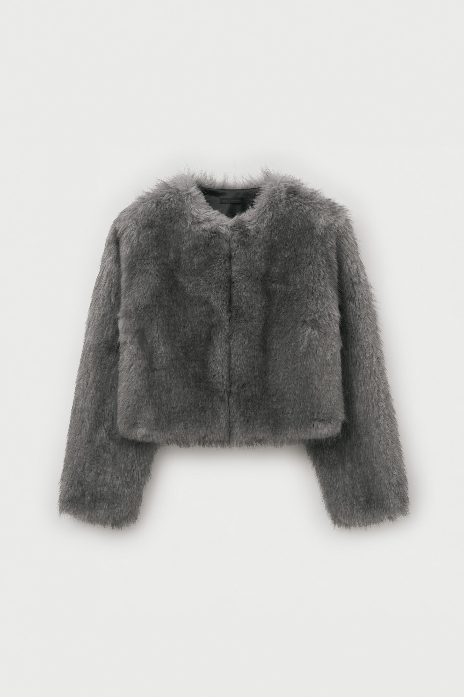 - 트렌디한 무드를 더하는 숏 기장의 칼라리스 퍼 코트입니다.