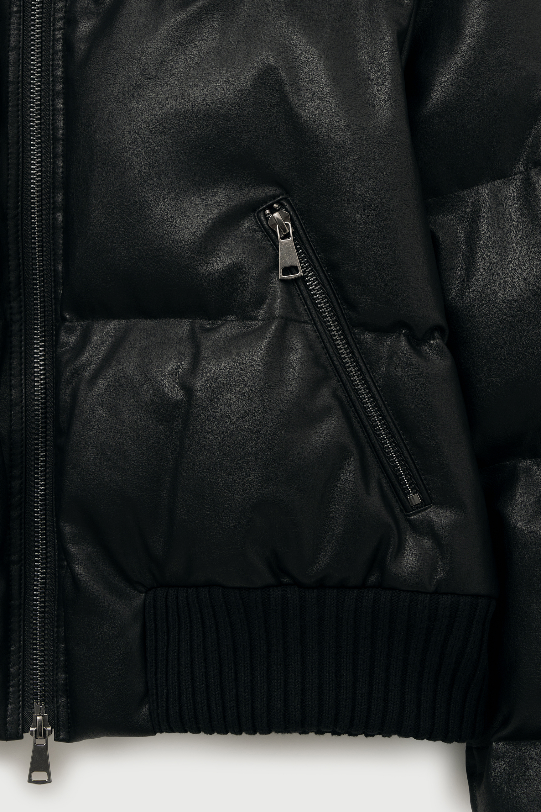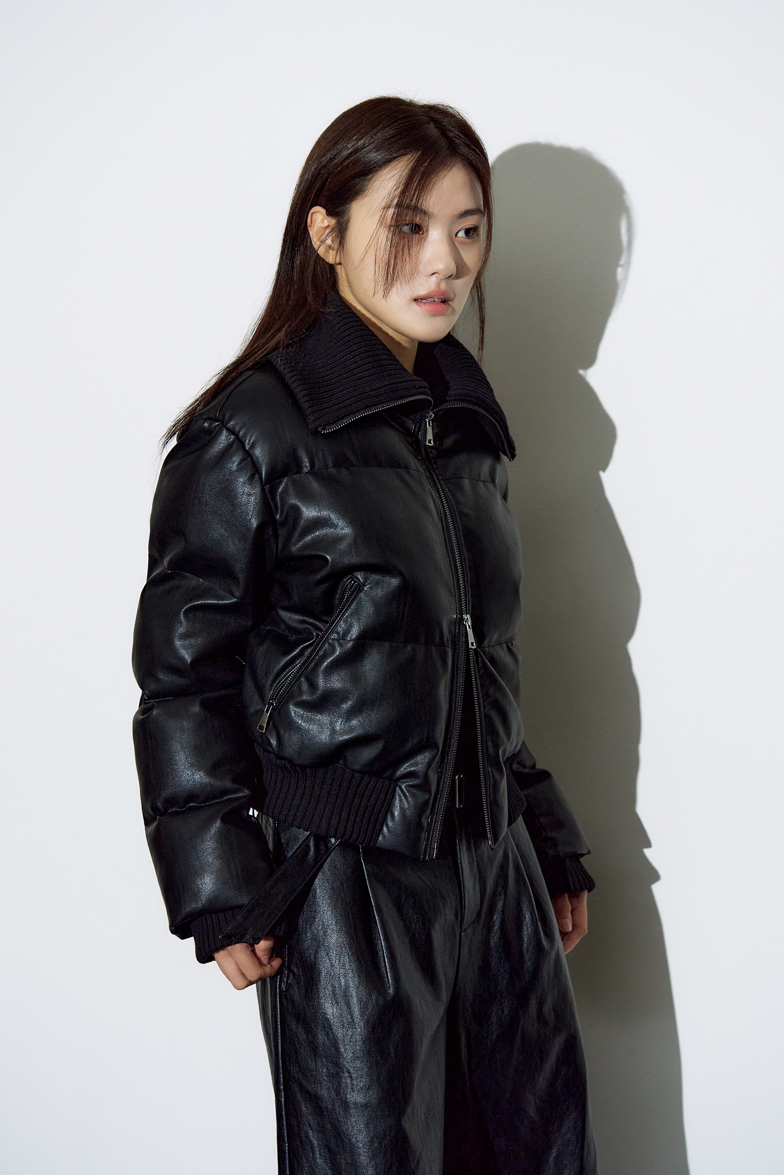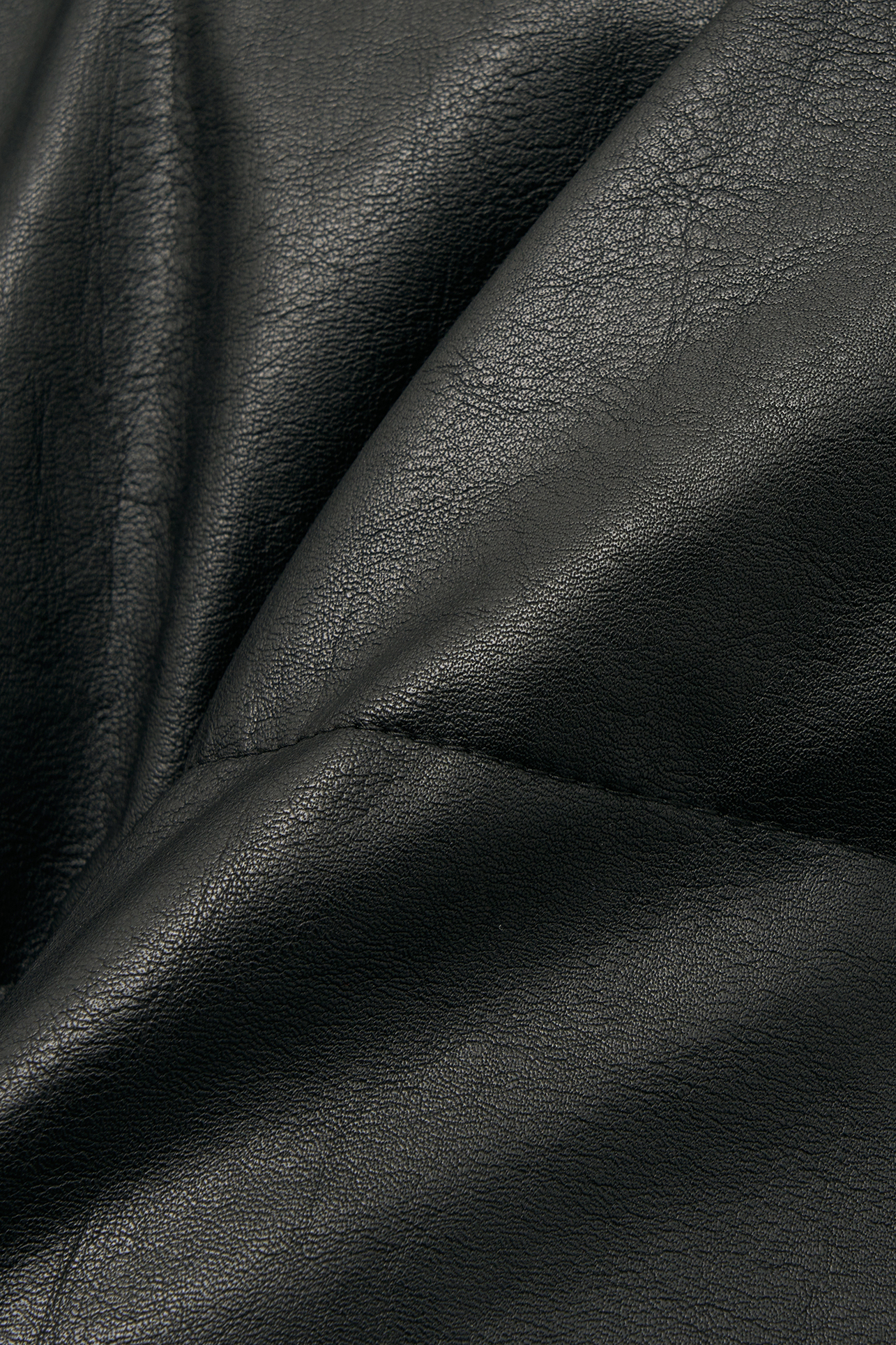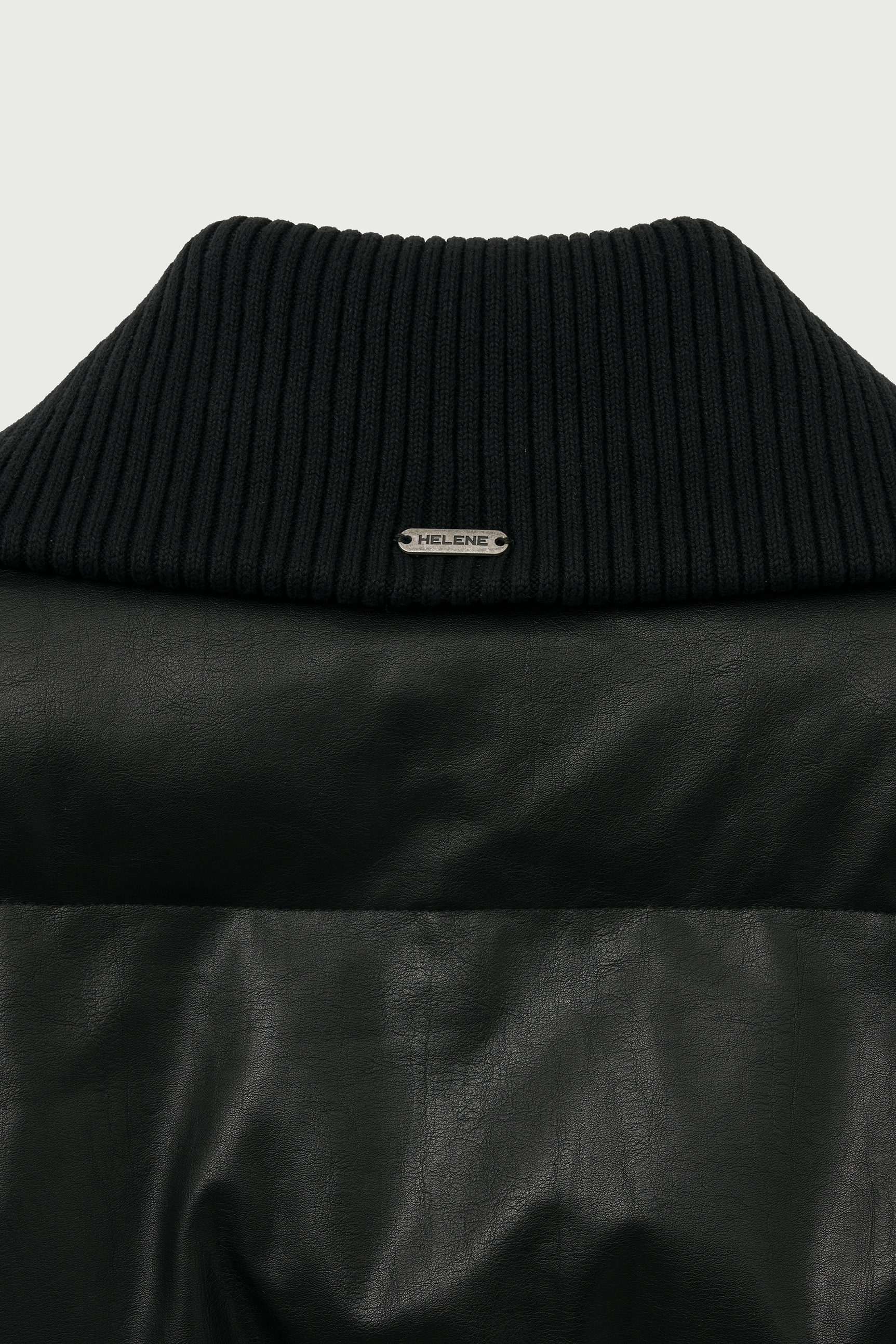 - 탄탄한 립 조직의 하이넥 카라가 더해진 레더 웰론 점퍼입니다.
