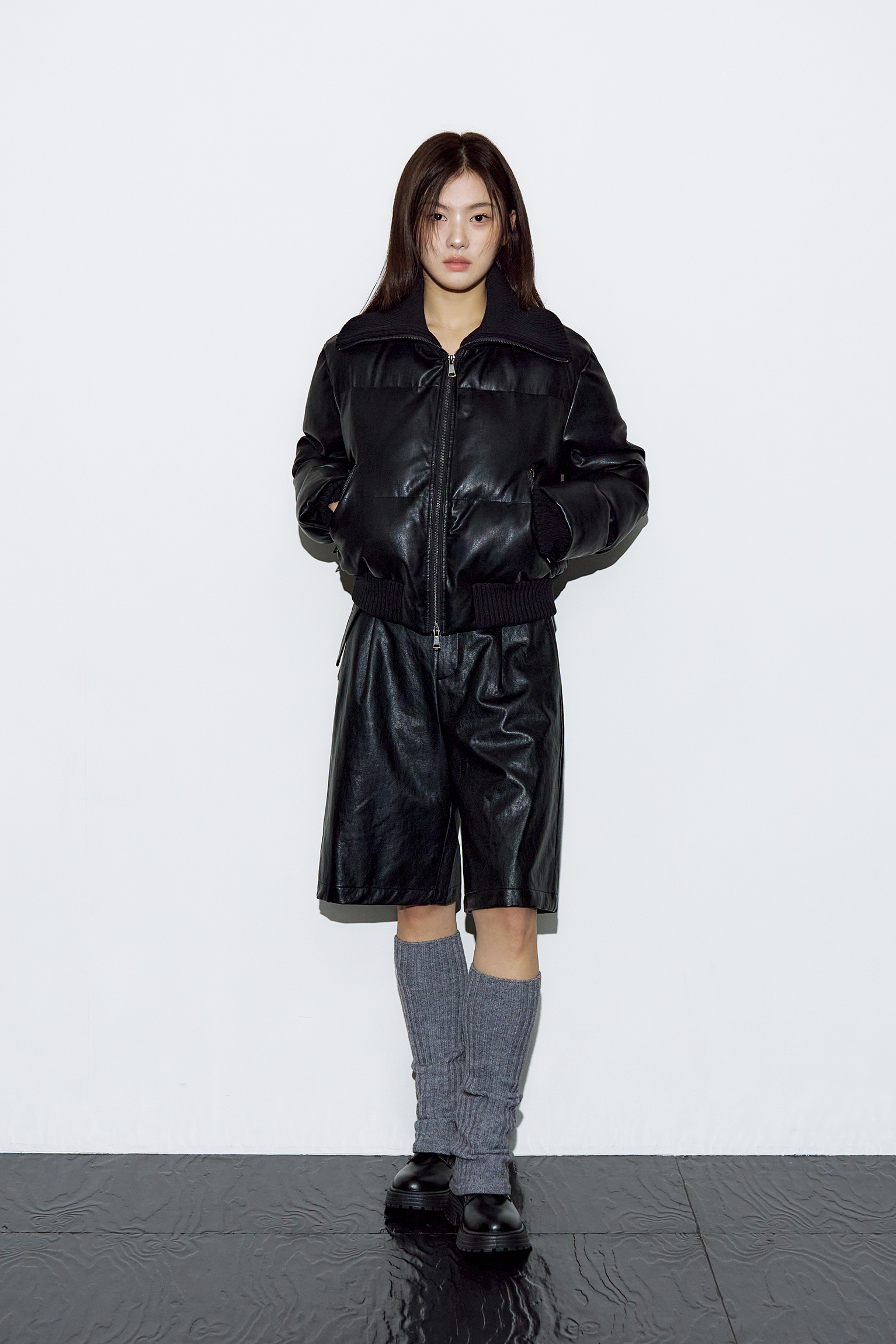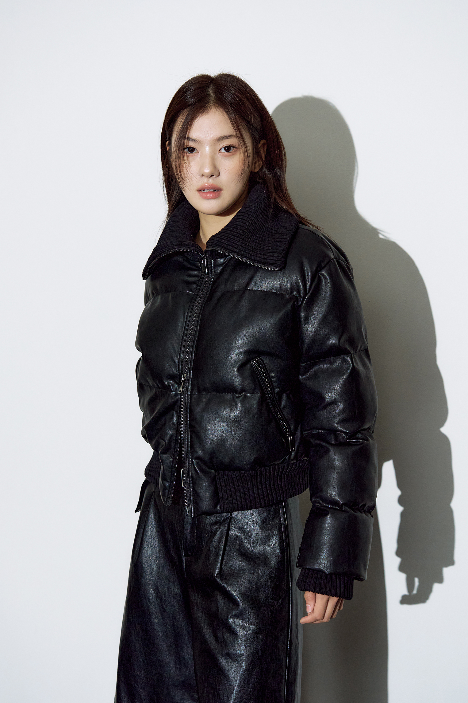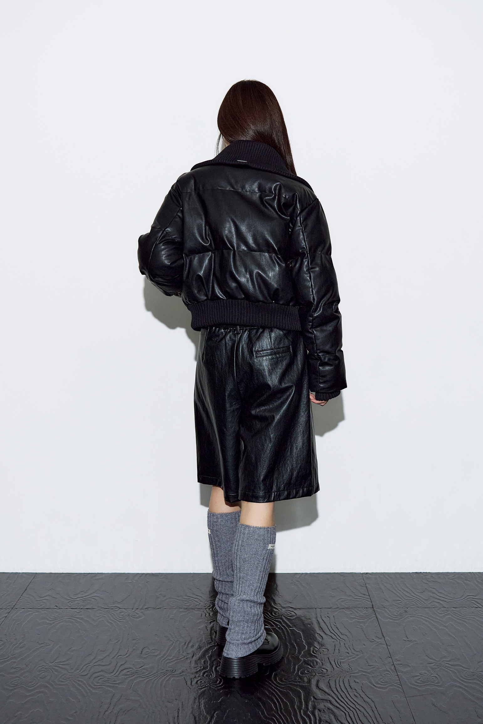 레더 리브드 칼라 웰론 점퍼 [블랙]