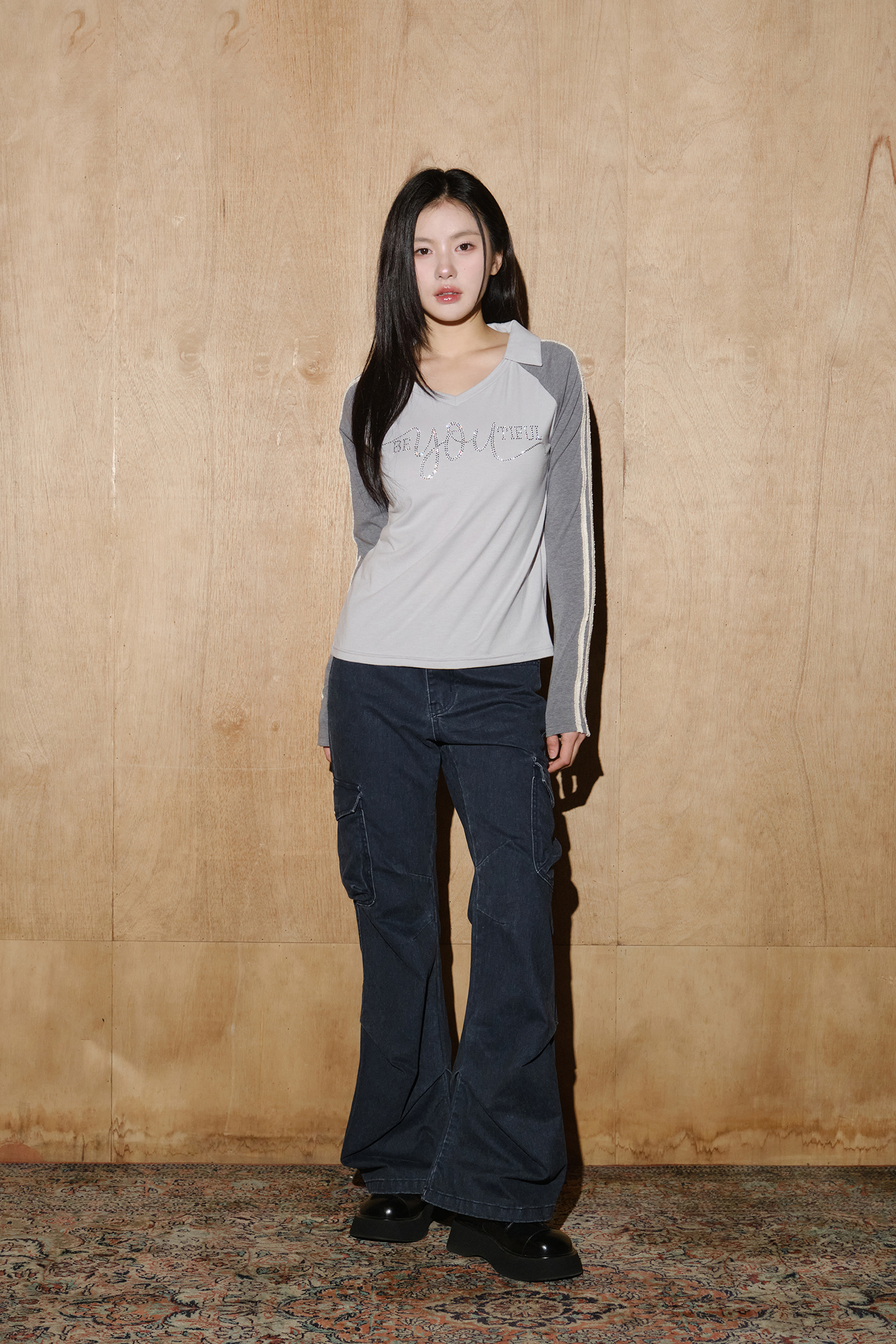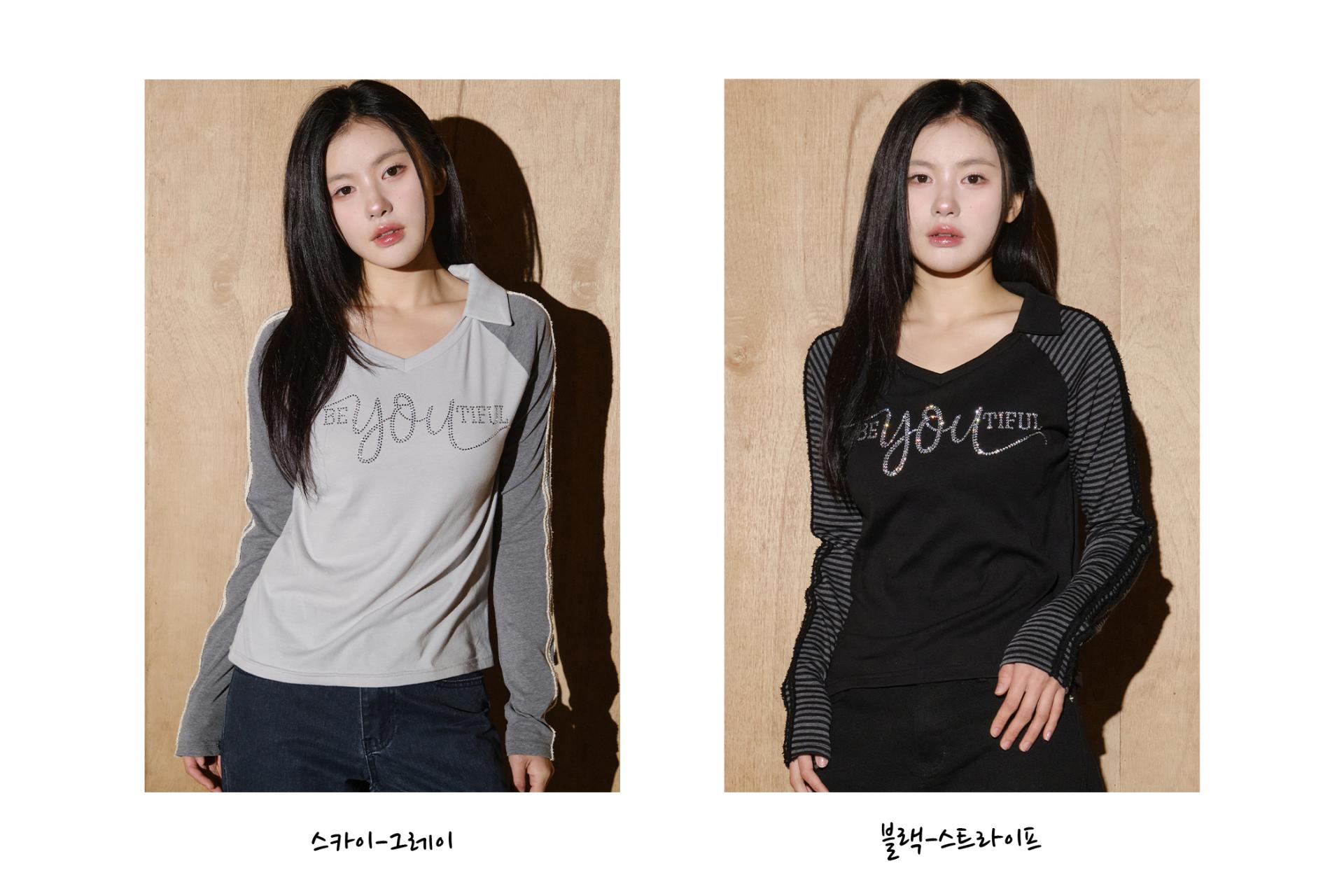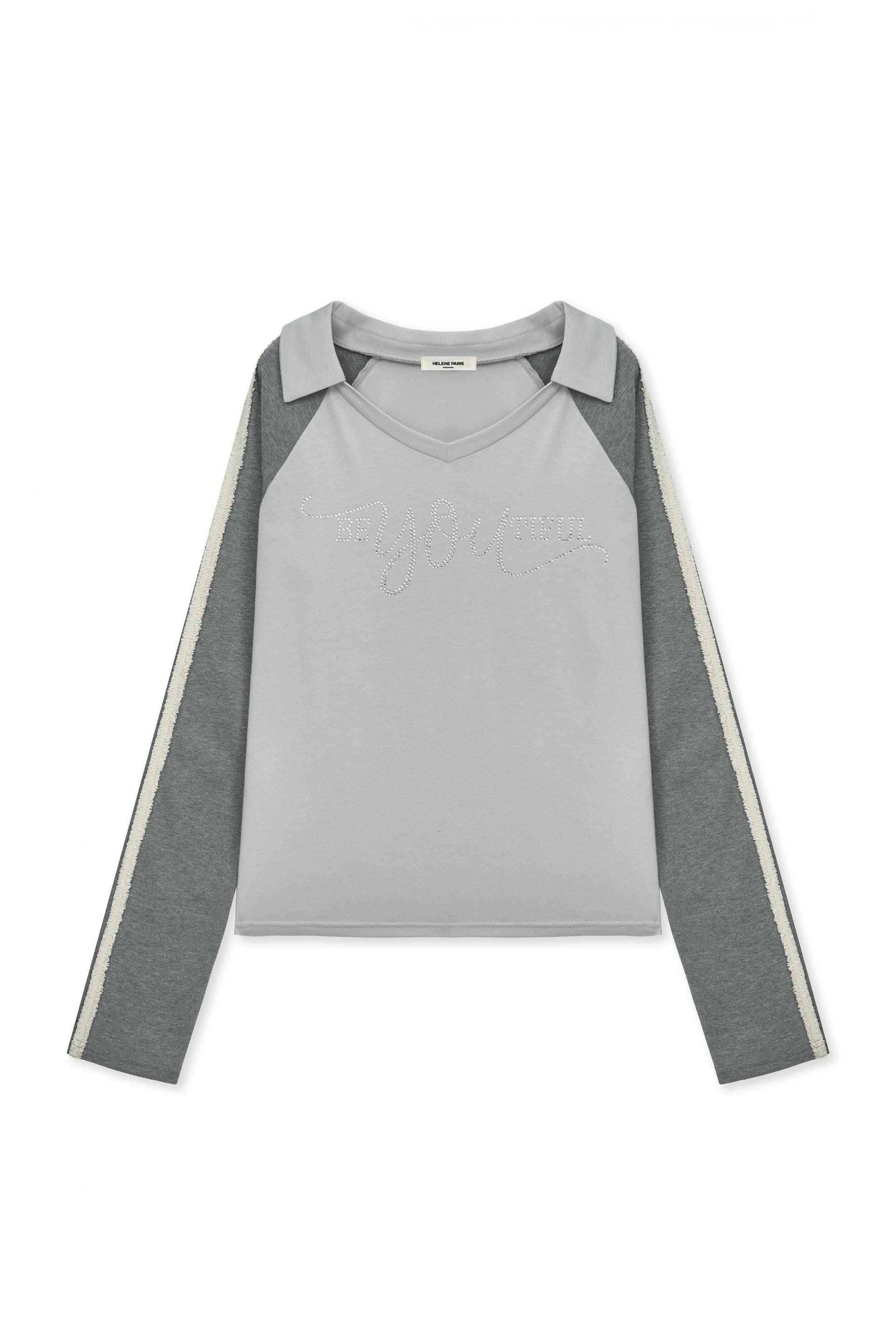 - 소매 테잎 배색 디테일과 큐빅 레터링 포인트를 더한 스포츠 카라 롱 슬리브입니다.