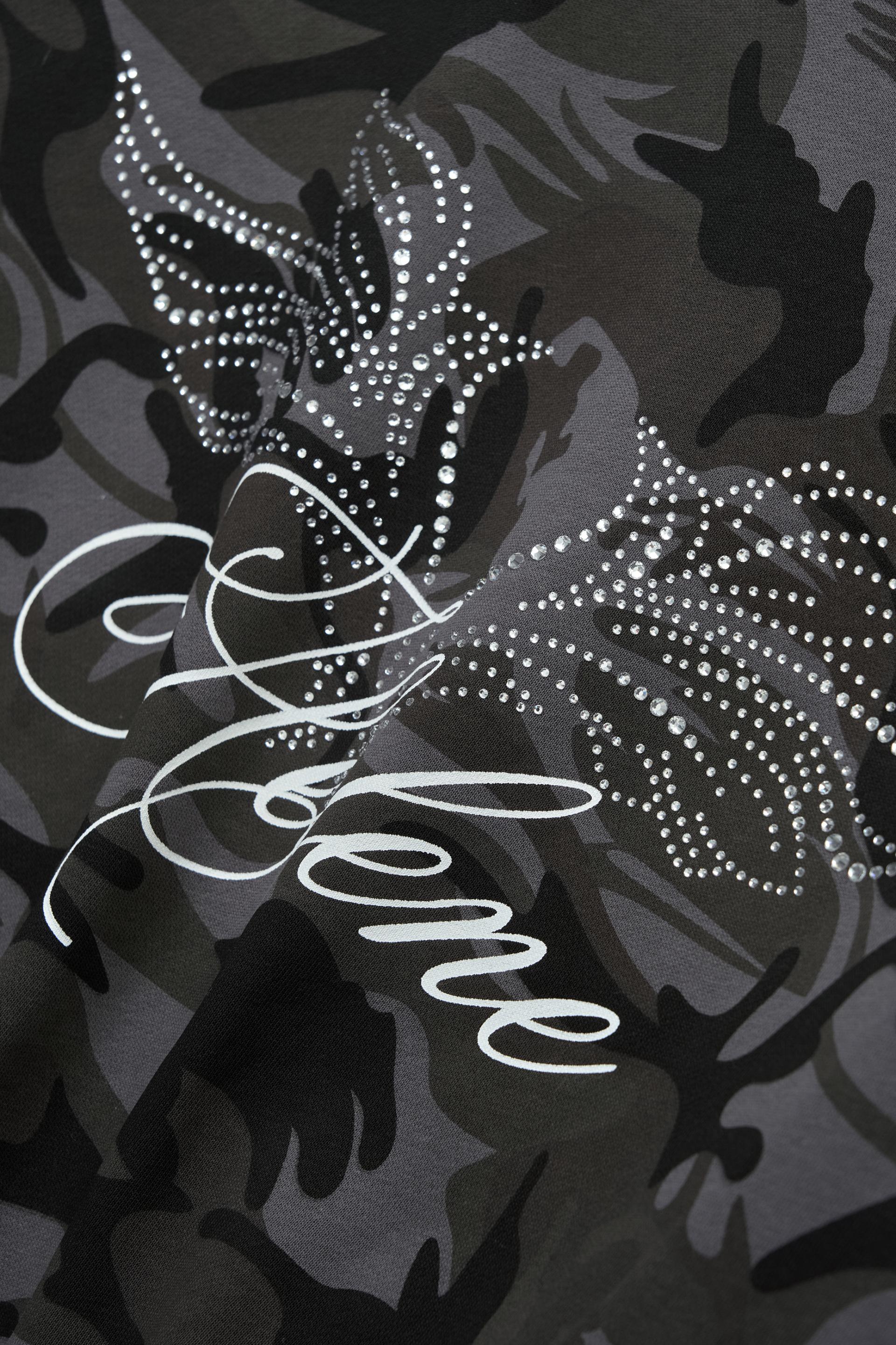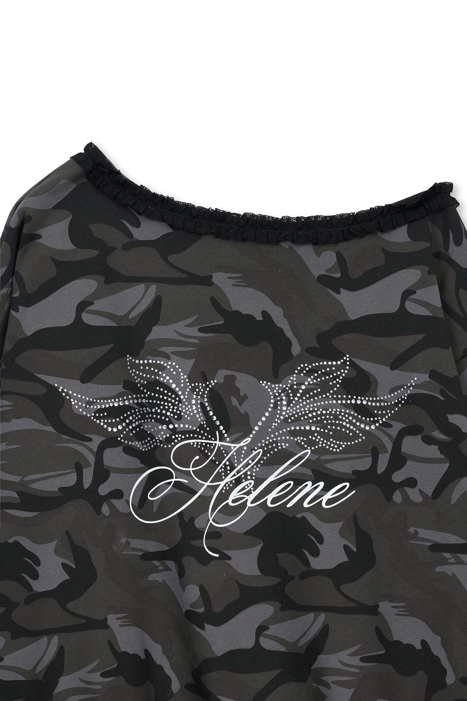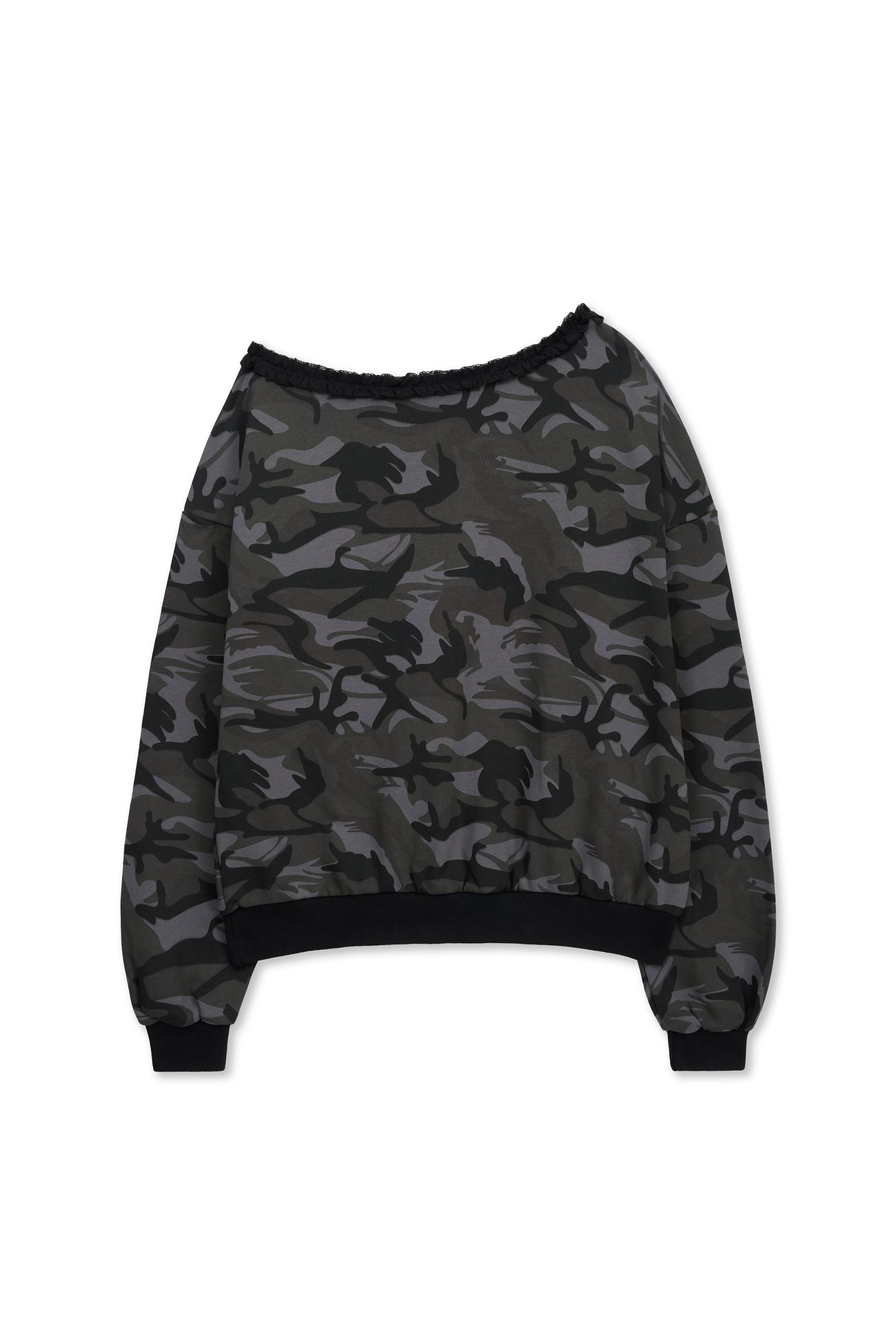- 카모플라쥬 패턴과 배색되는 넥 라인 블랙 프릴 레이스 디테일을 더했습니다.