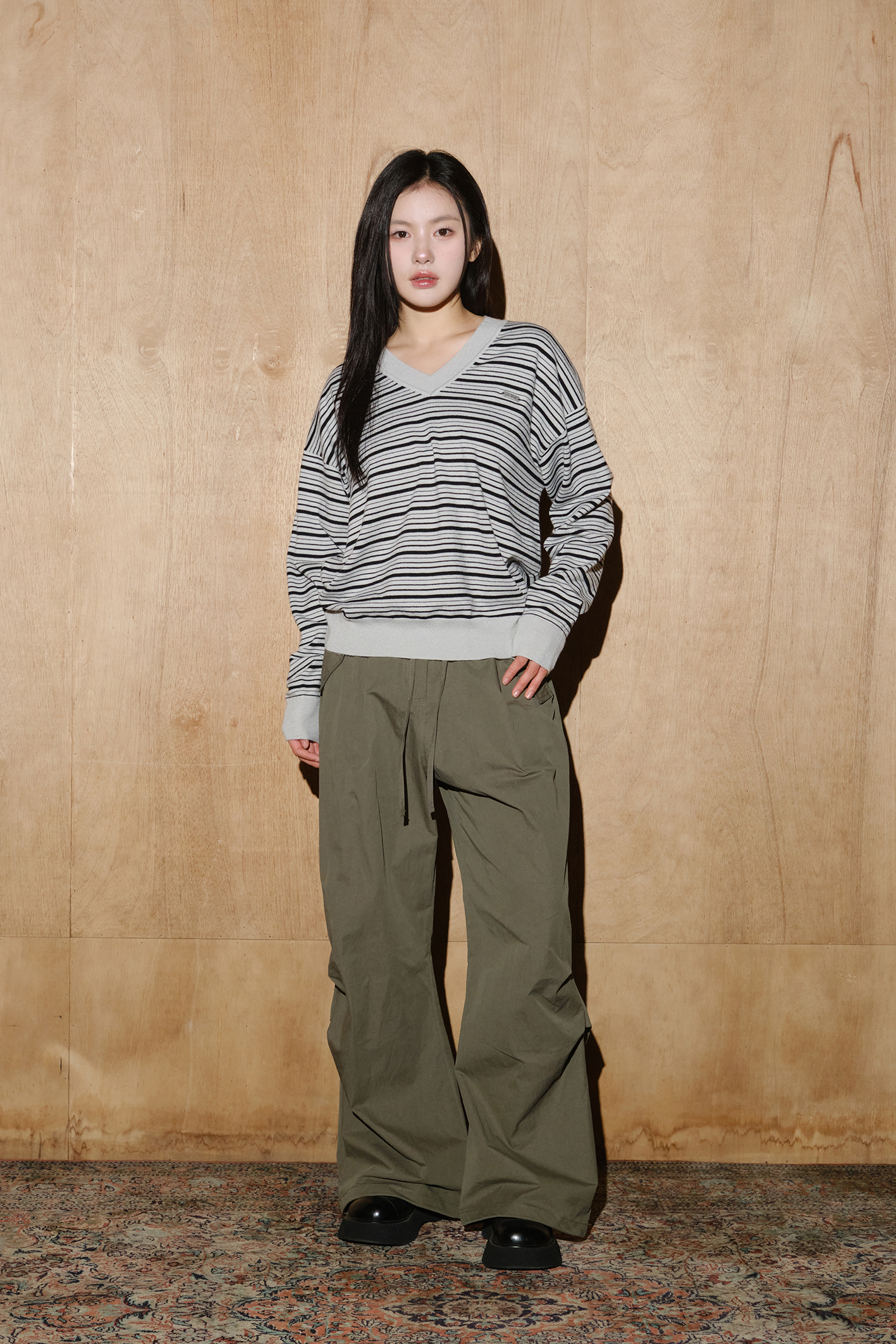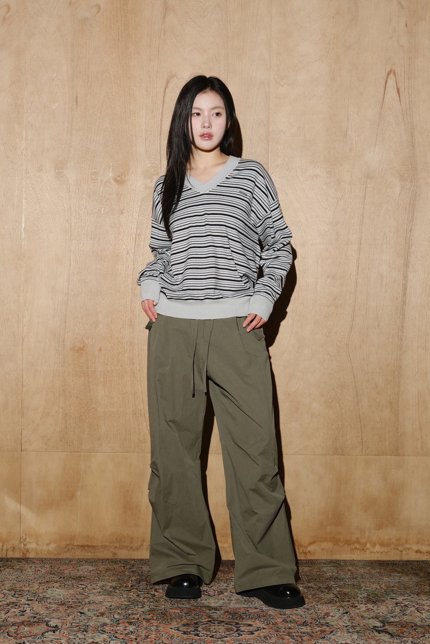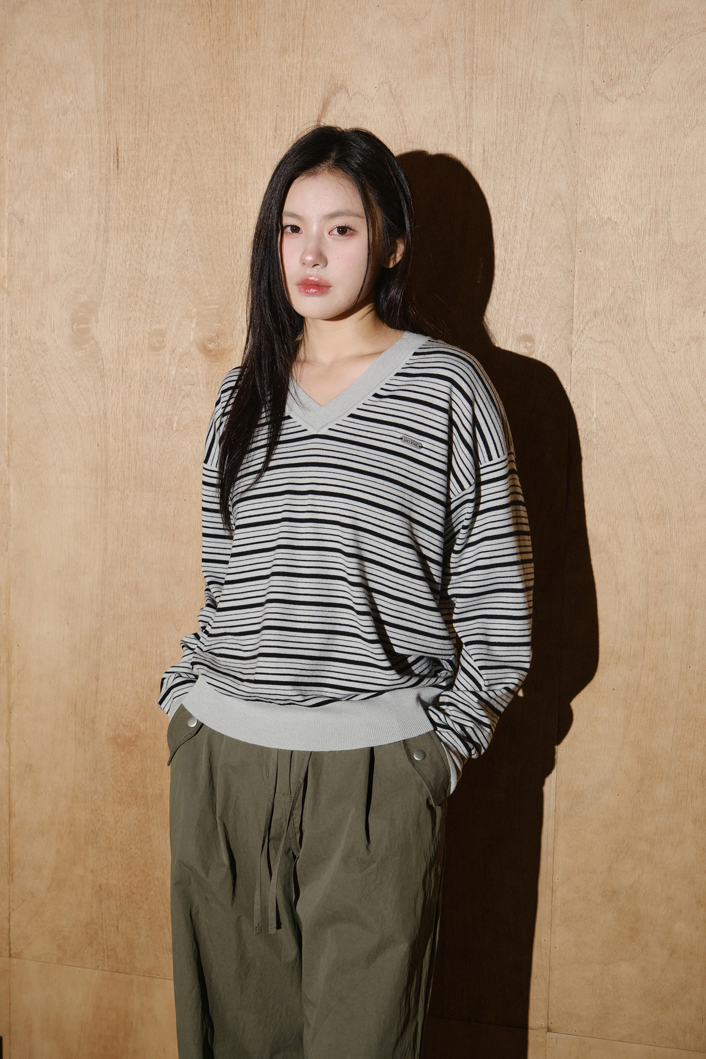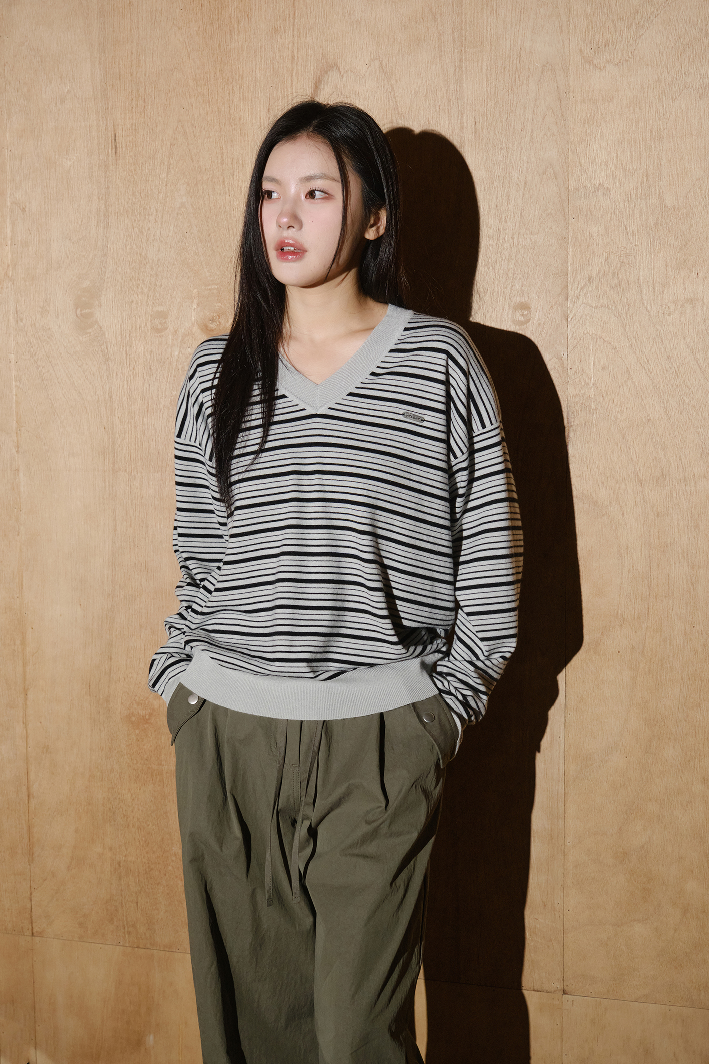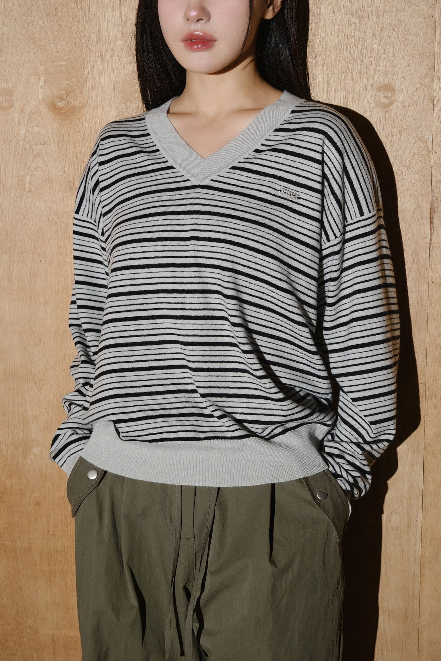 울 블렌드 캐롤 스트라이프 브이넥 니트 [실버그레이-블랙]