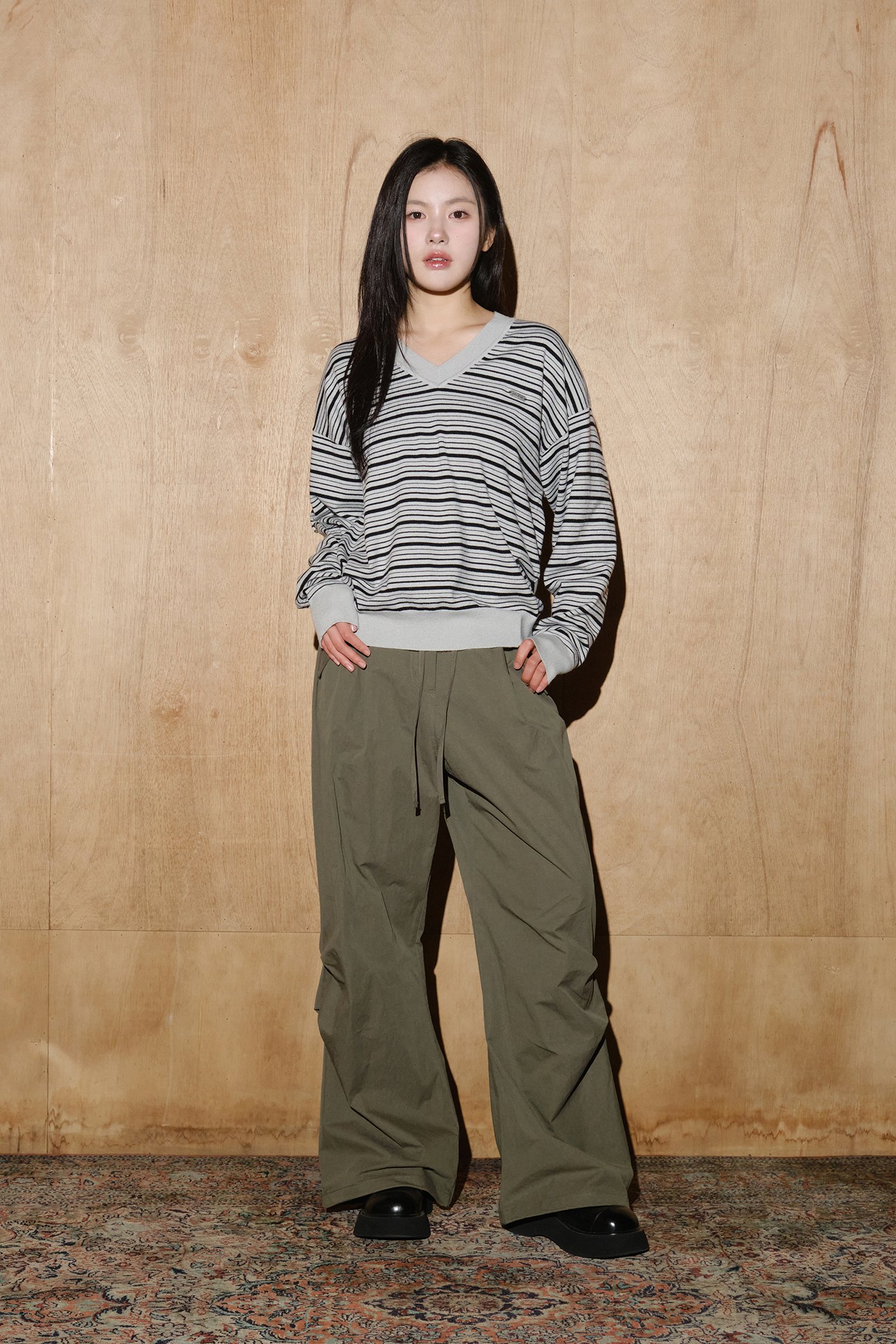 - 스트라이프 패턴이 돋보이는 루즈핏 V넥 울 니트입니다.