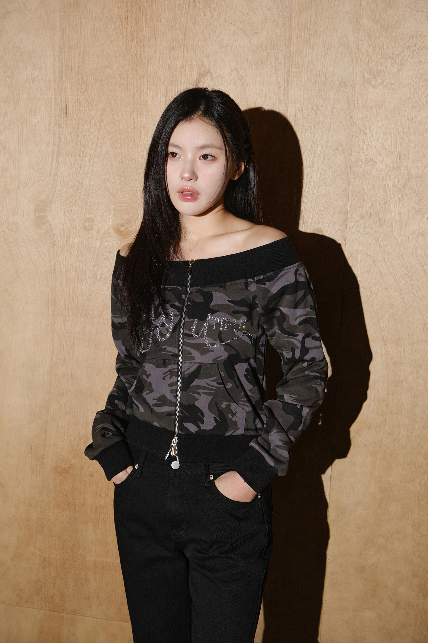 뷰티플 오프숄더 스웻 집업 [카모플라쥬]