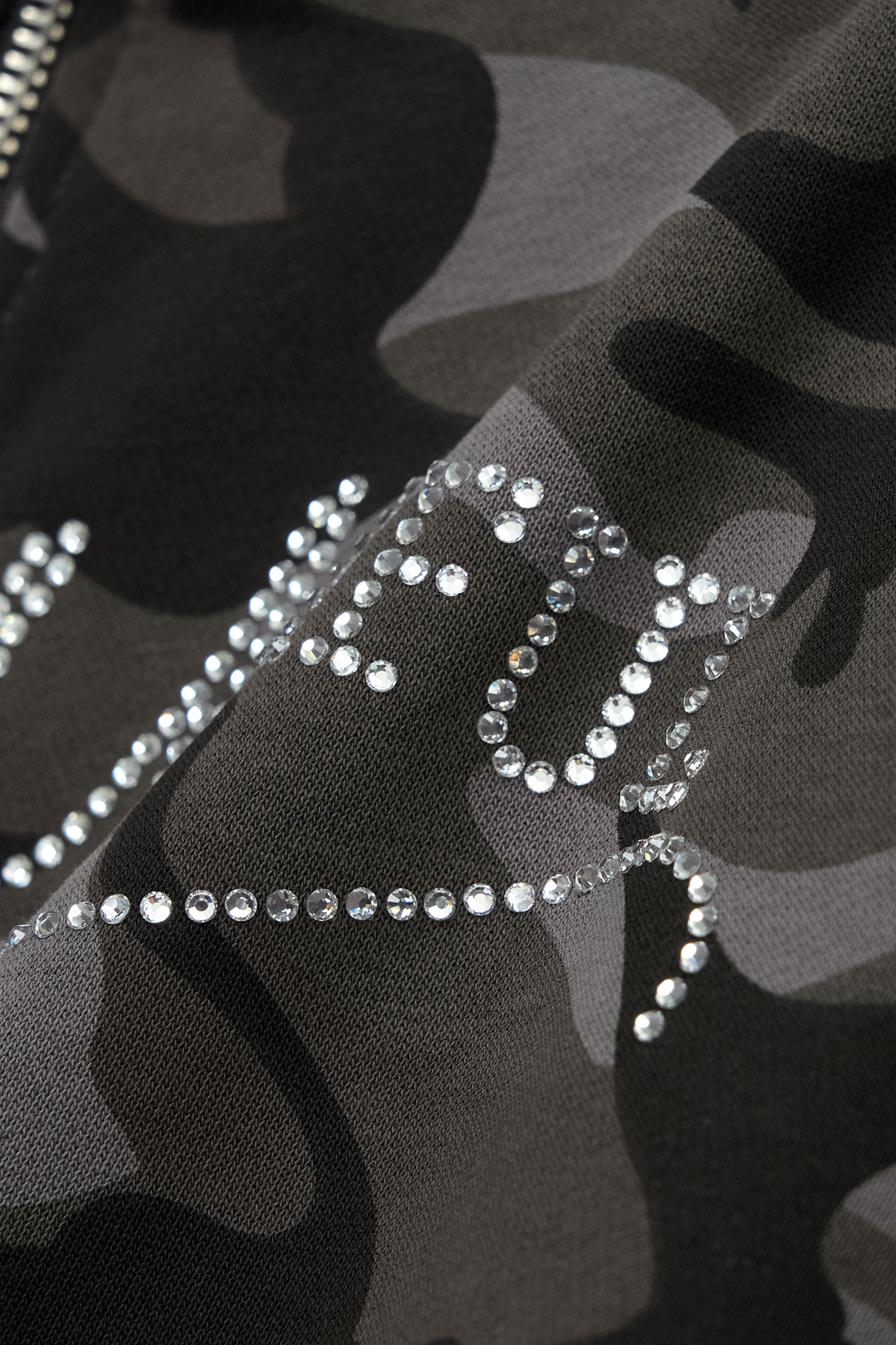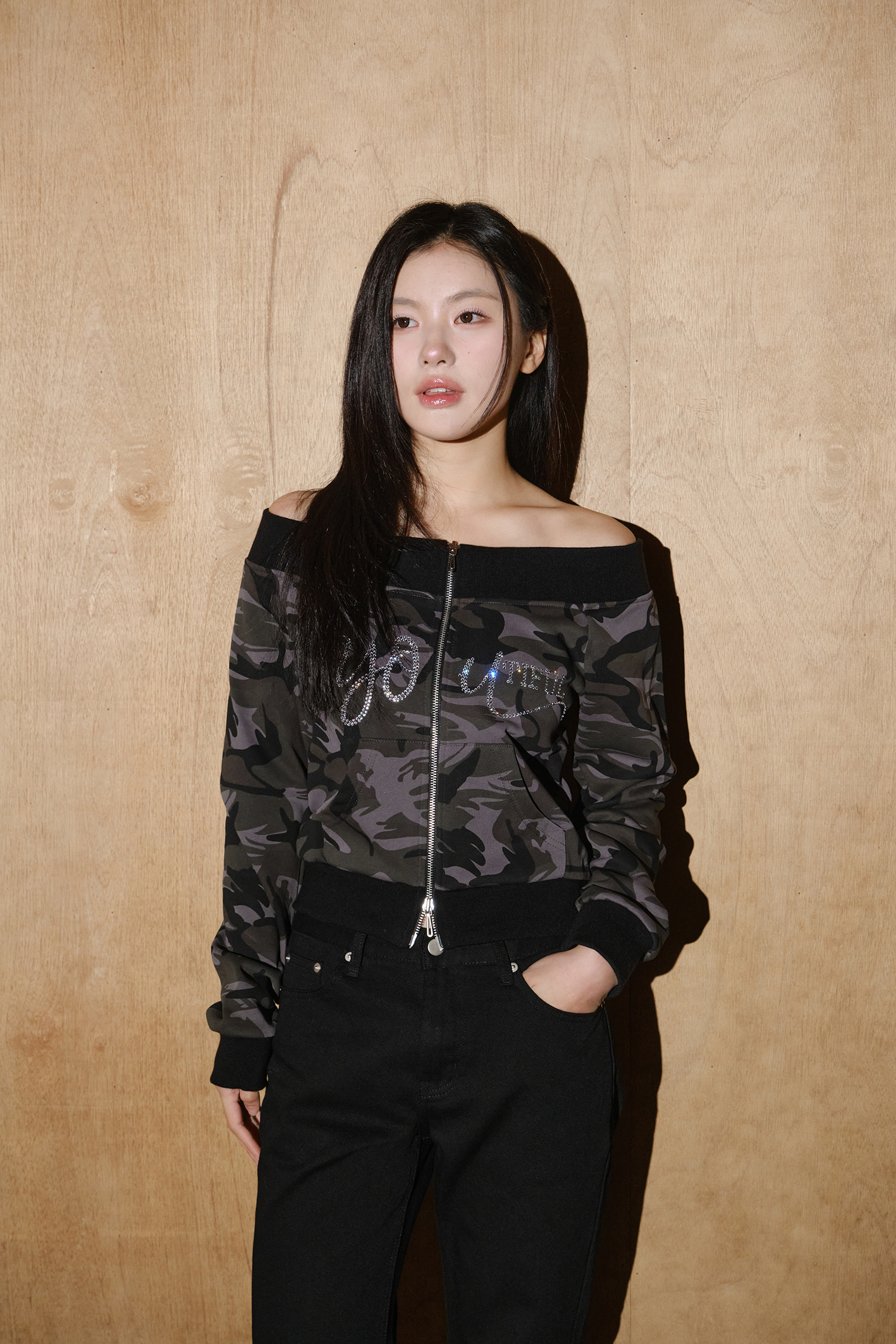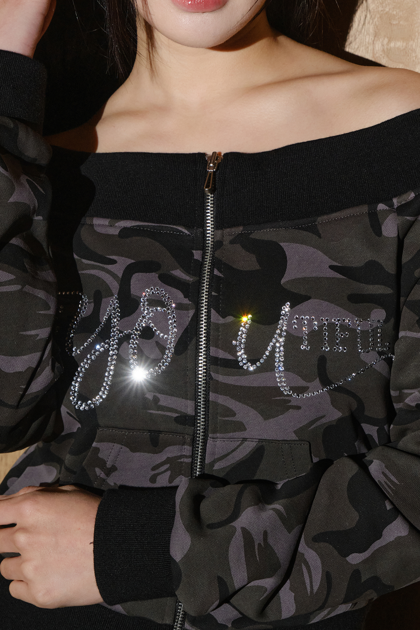 - 카모플라쥬 패턴에 큐빅 디테일을 더한 오프숄더 스웻 집업입니다.