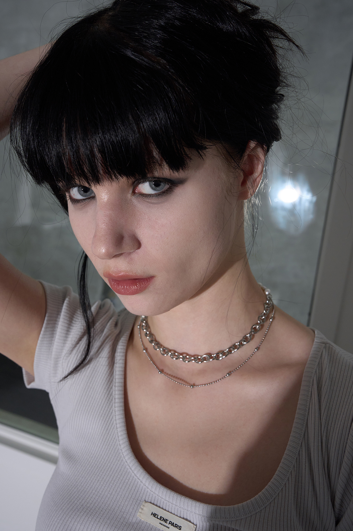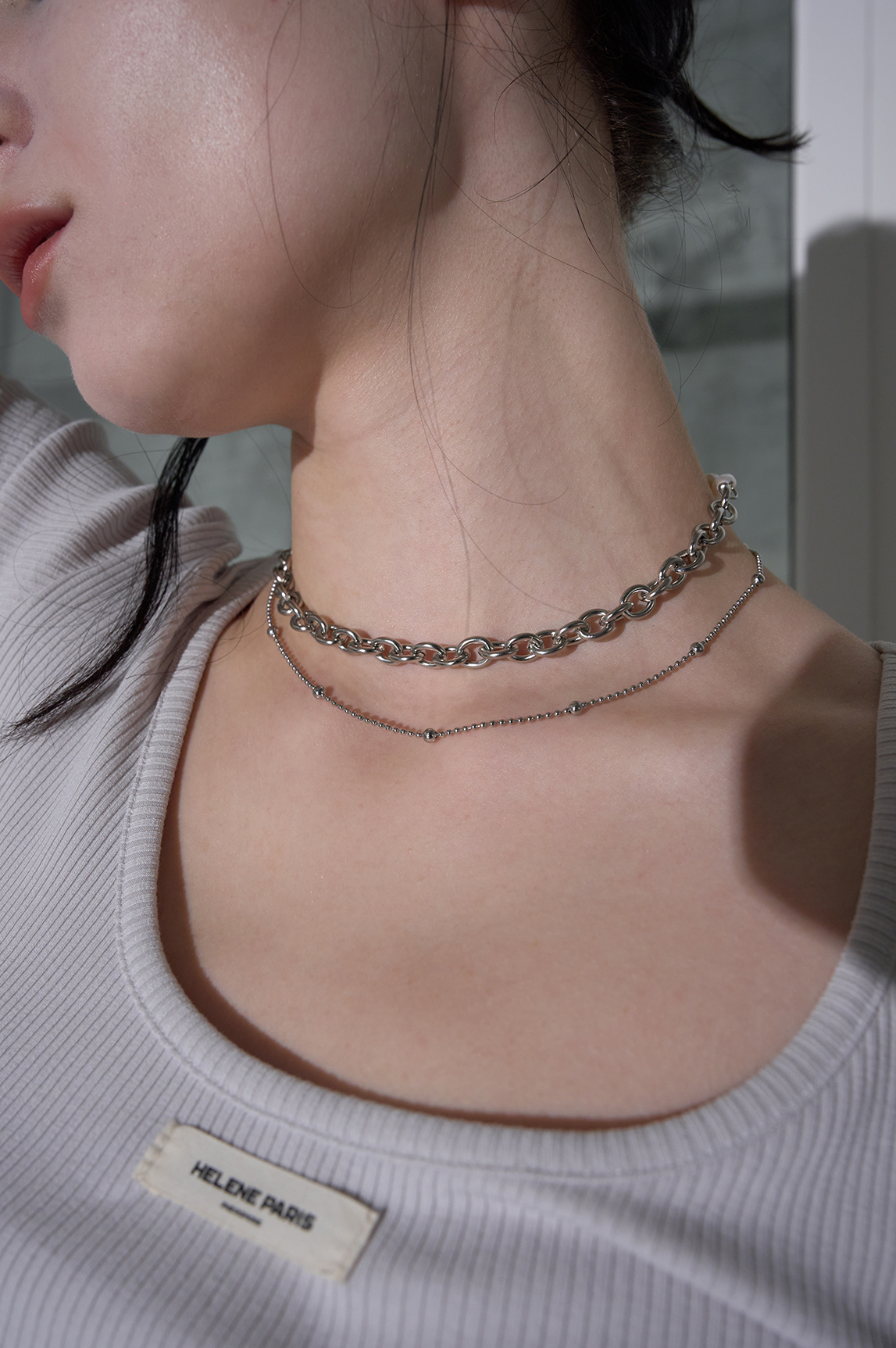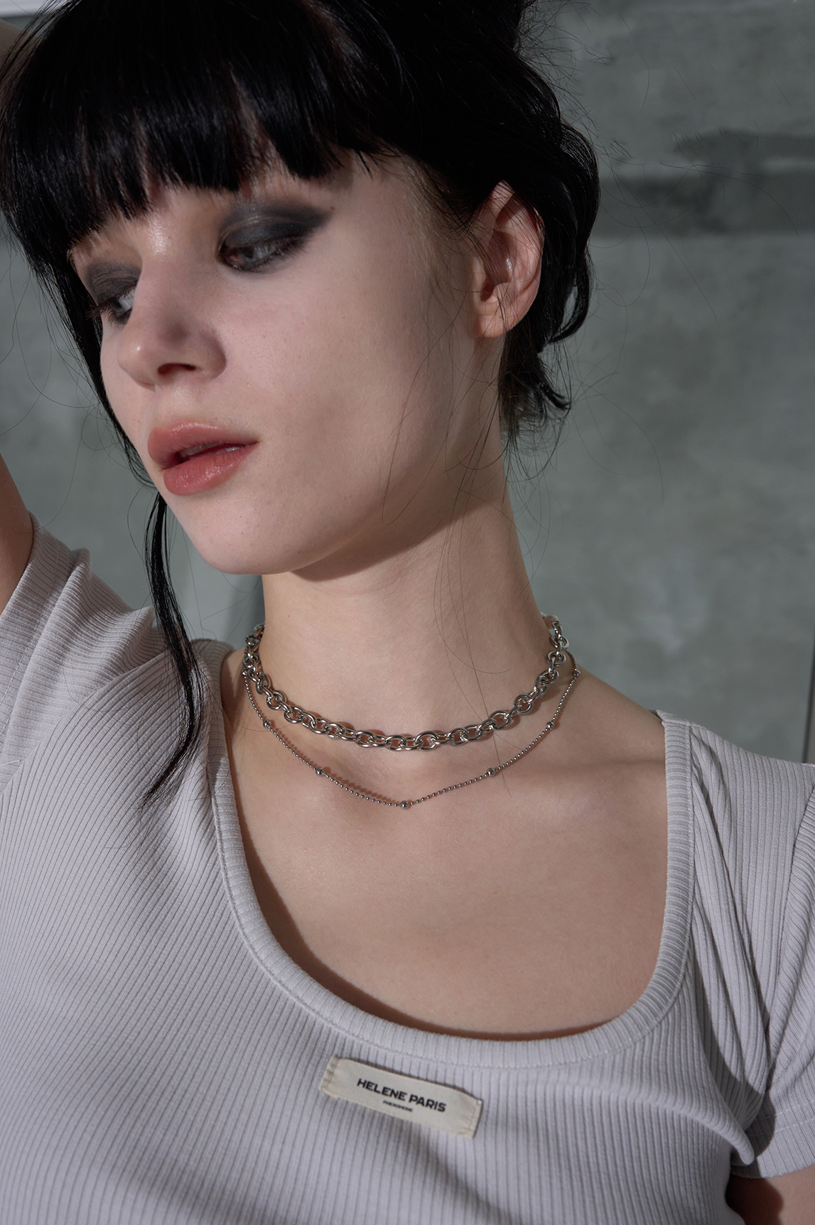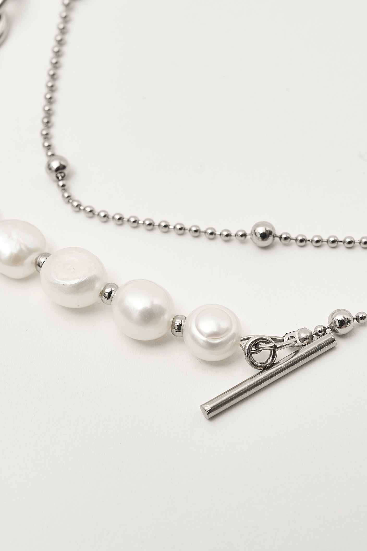 - 실버 톤의 체인과 펄 장식을 레이어드하여 연출한 아이템