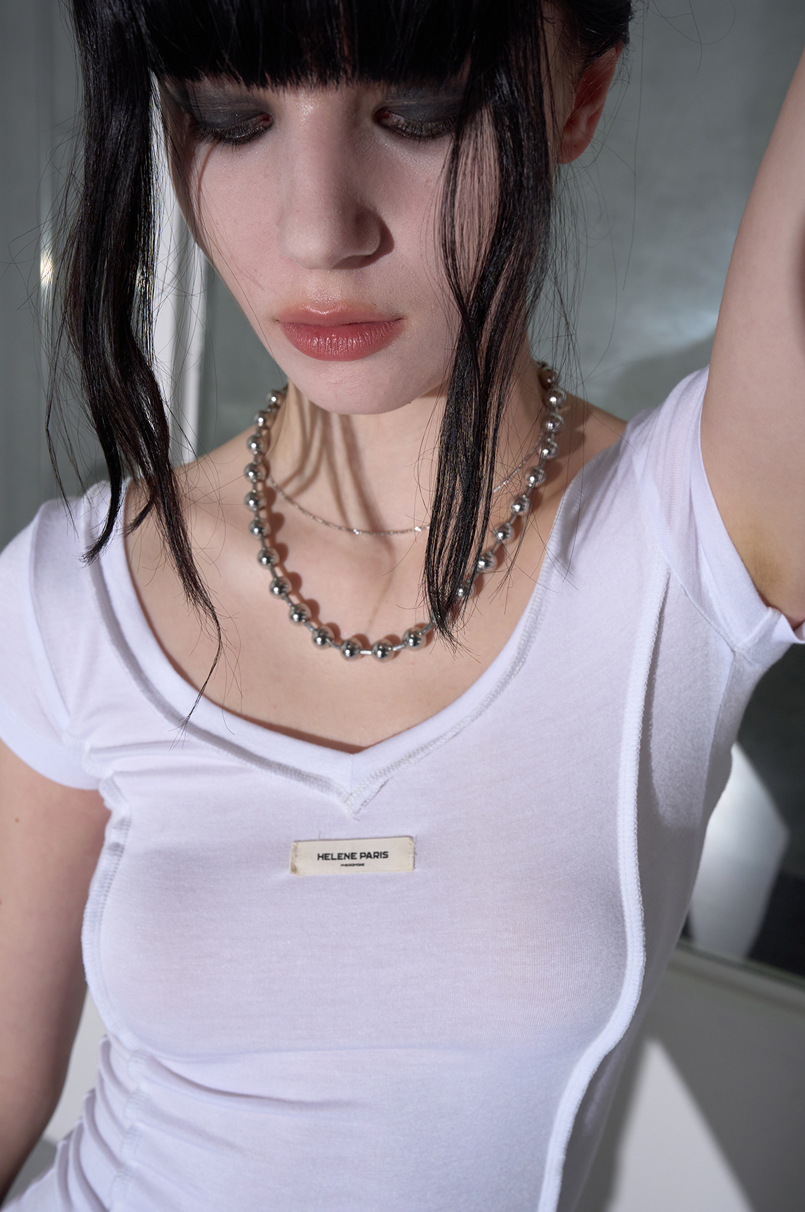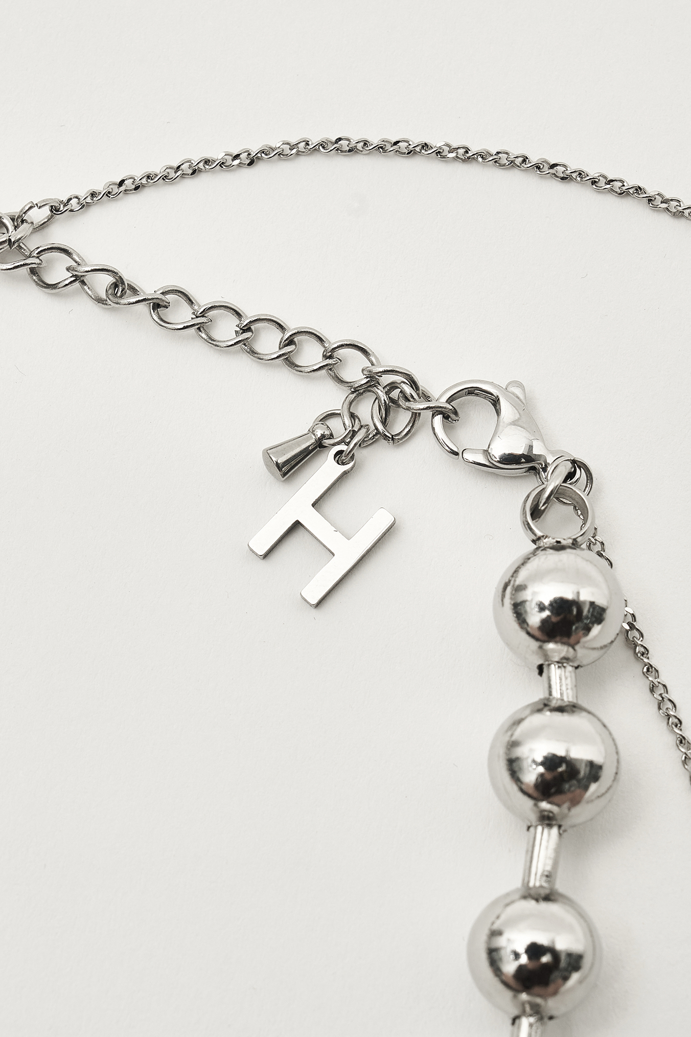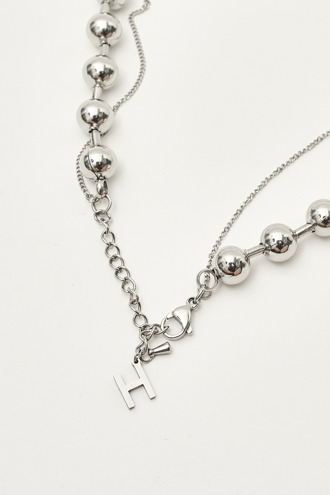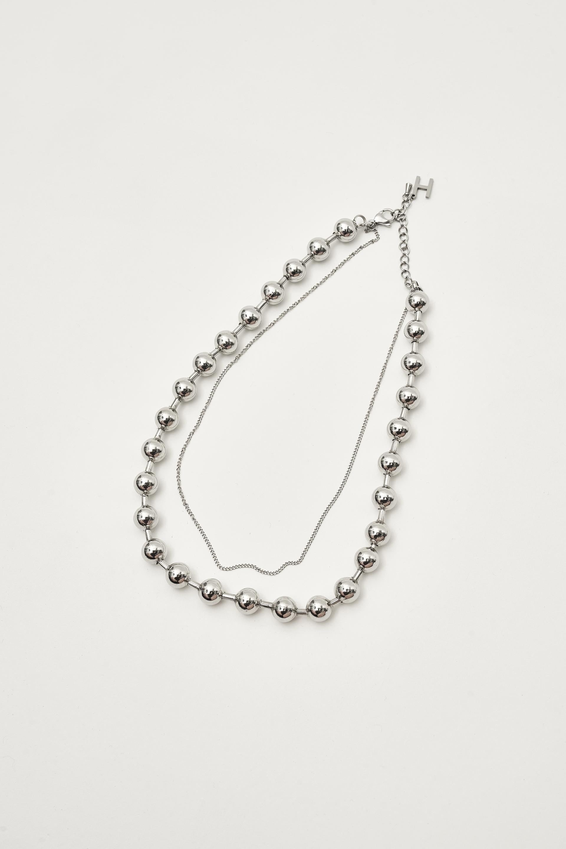 - 실버 톤의 메탈 볼과 심플하고 얇은 체인을 레이어드한 아이템
