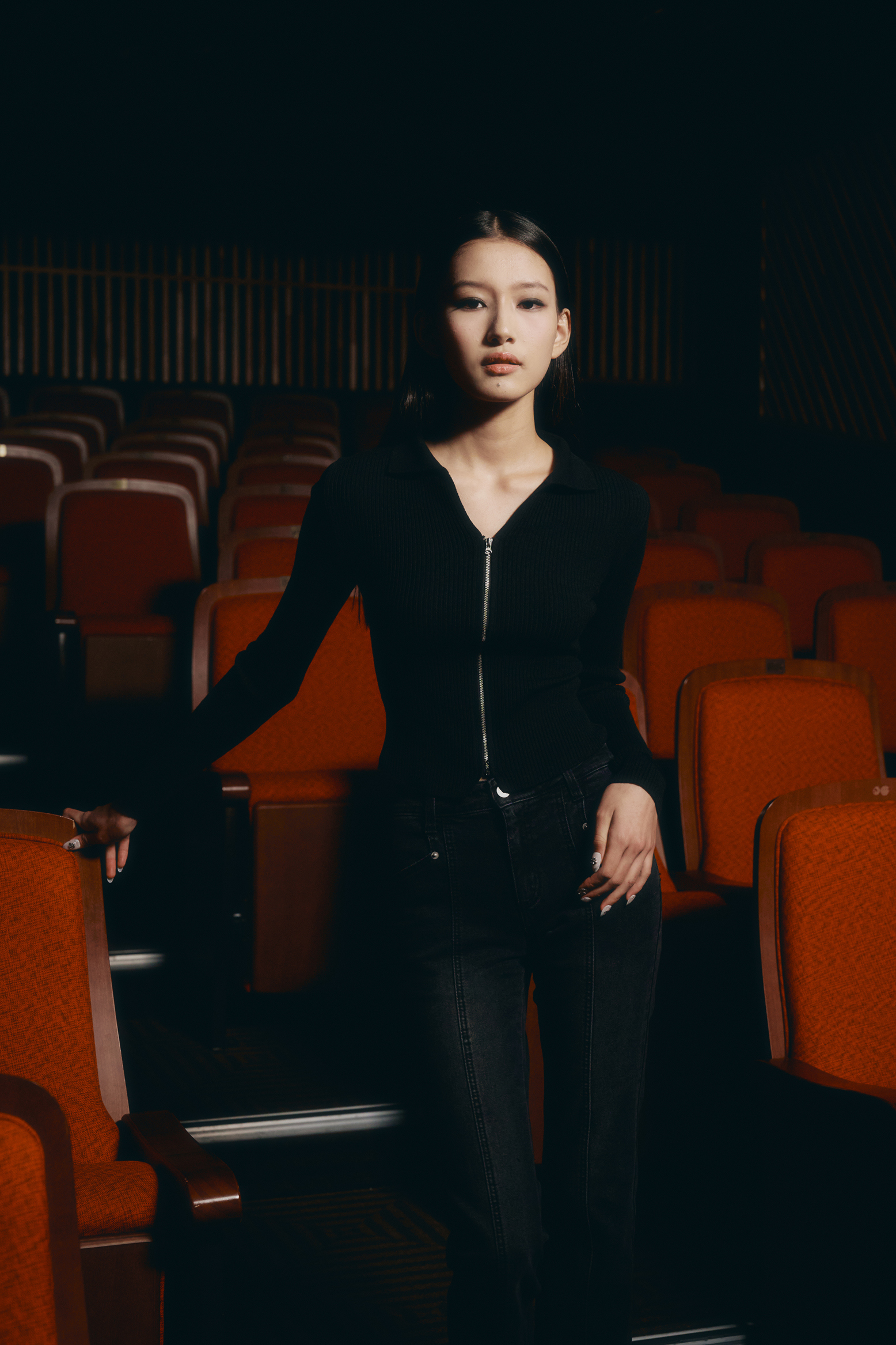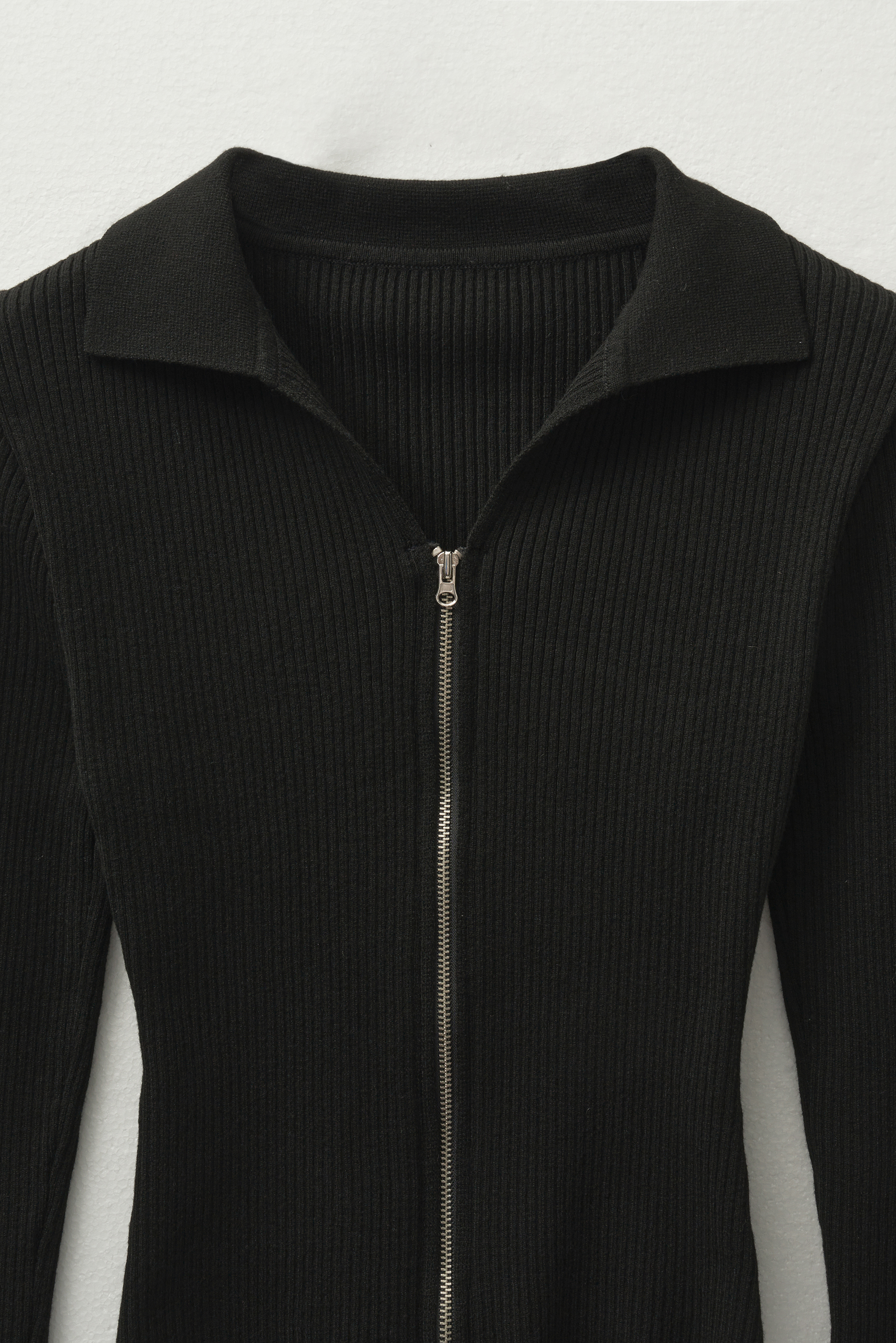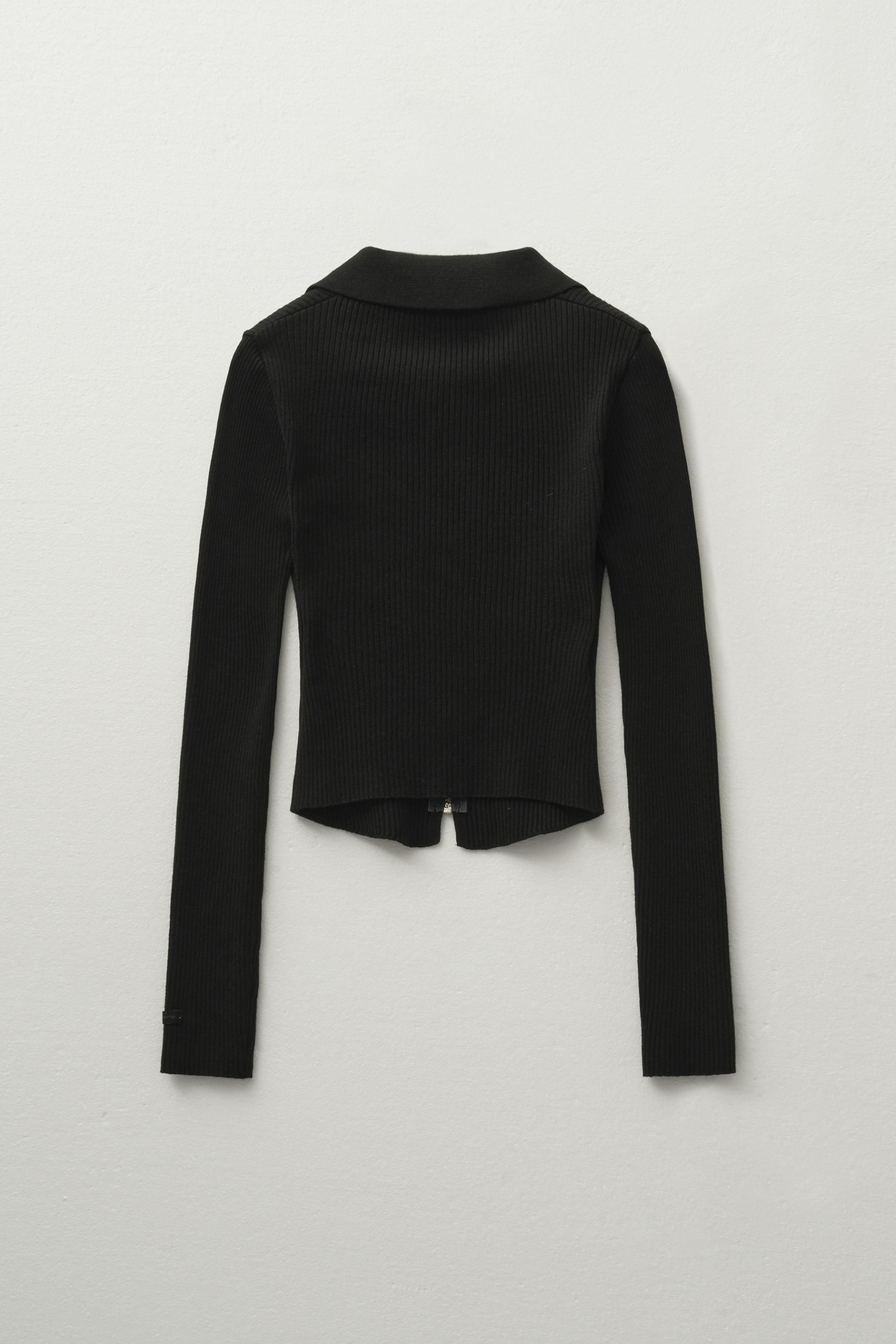 - 적당한 파임의 캐주얼한 카라 디자인과 실버 지퍼 디테일