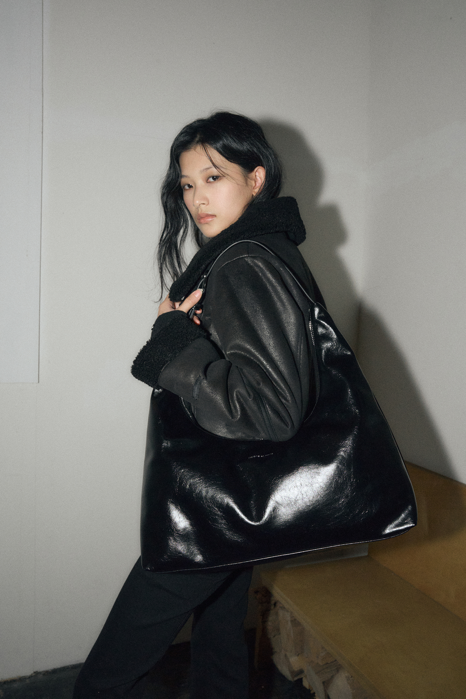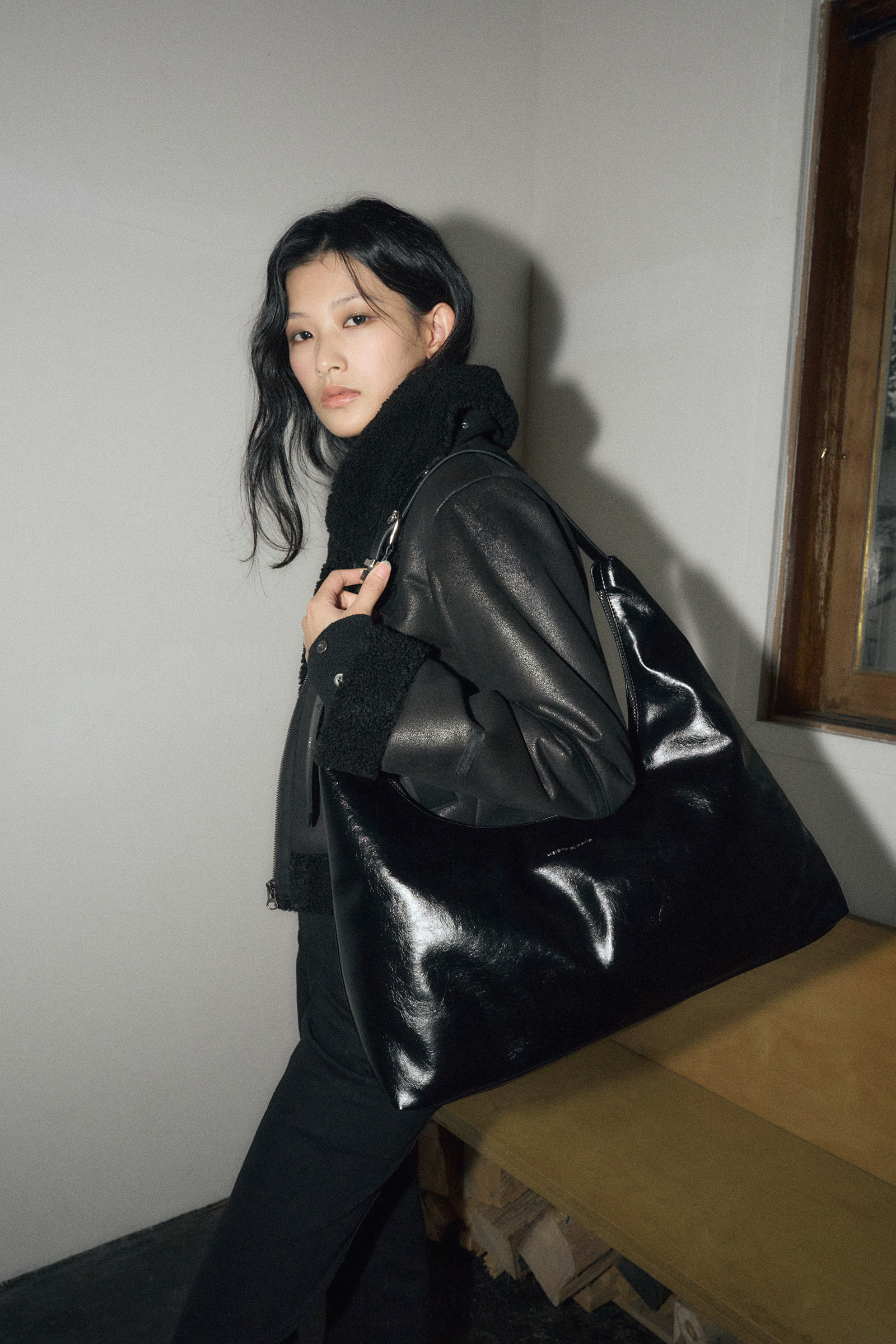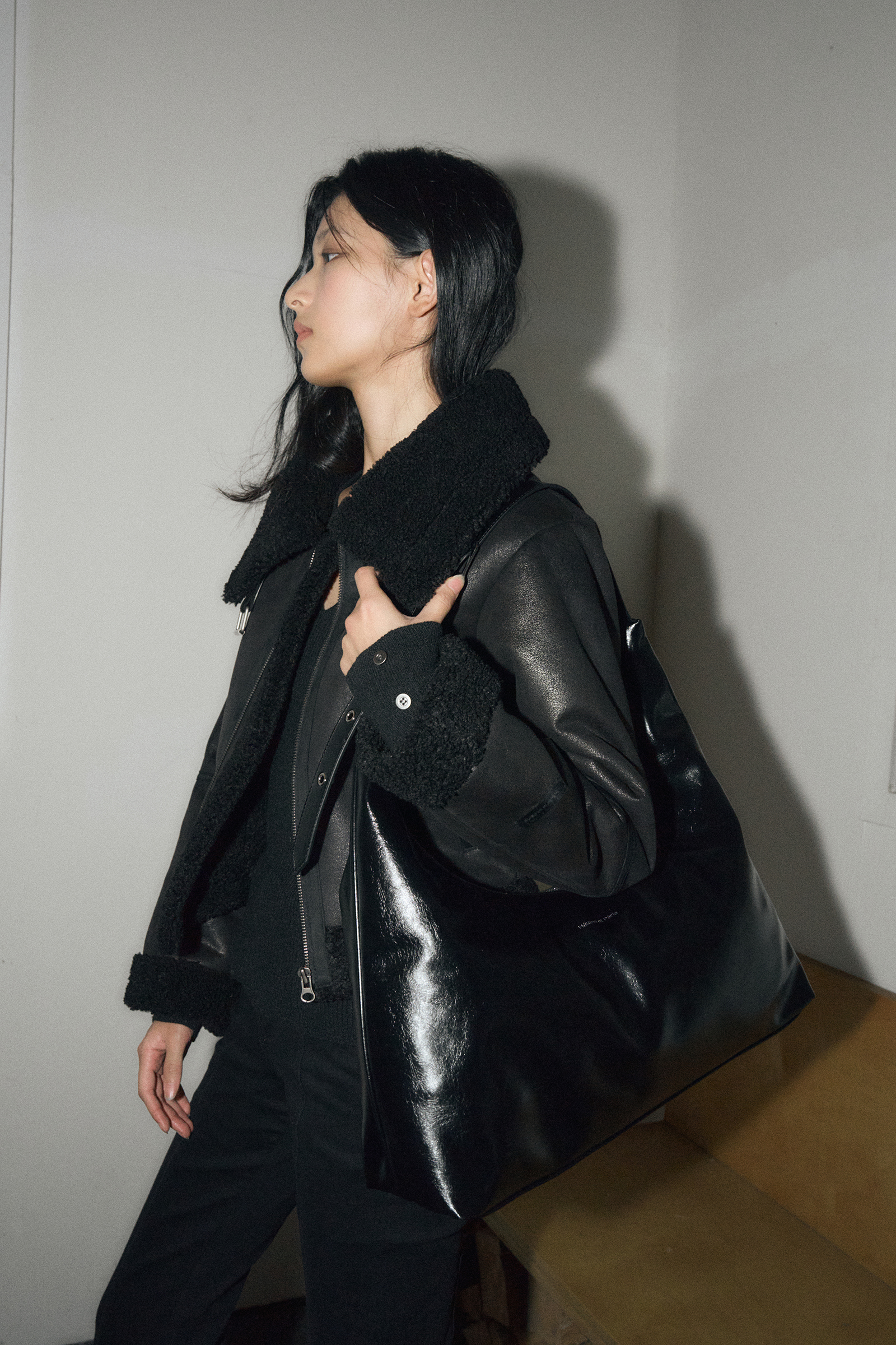 - 제트 블랙에 가까운, 은은한 광택감의 비건 레더