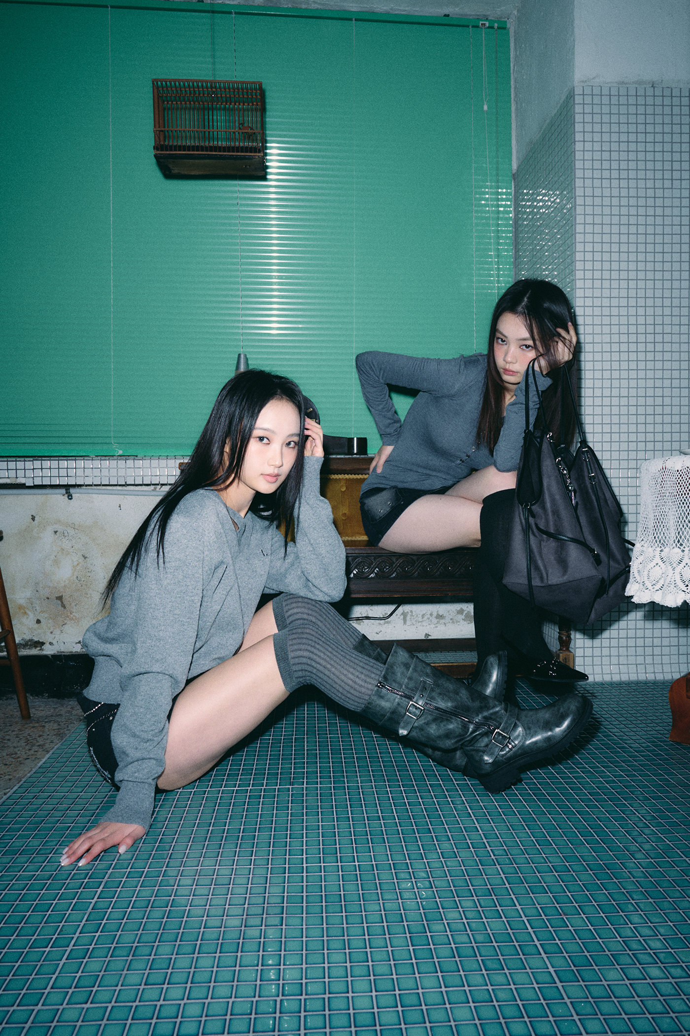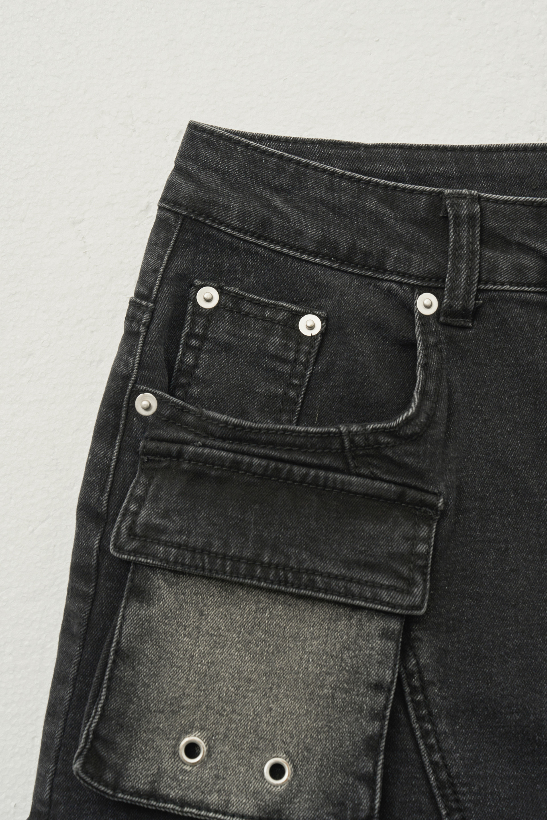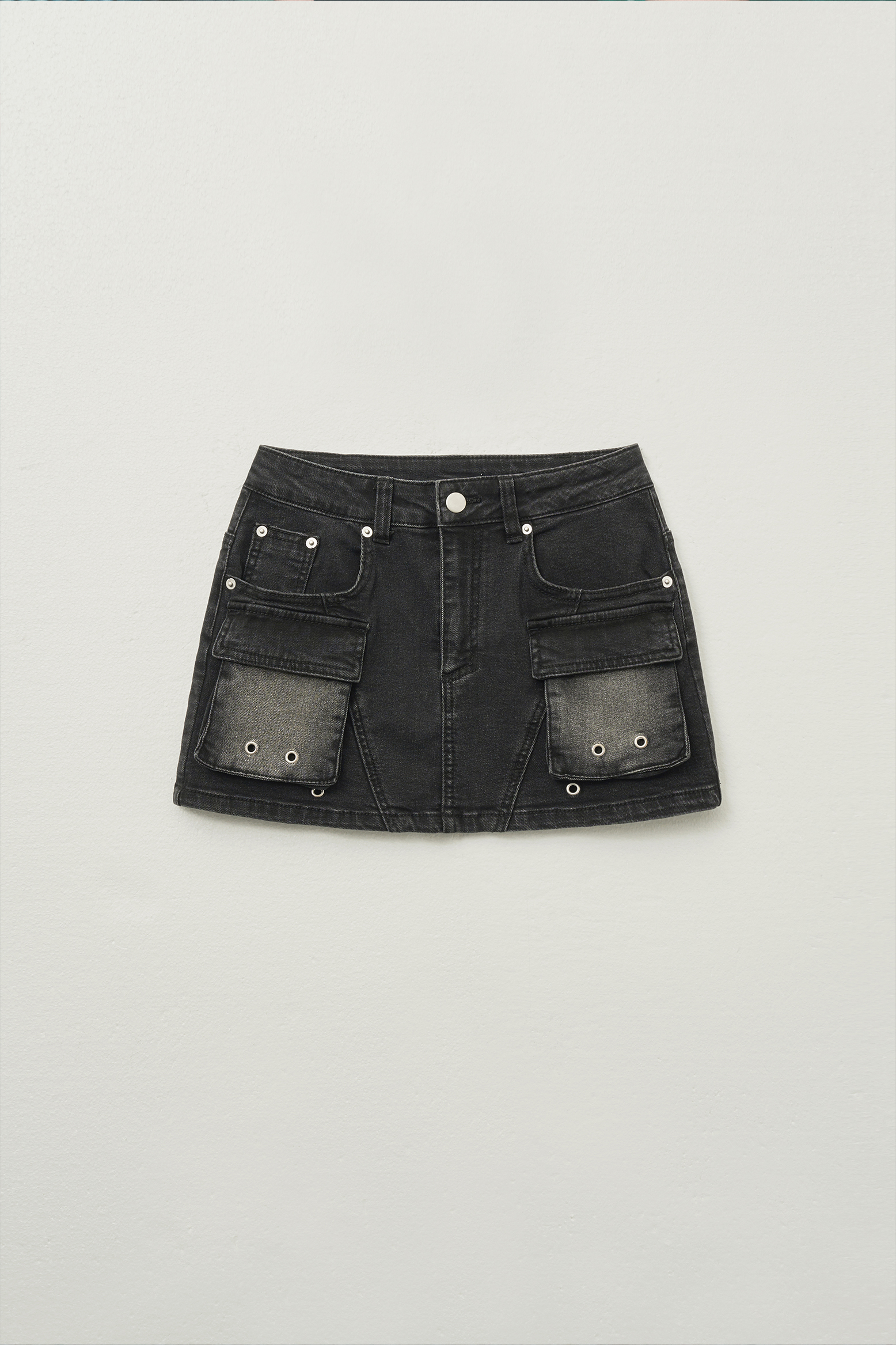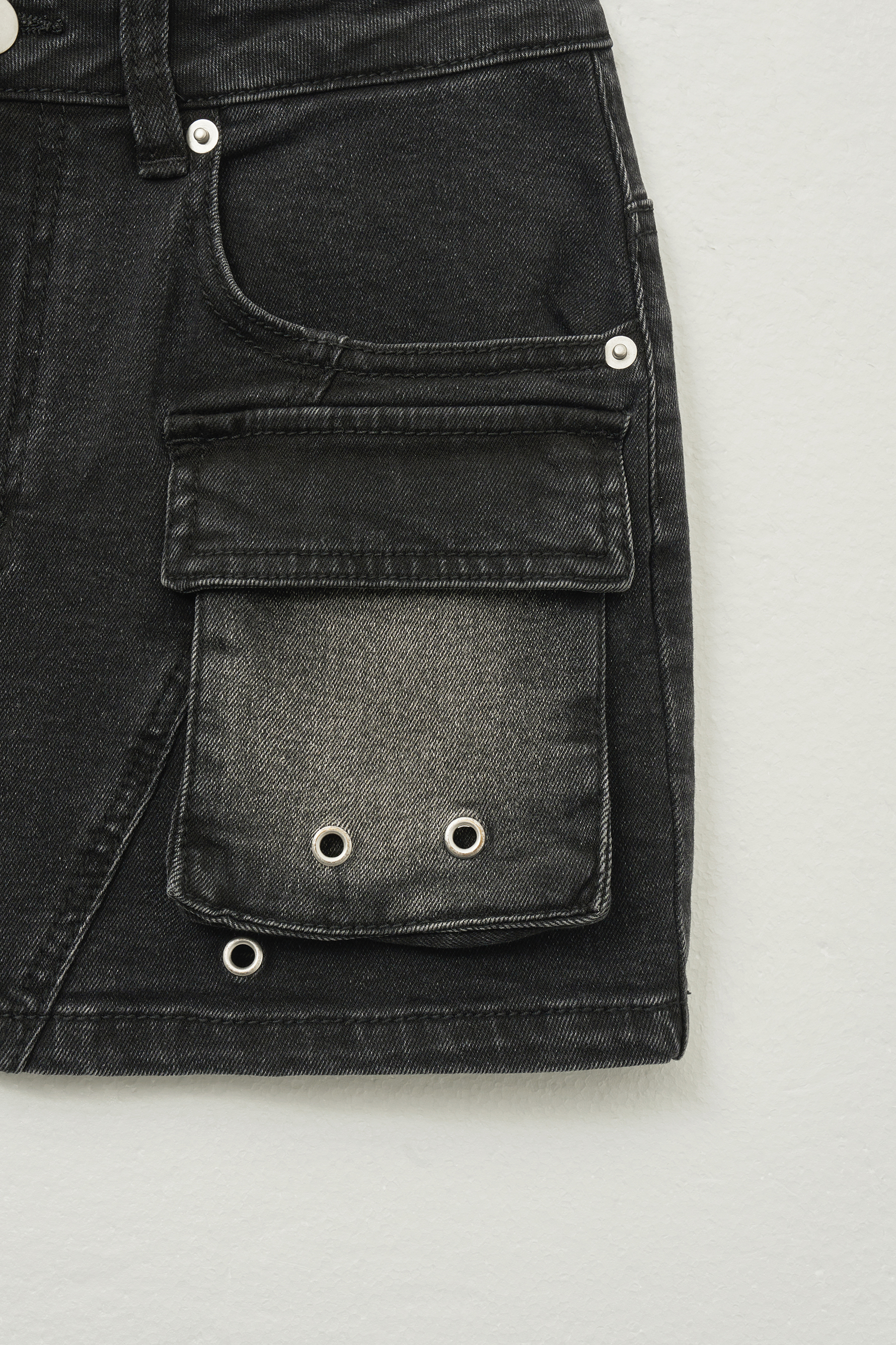 - 실버 컬러 리벳과 아일렛 디테일로 빈티지한 무드를 담았습니다.