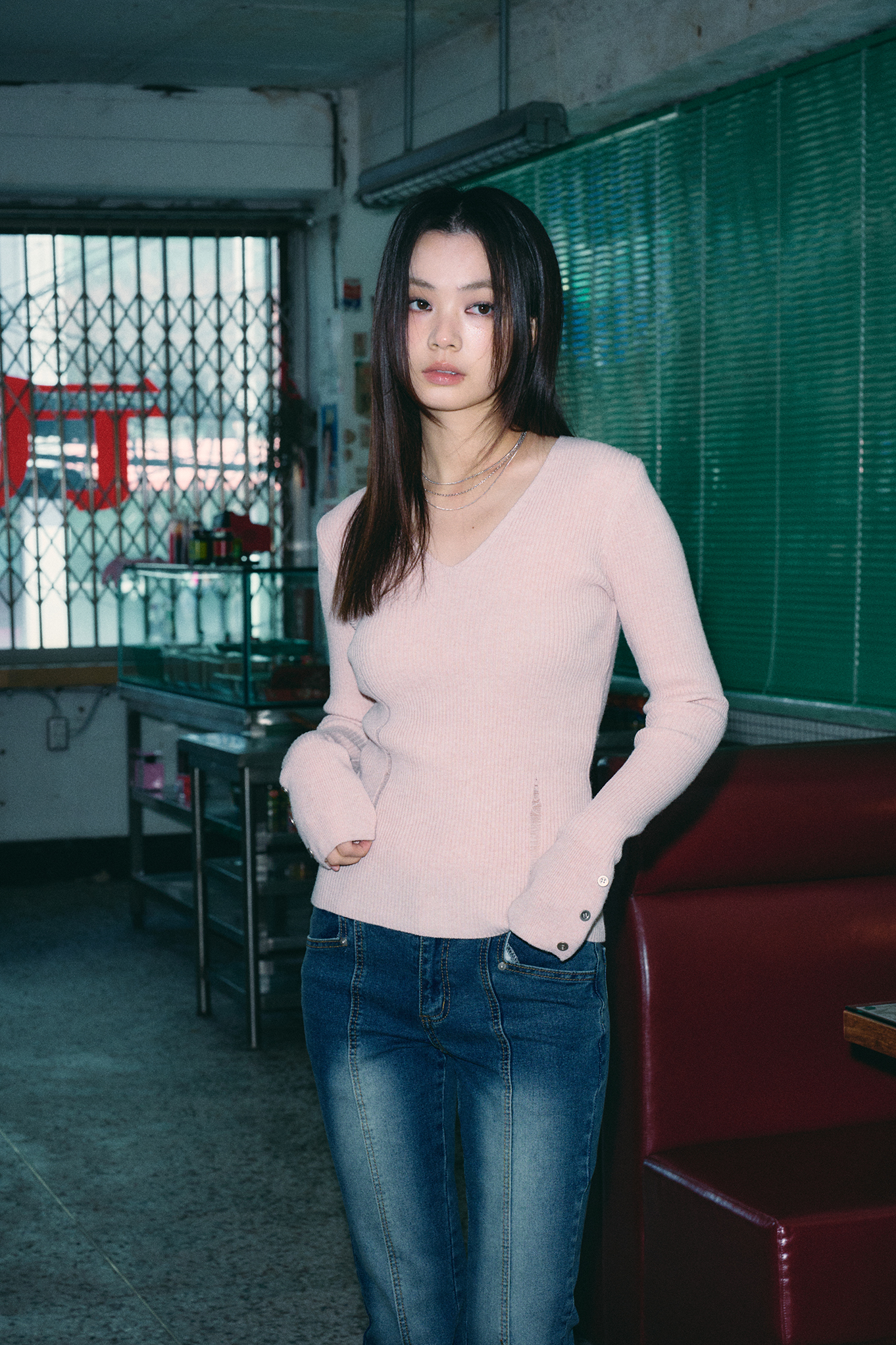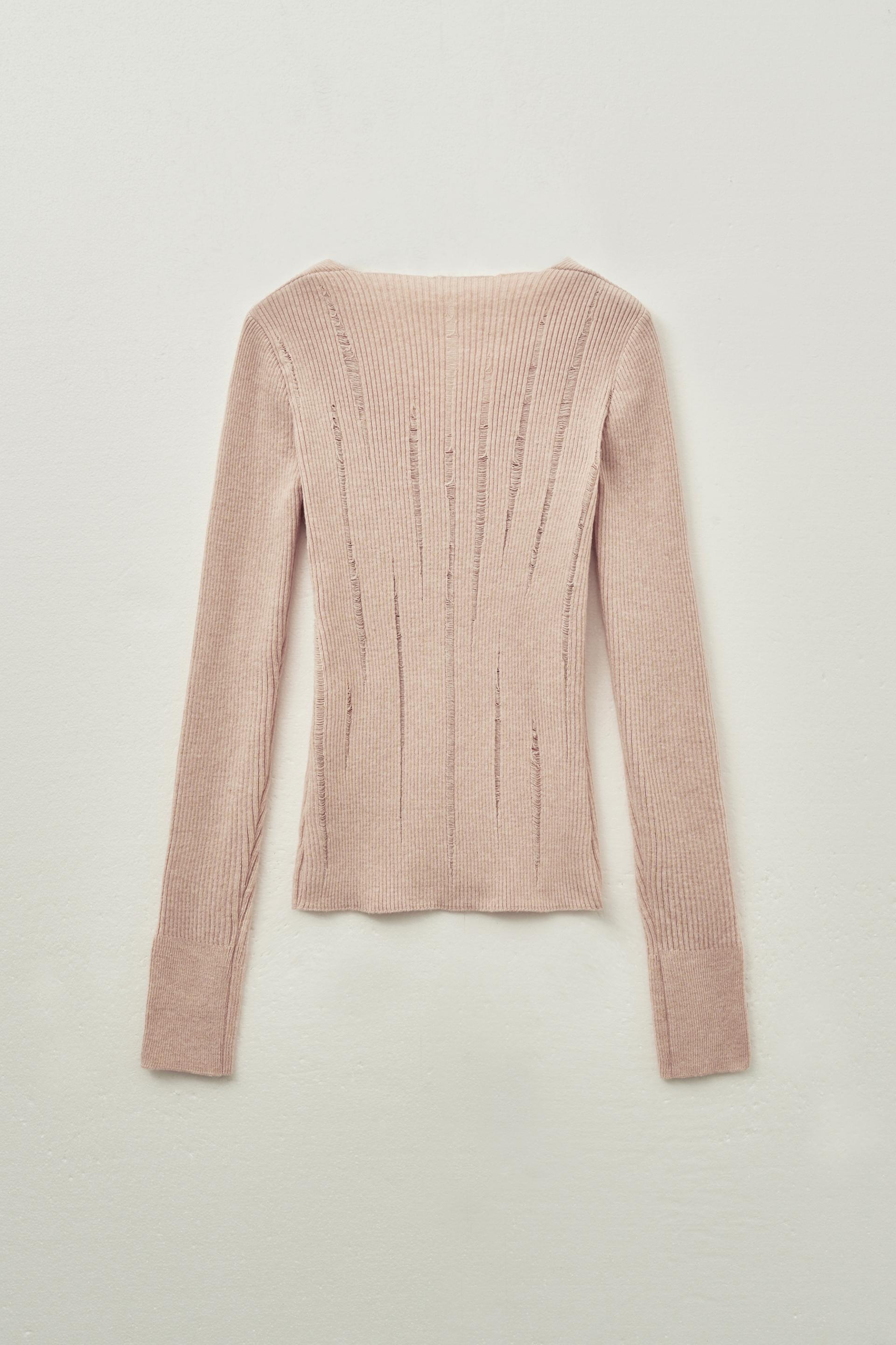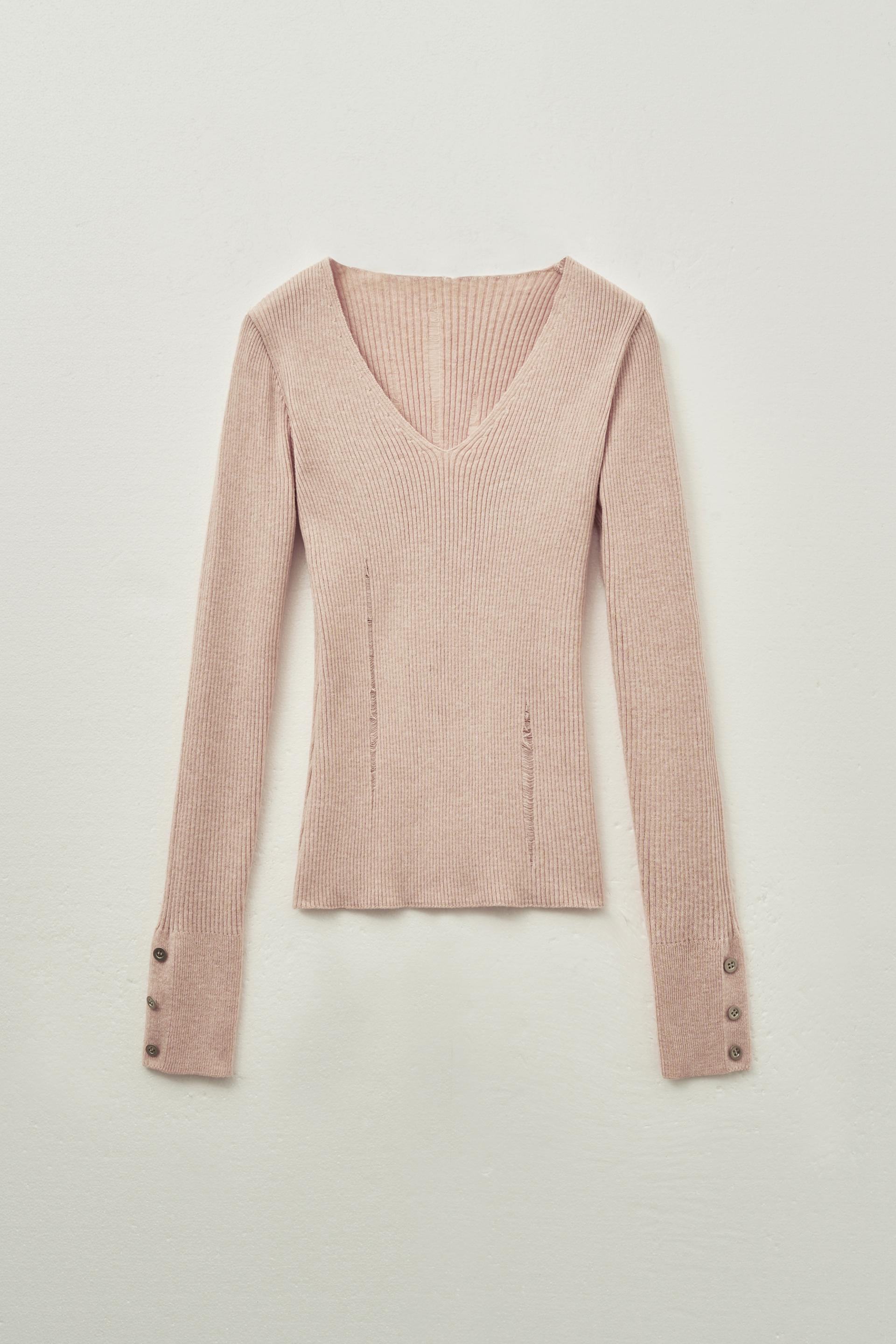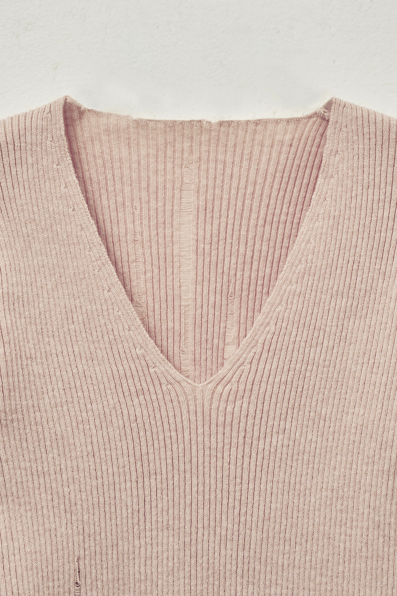 데미지드 브이넥 리브드 니트 [스킨 핑크]