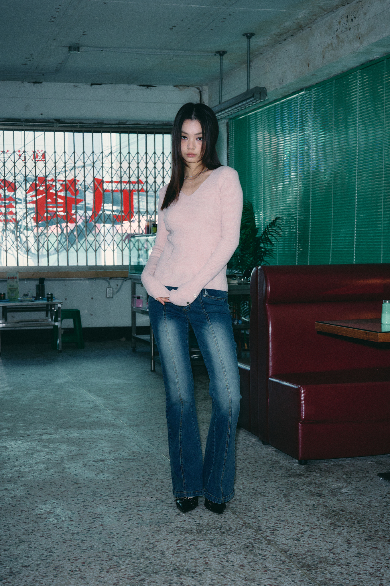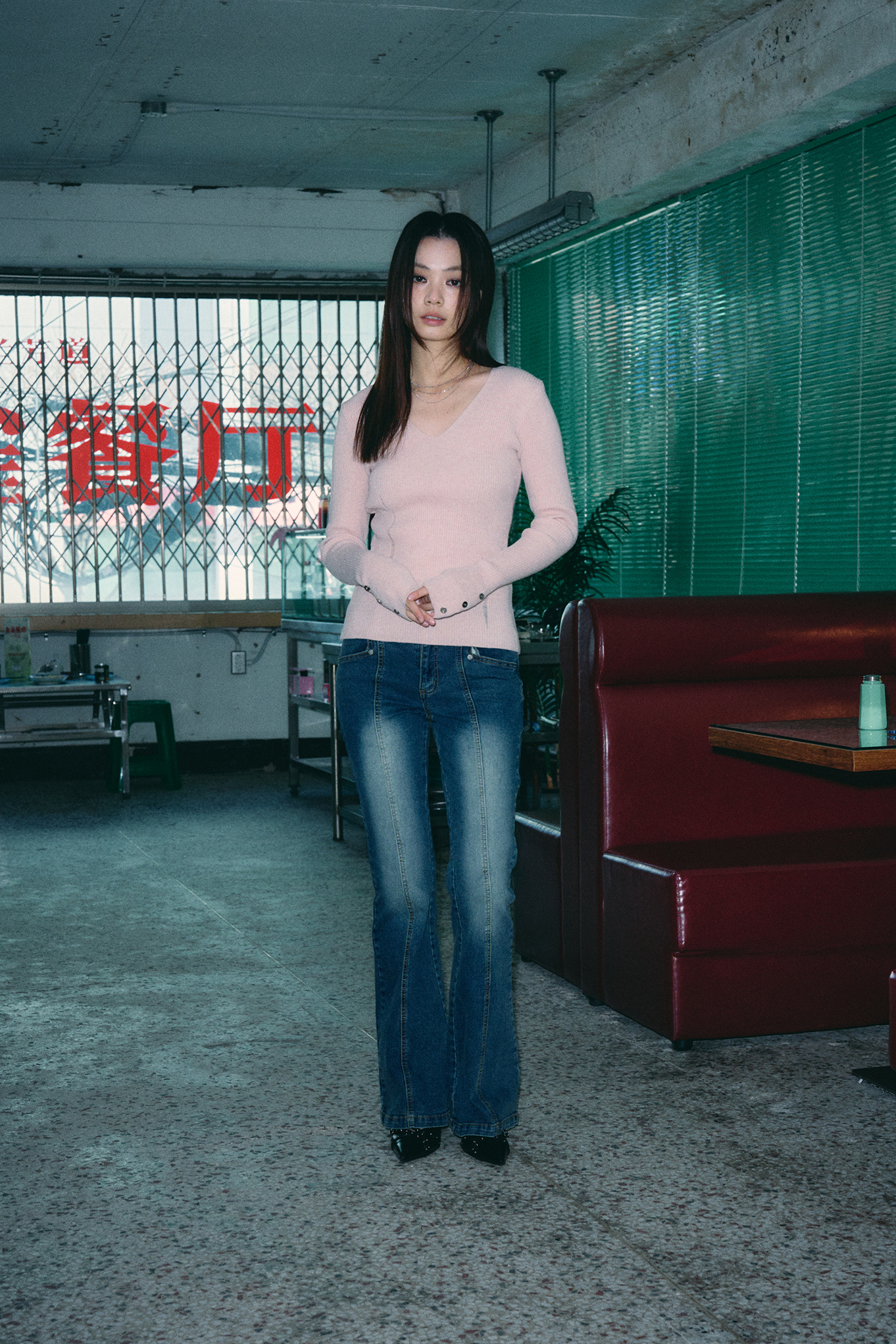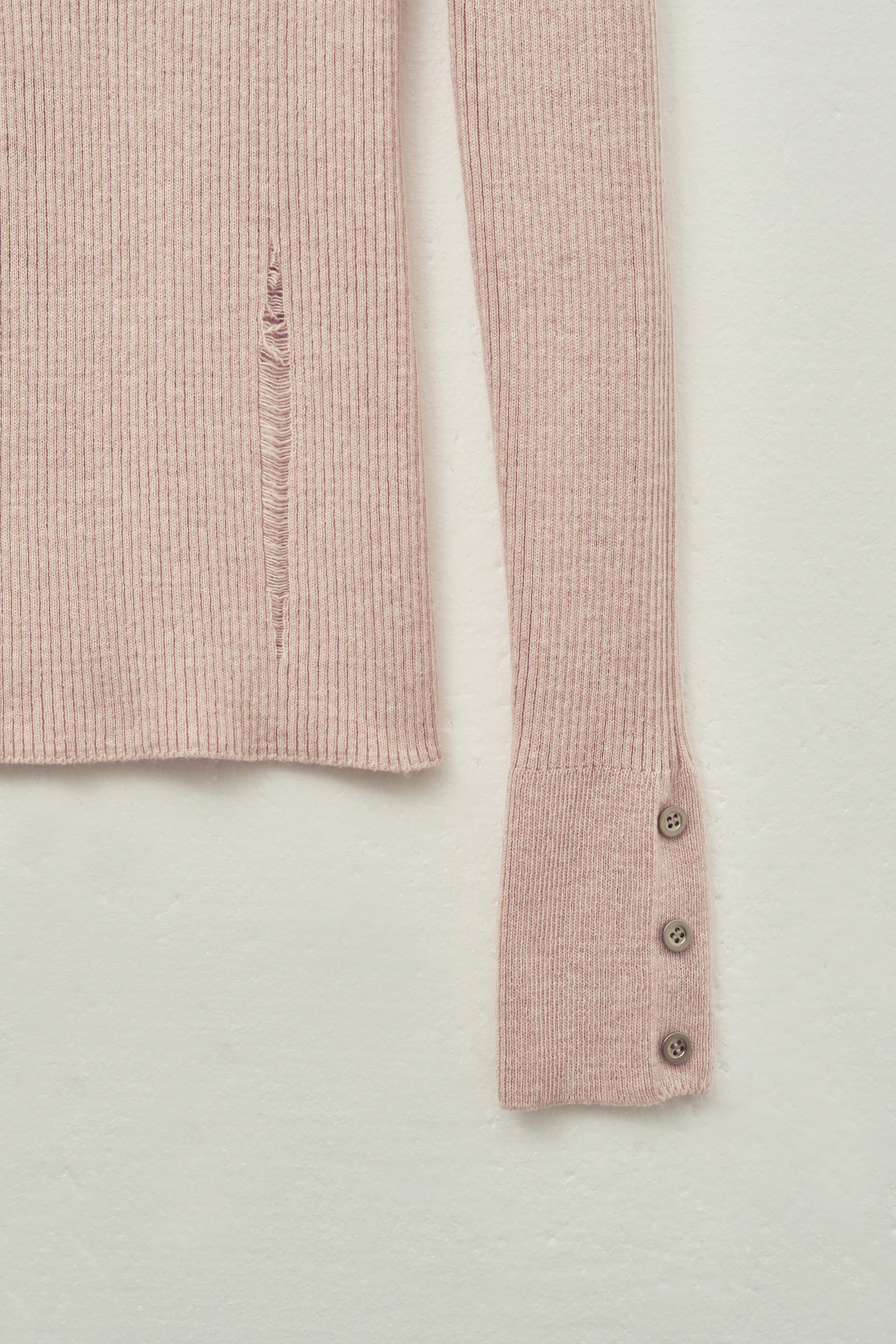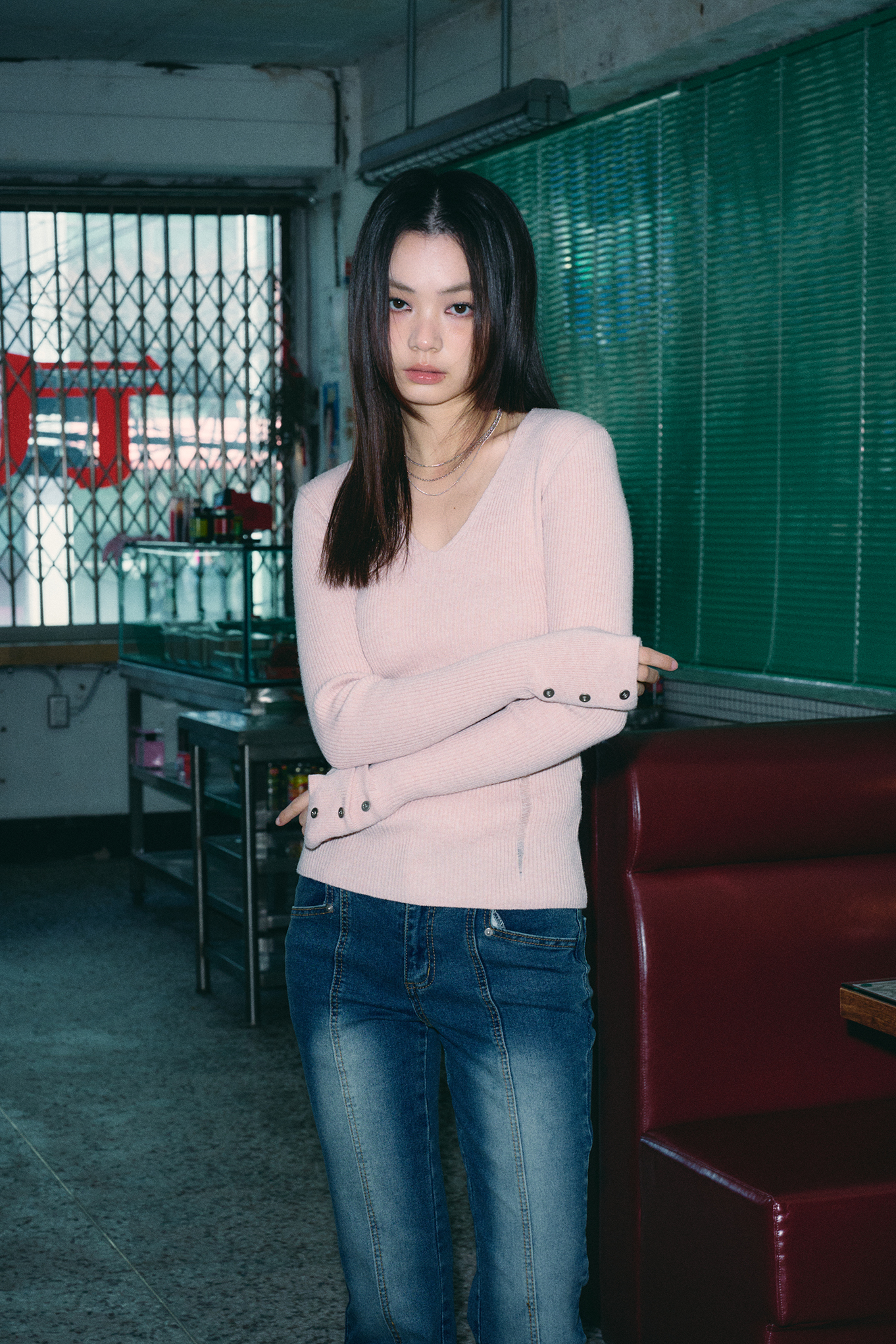 데미지드 브이넥 리브드 니트 [스킨 핑크]