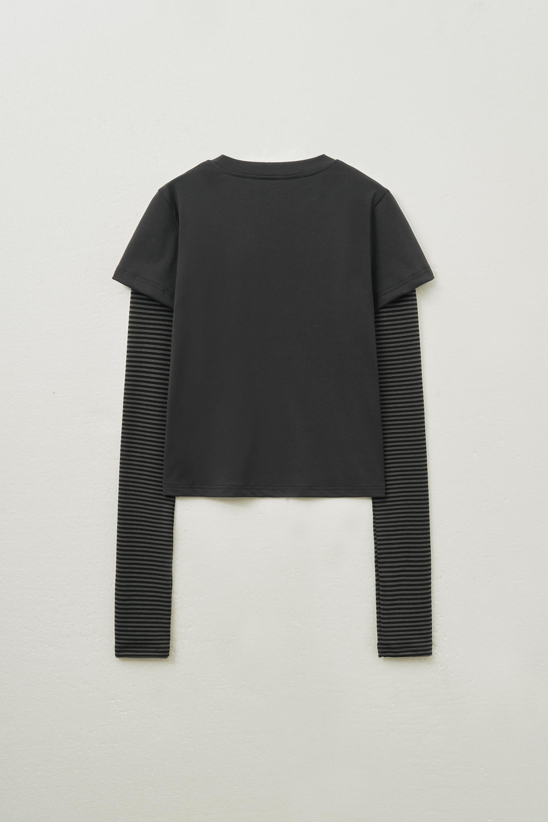 - 하프 슬리브와 롱 슬리브를 레이어드한 디자인으로 팔뚝을 자연스럽게 커버해줍니다.