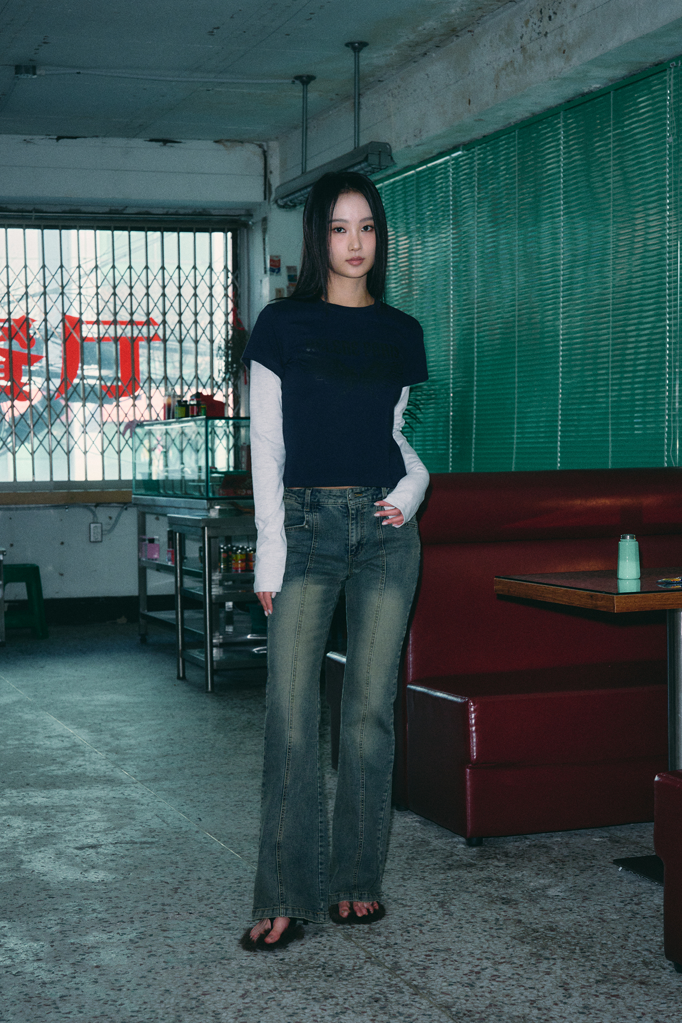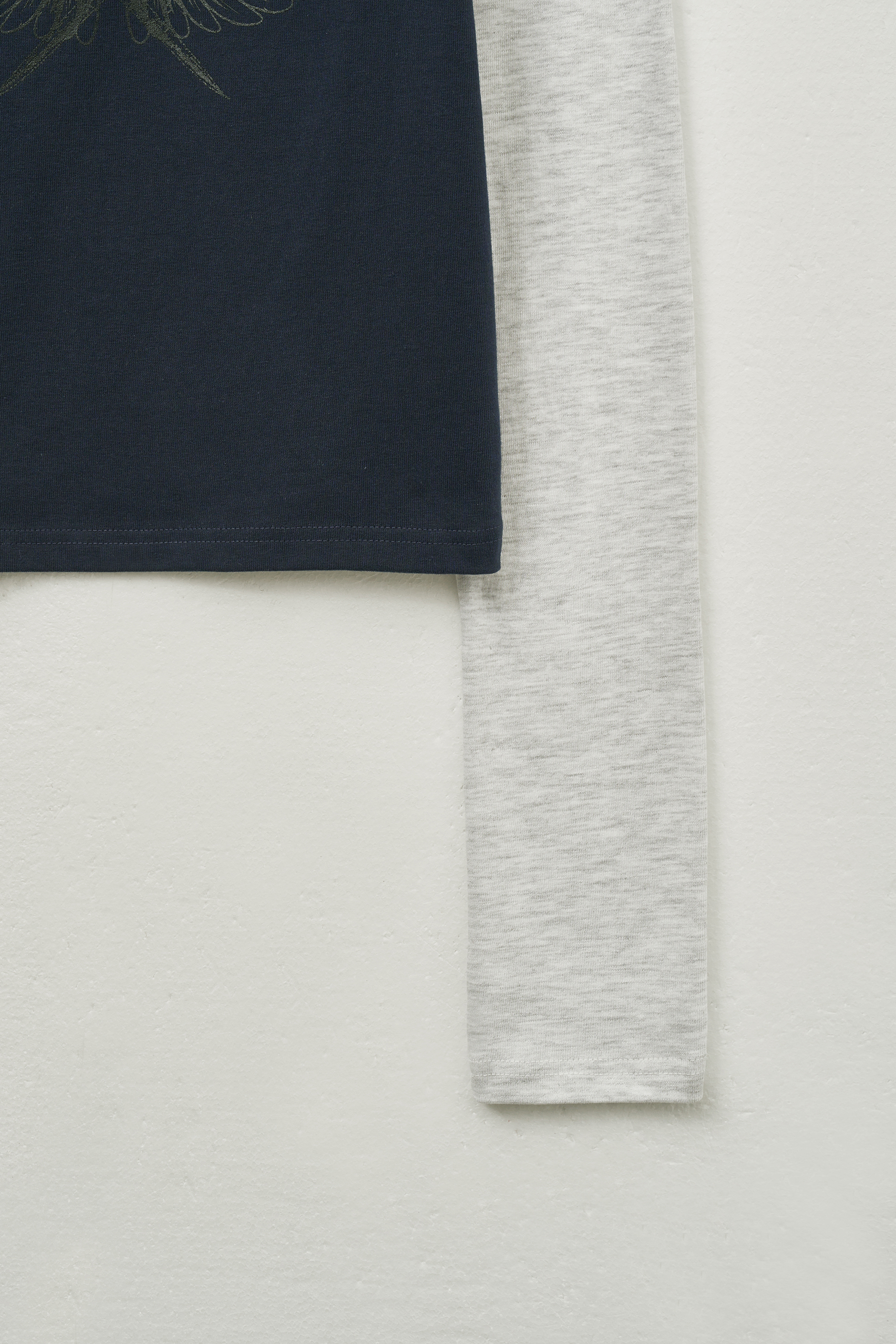 - 하프 슬리브와 롱 슬리브를 레이어드한 디자인으로 팔뚝을 자연스럽게 커버해줍니다.