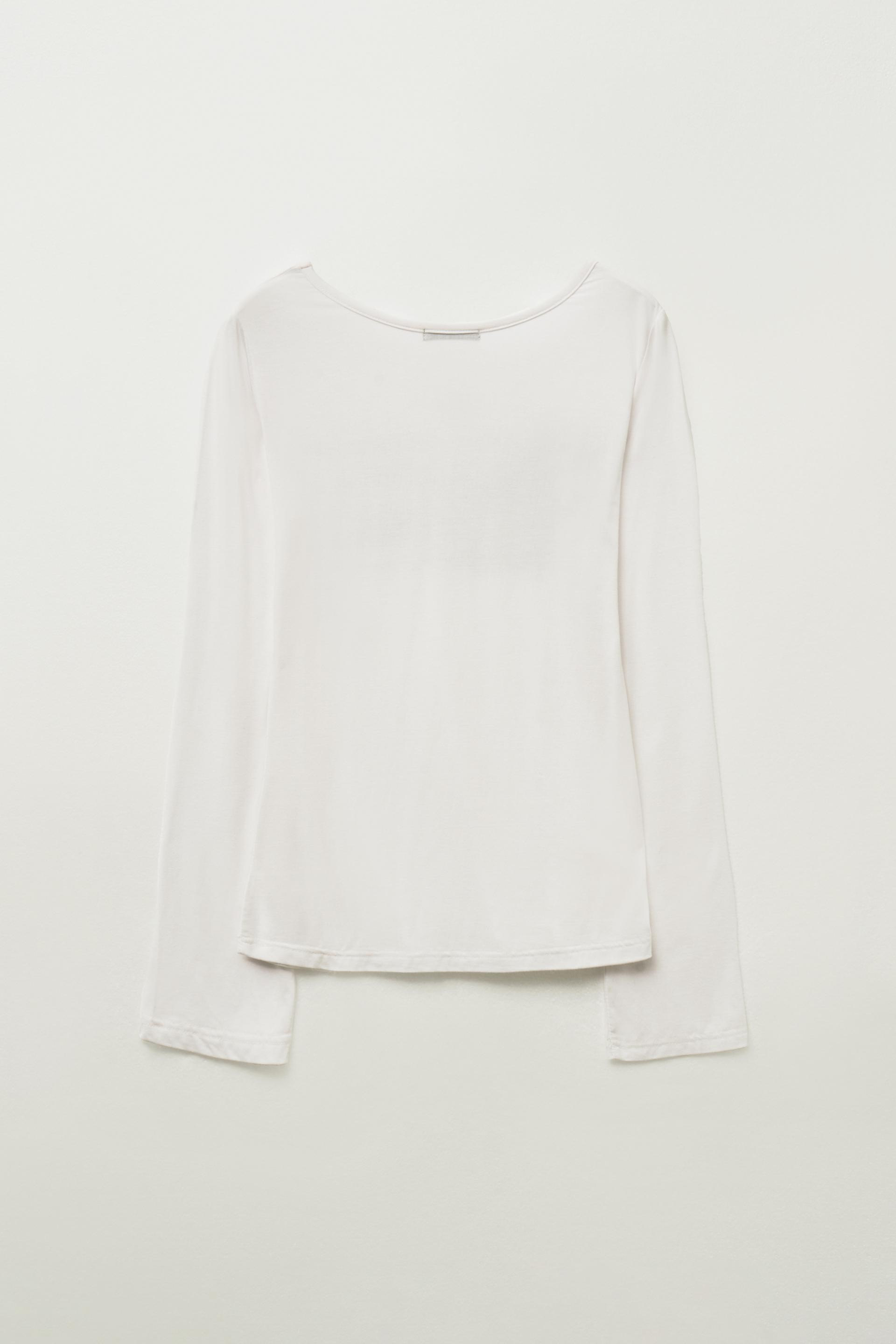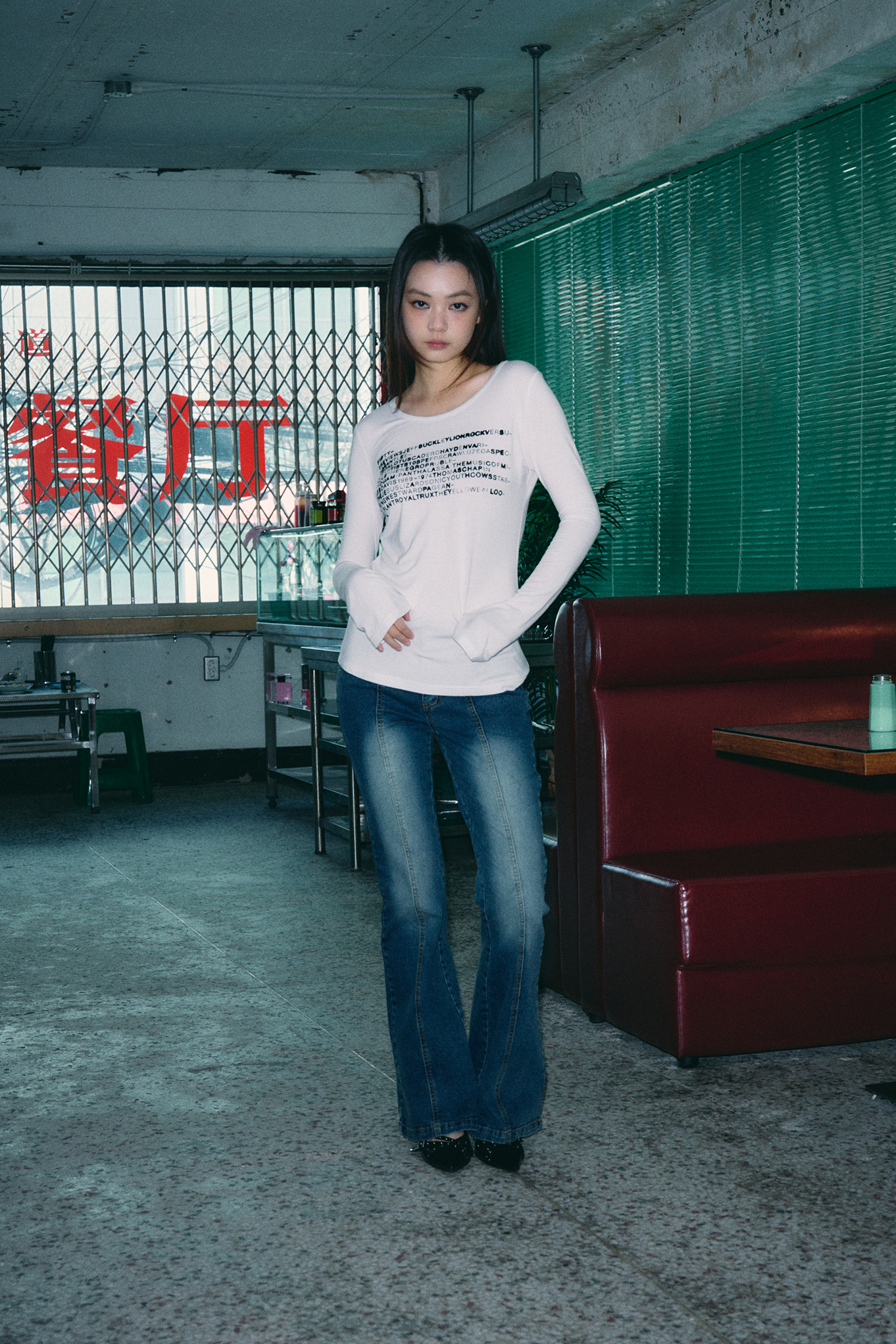 - 넥 라인을 드러내주는 보트넥 디자인과 손등까지 덮어 안정감 있는 벨 디자인 소매로 전체적인 실루엣을 안정감 있게 만듭니다.