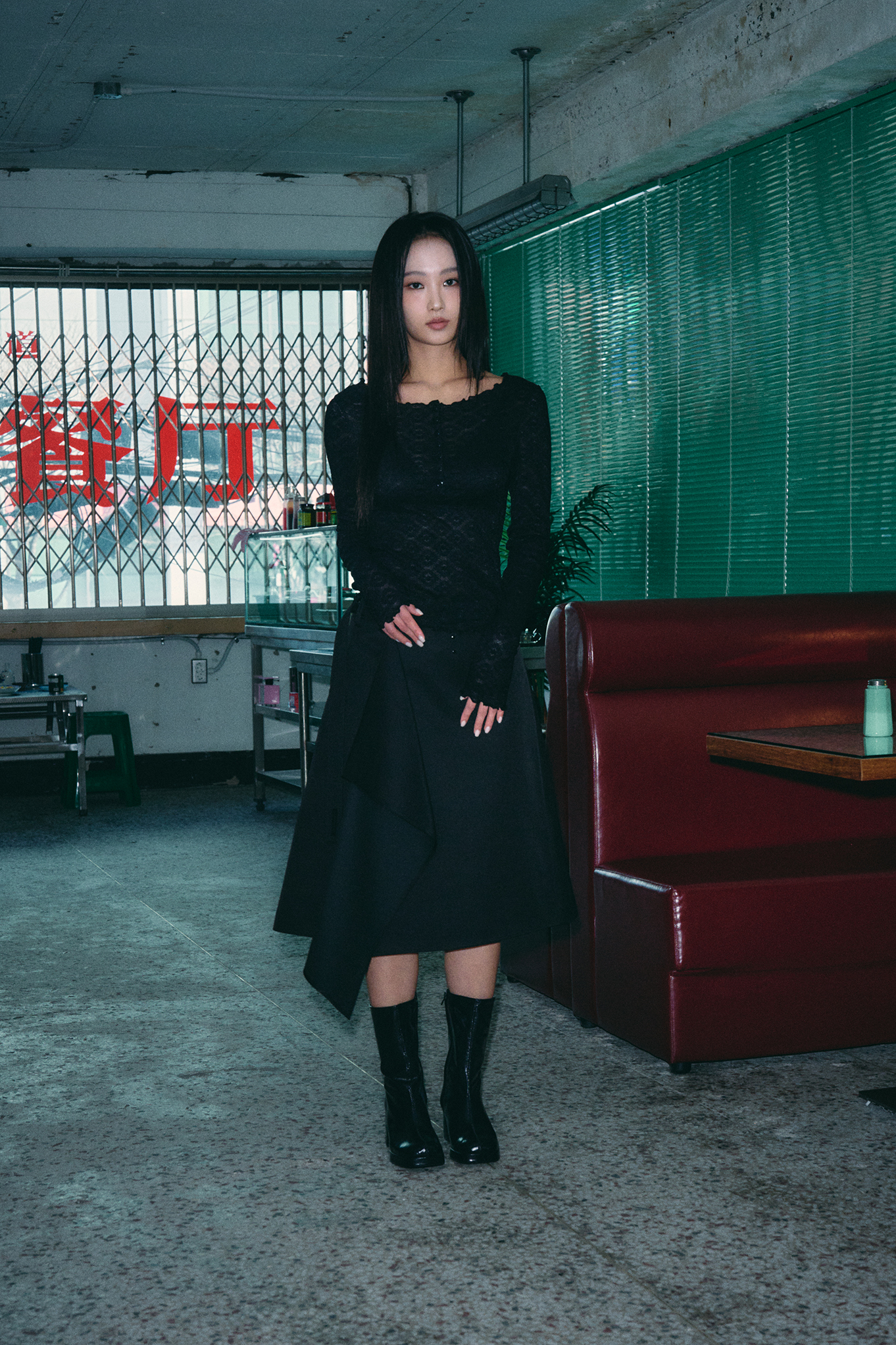 - 살이 비치는 매력의 시스루 레이스 패브릭으로 제작되어, 단품 착용이나 이너 레이어링 등 활용도가 높습니다.