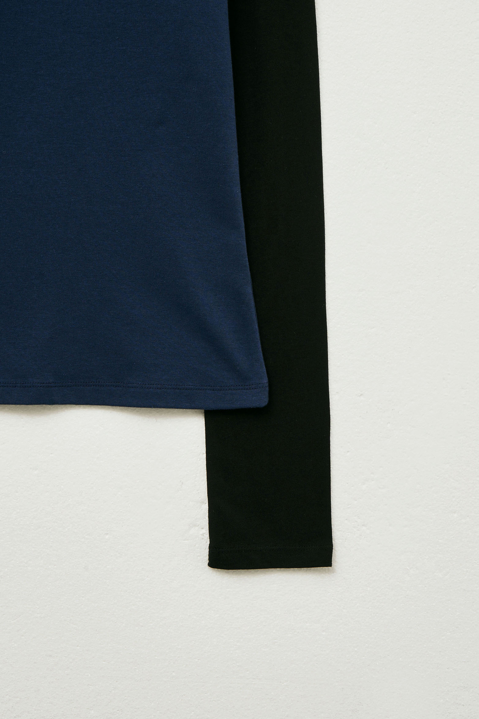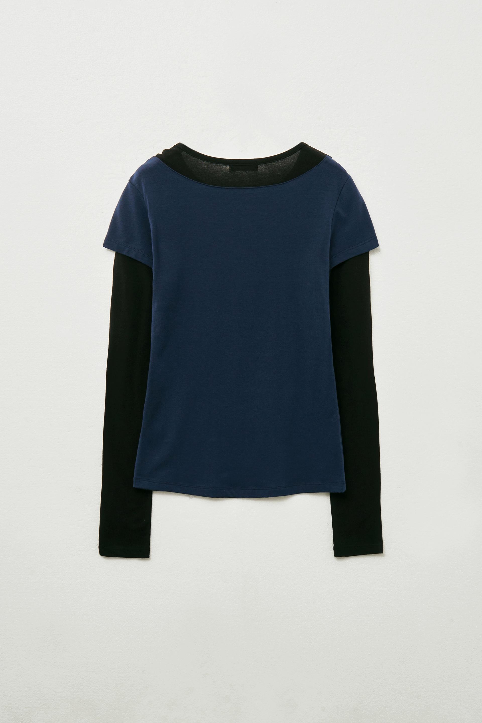 - 노출이 적은 라운드 넥 롱슬리브와 보트넥 넥 라인 하프 슬리브 일체형 레이어드 디자인으로 팔뚝을 자연스럽게 커버해줍니다.