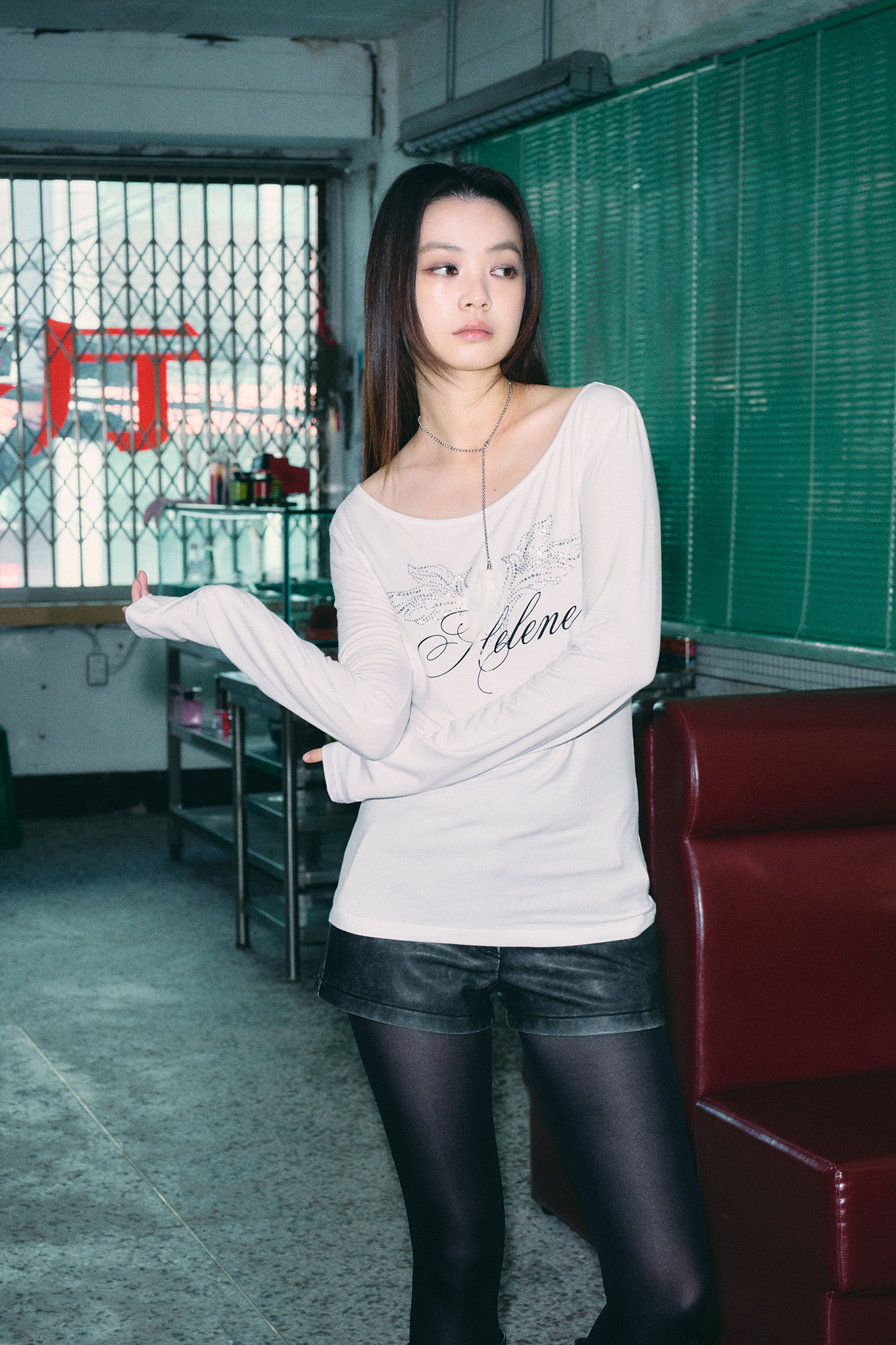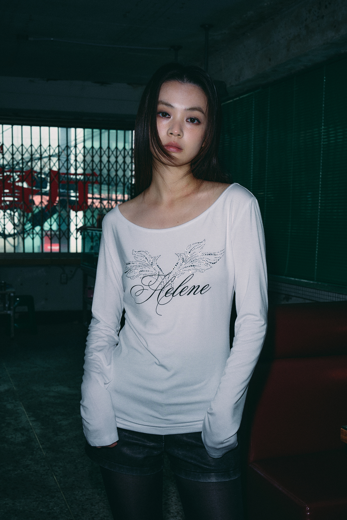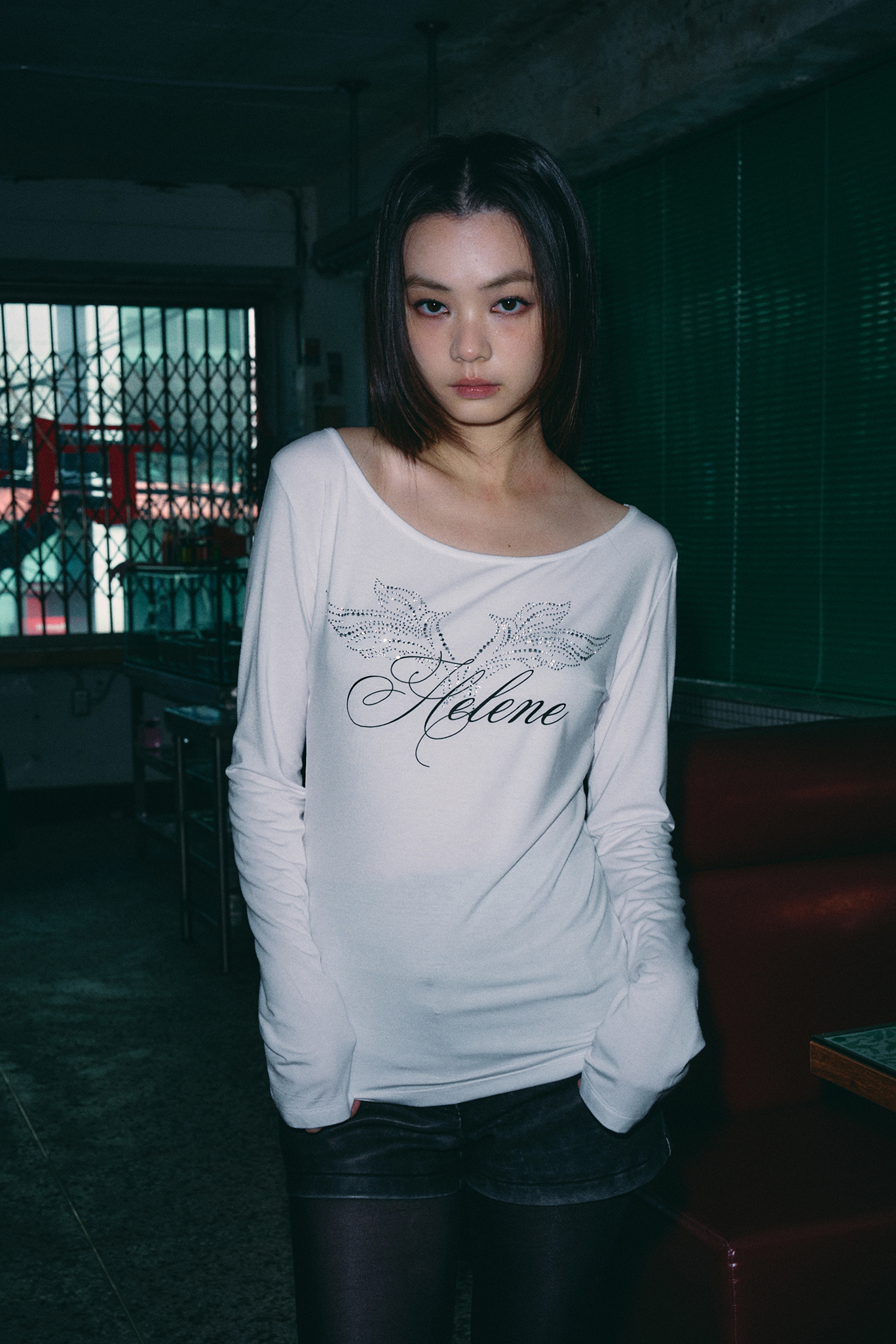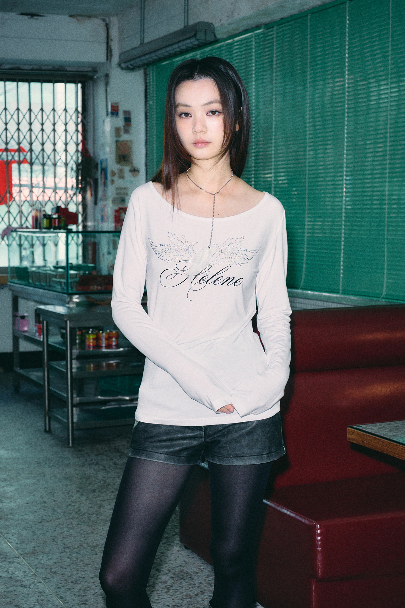 - 빈티지한 무드의 큐빅과 헬레네 필기체 프린트의 조화로 룩에 포인트를 줍니다.