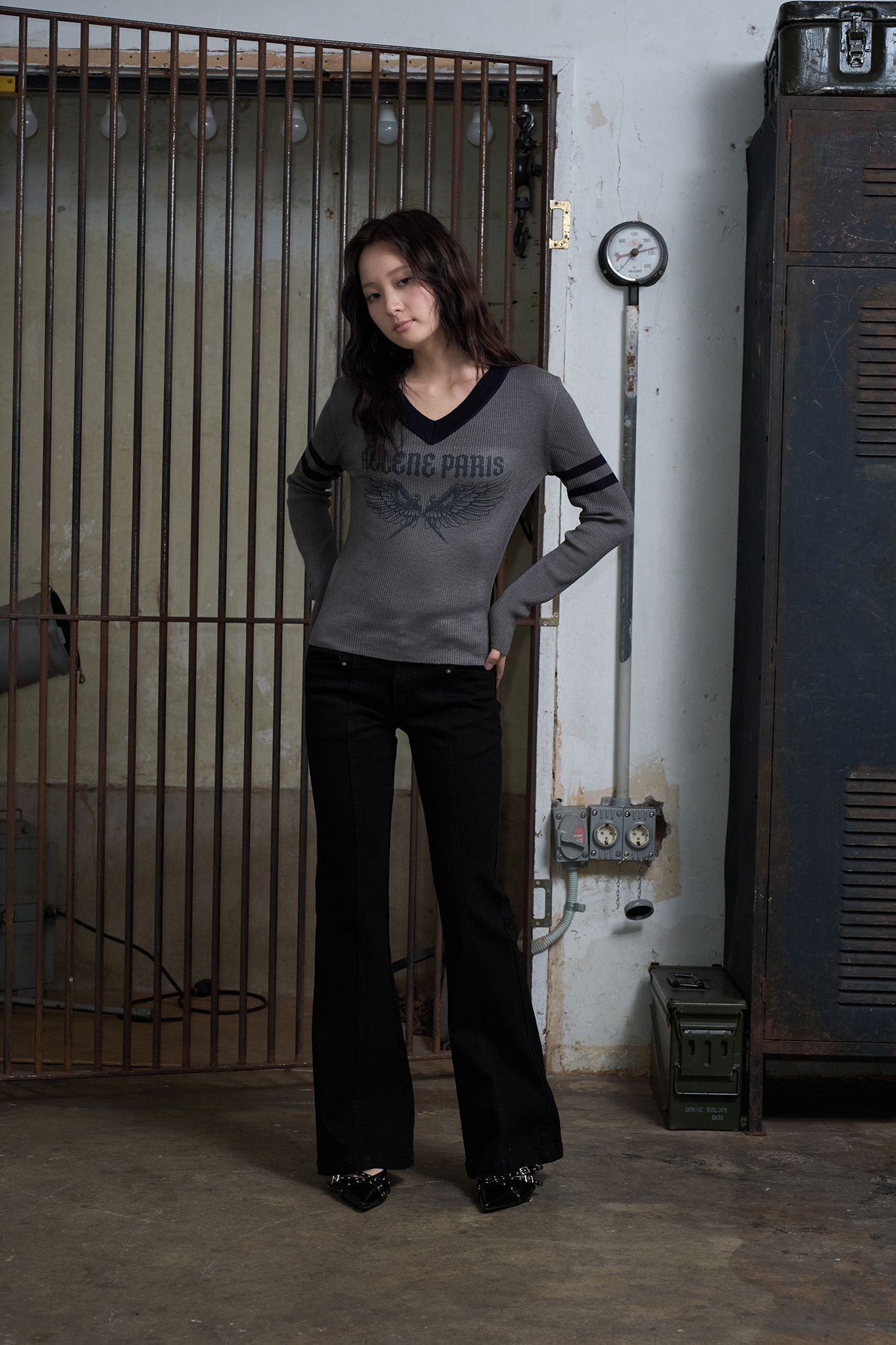 엔젤 브이넥 핀 포인트 니트 [차콜]