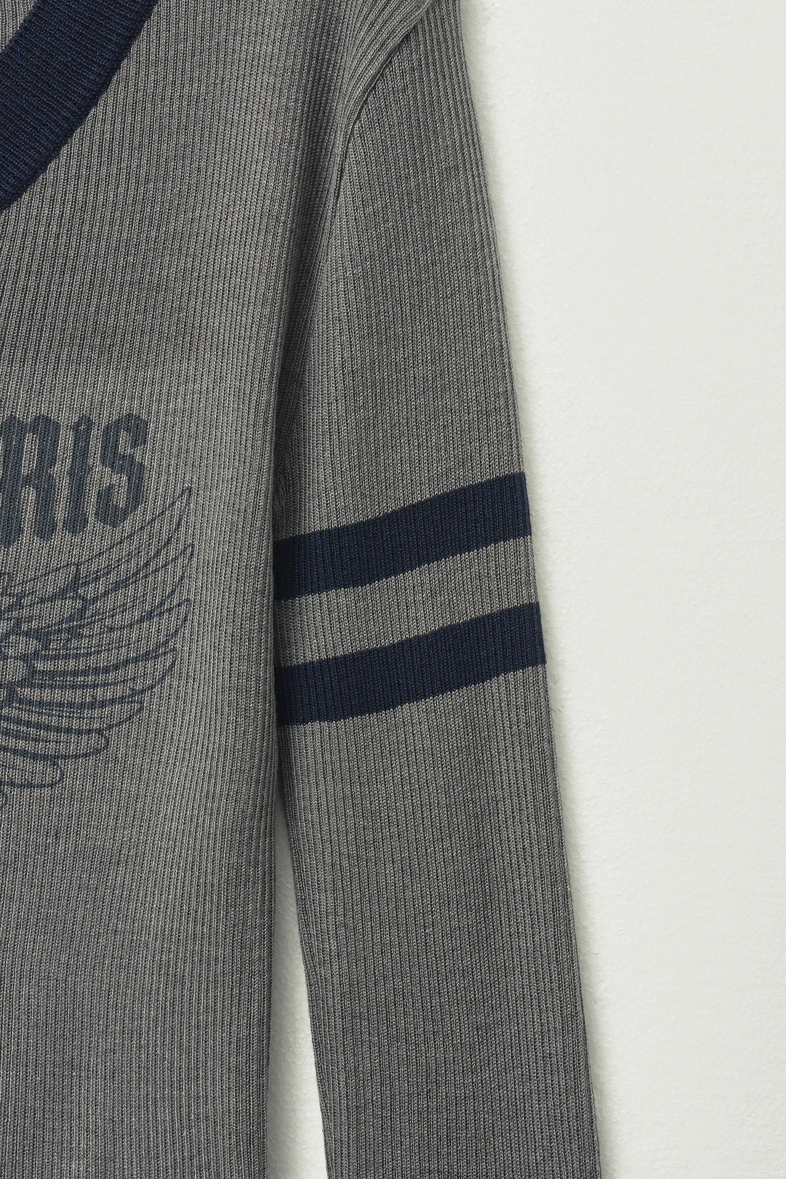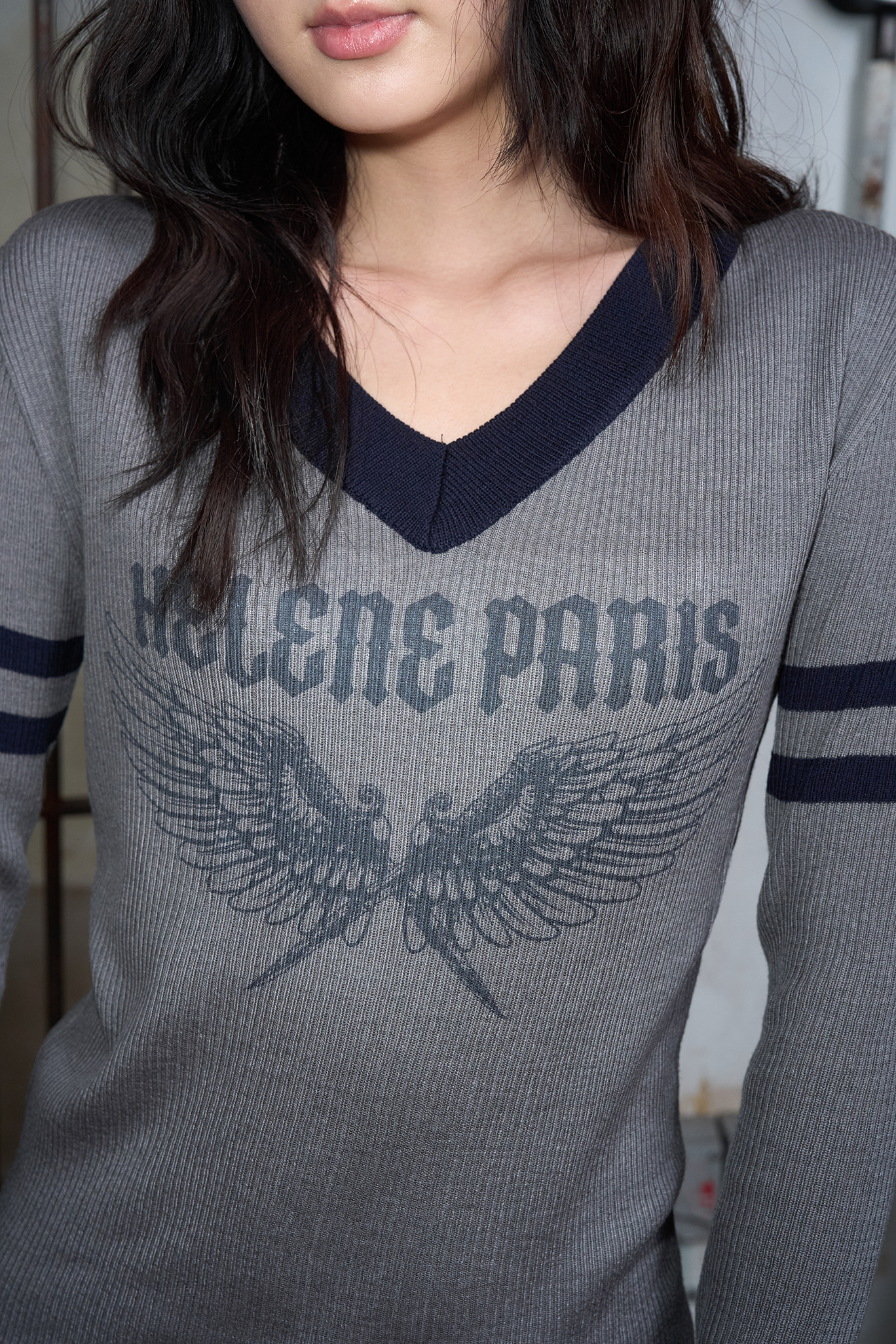 - 쇄골까지 적당히 드러나는 깊이의 V넥 라인과 슬리브에 네이비 컬러 배색으로