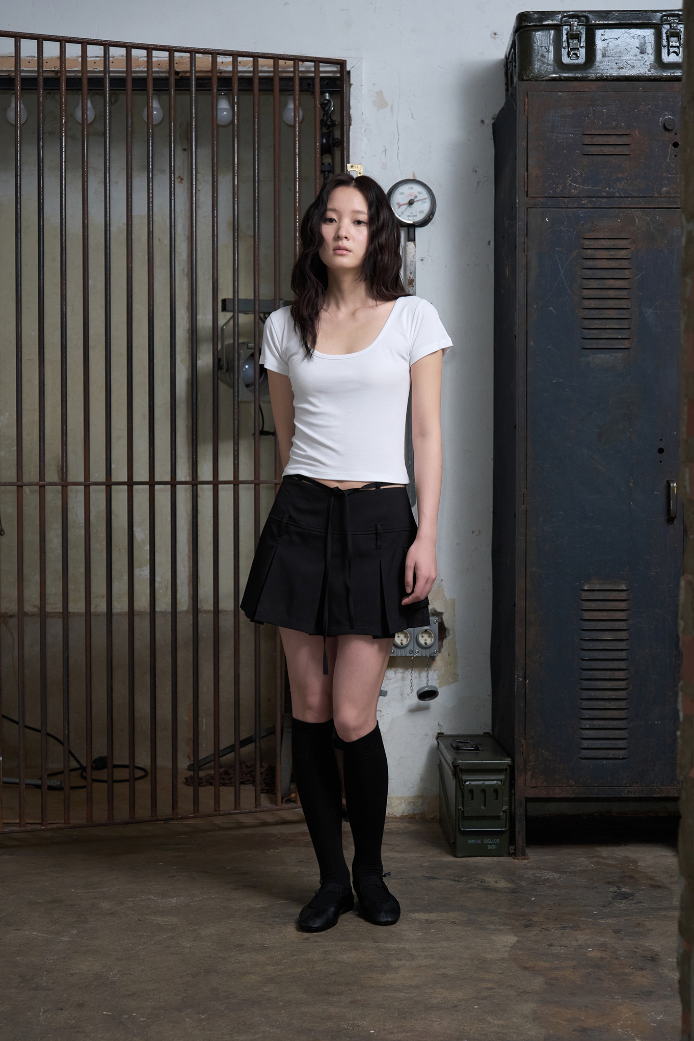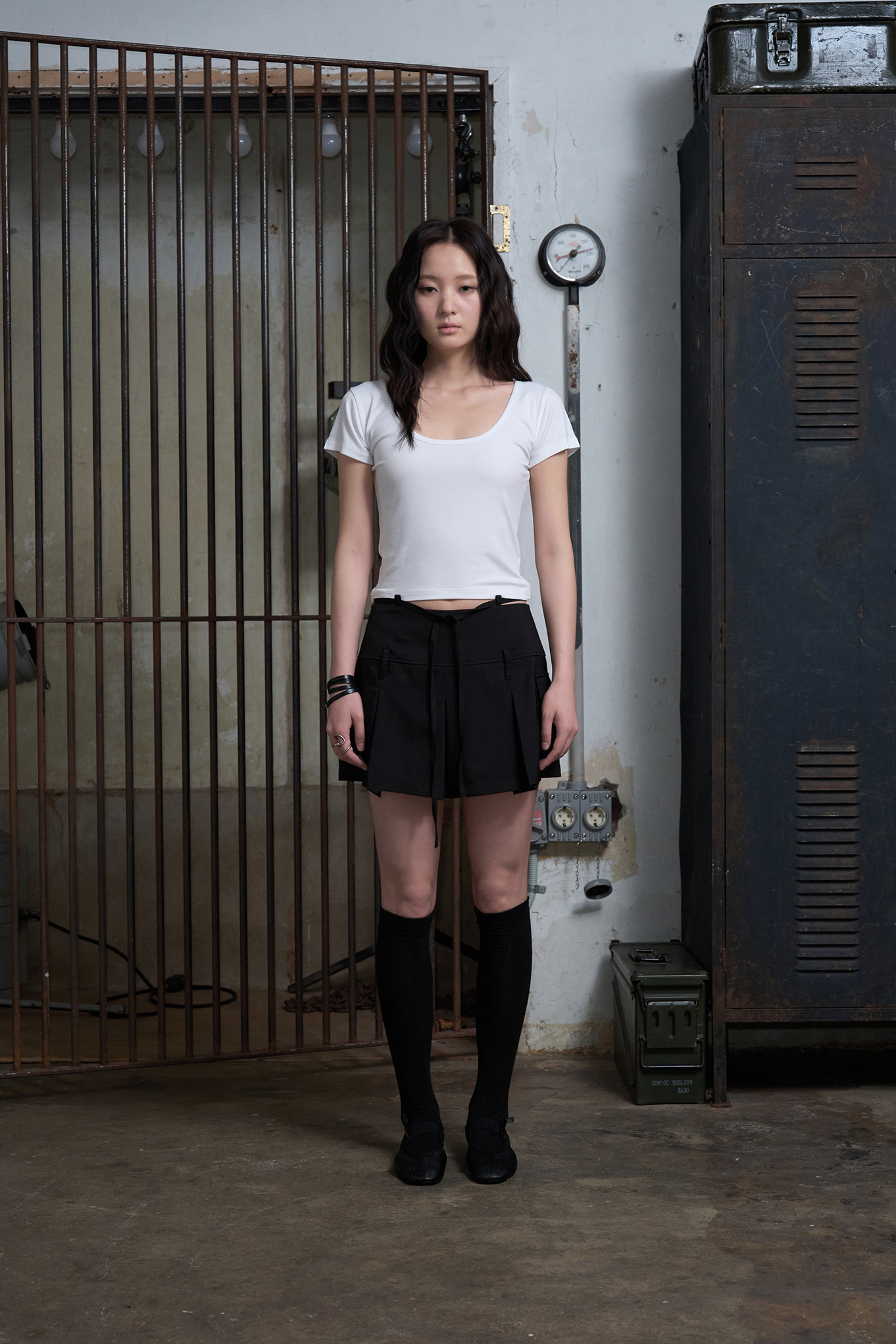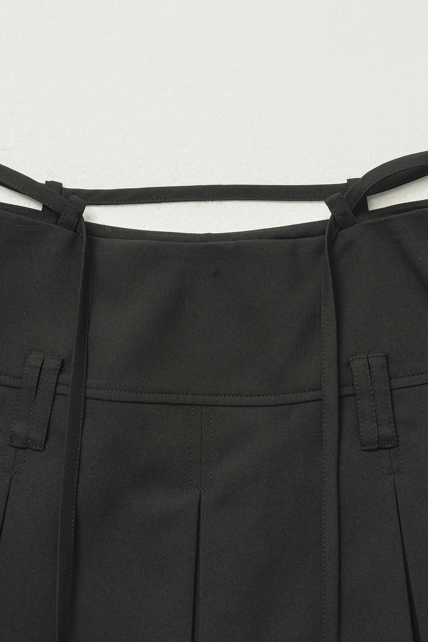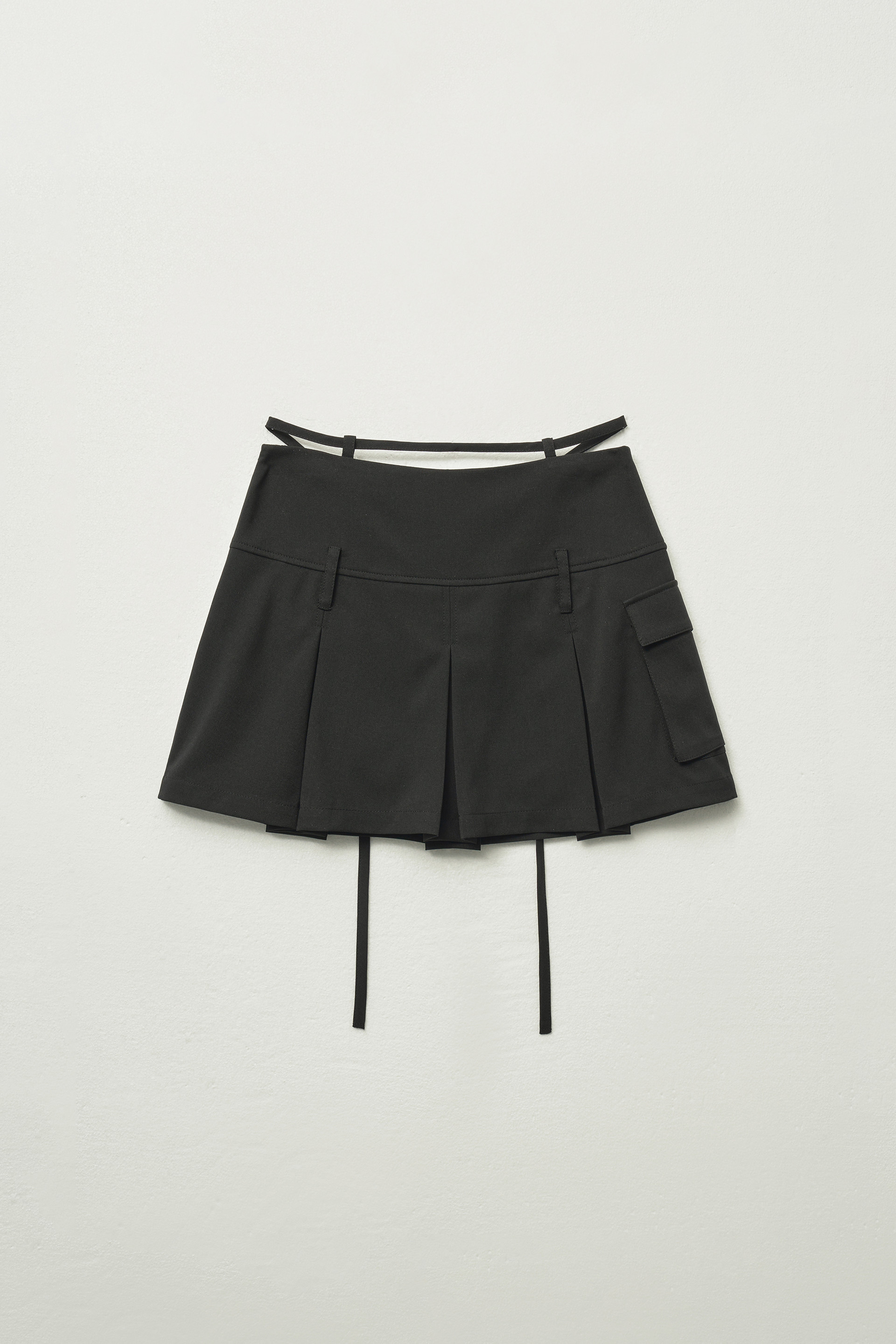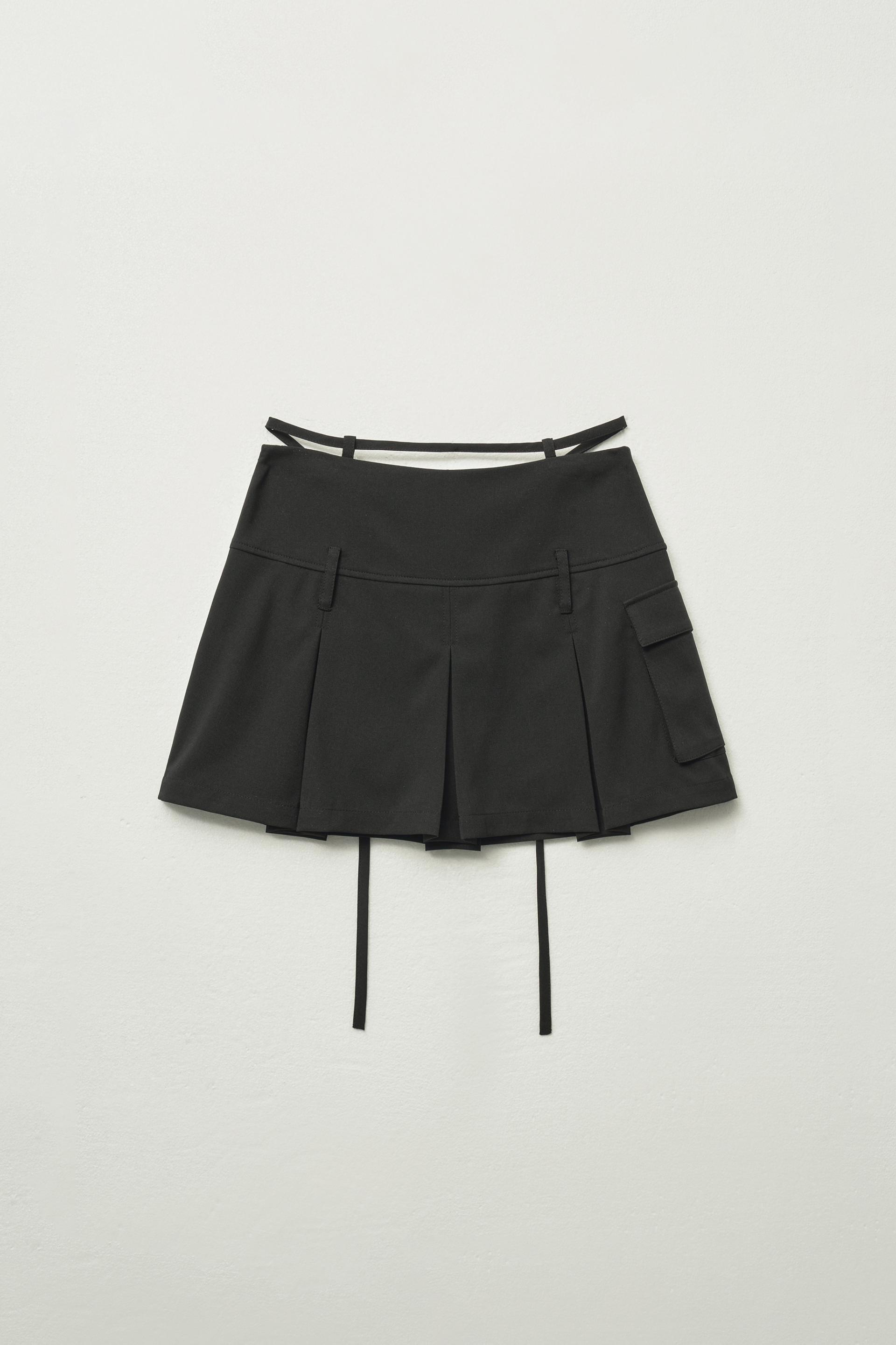 - 플리츠 디자인과 스트랩 레이어링이 매력적인 세미 A라인 미니 스커트입니다.