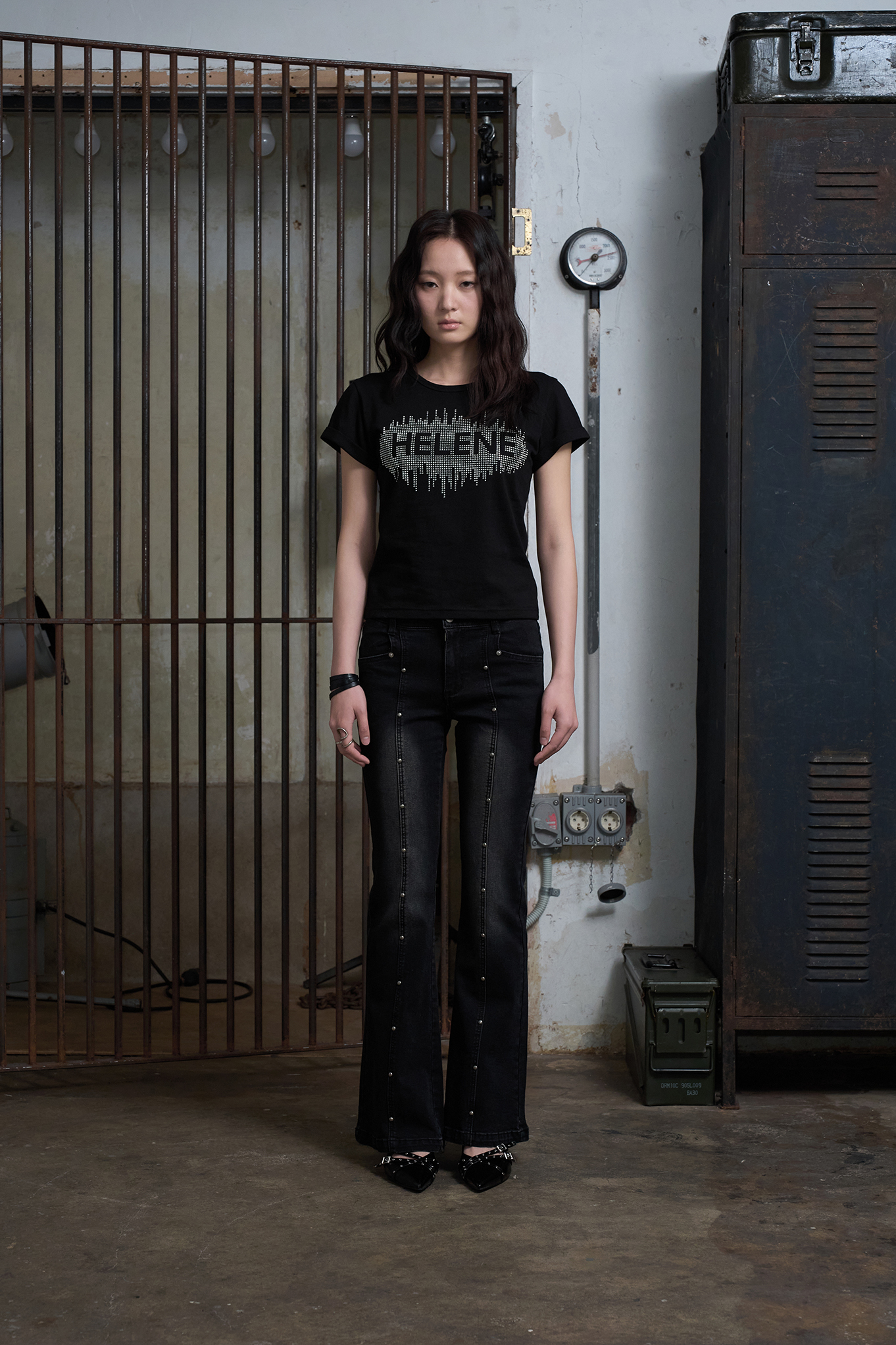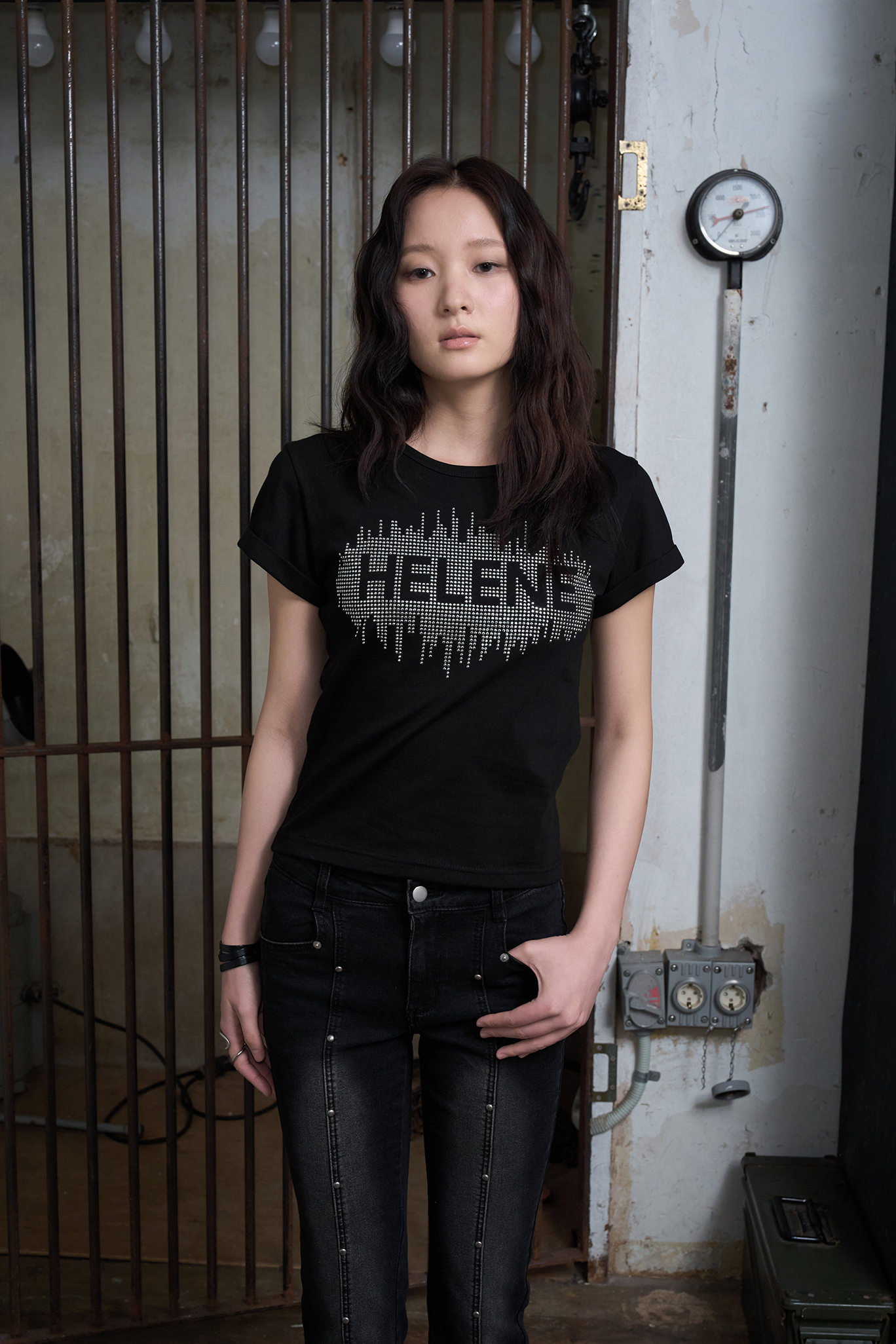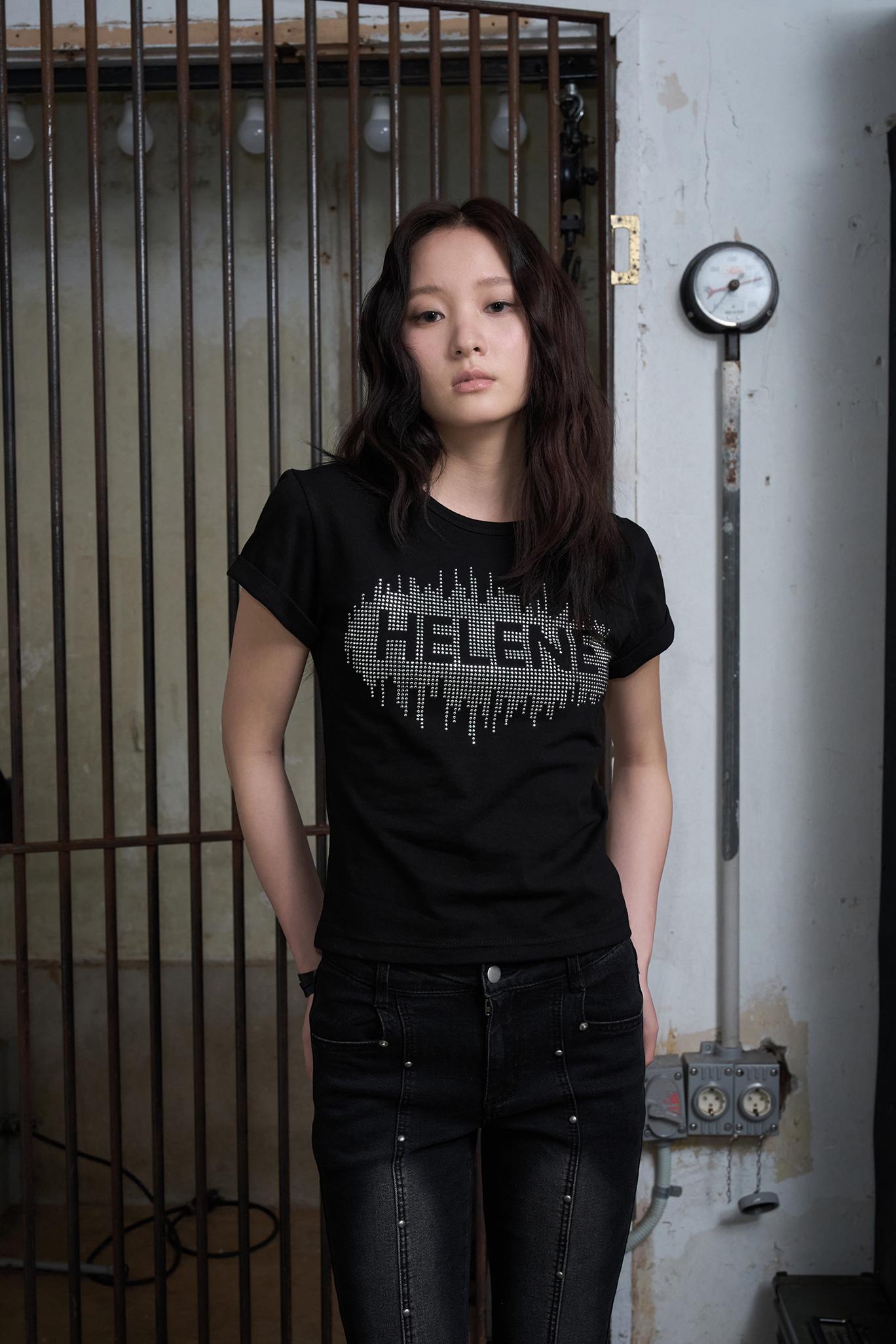 헬레네 스터드 아플리케 하프 티셔츠 [블랙]