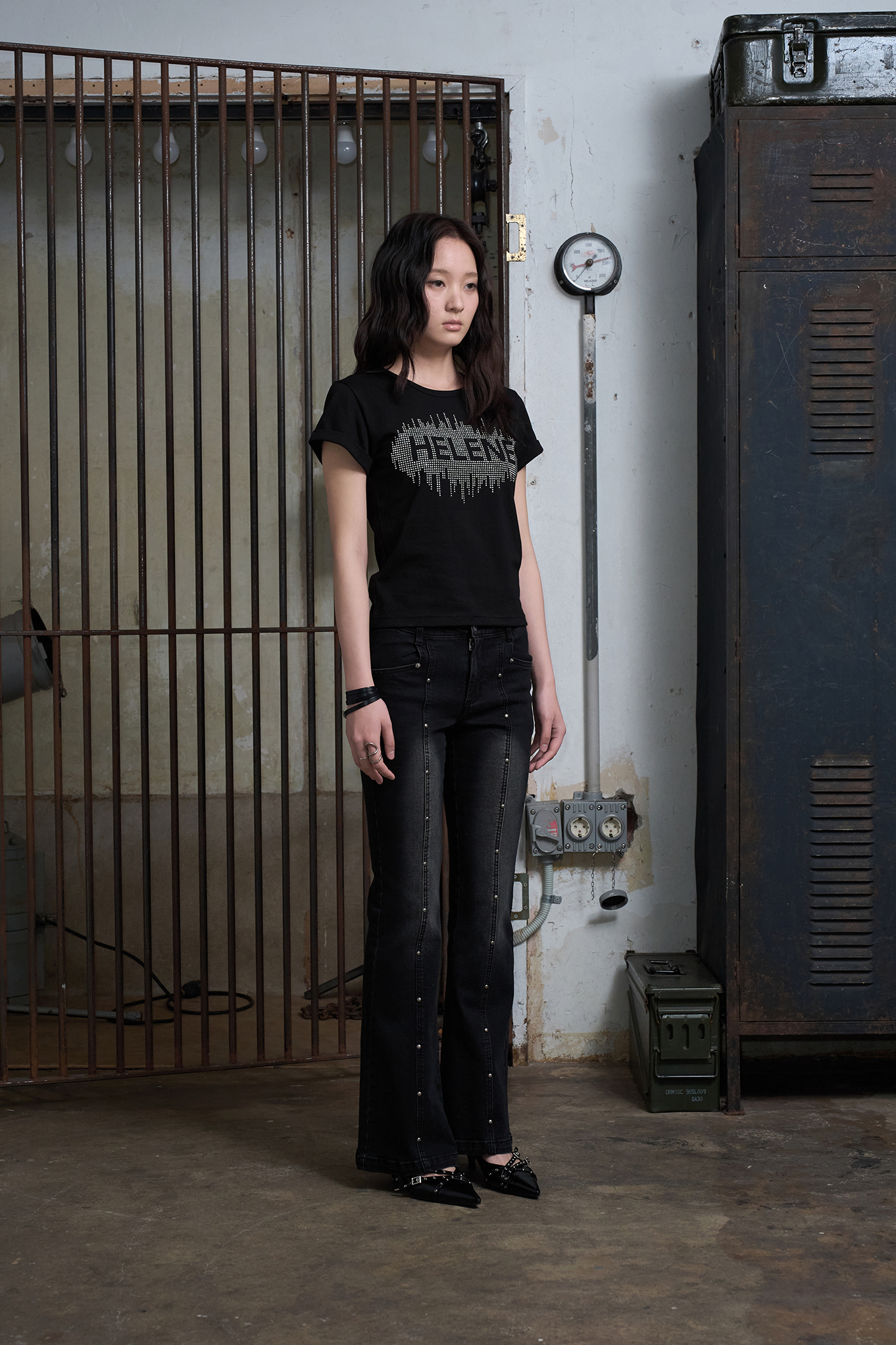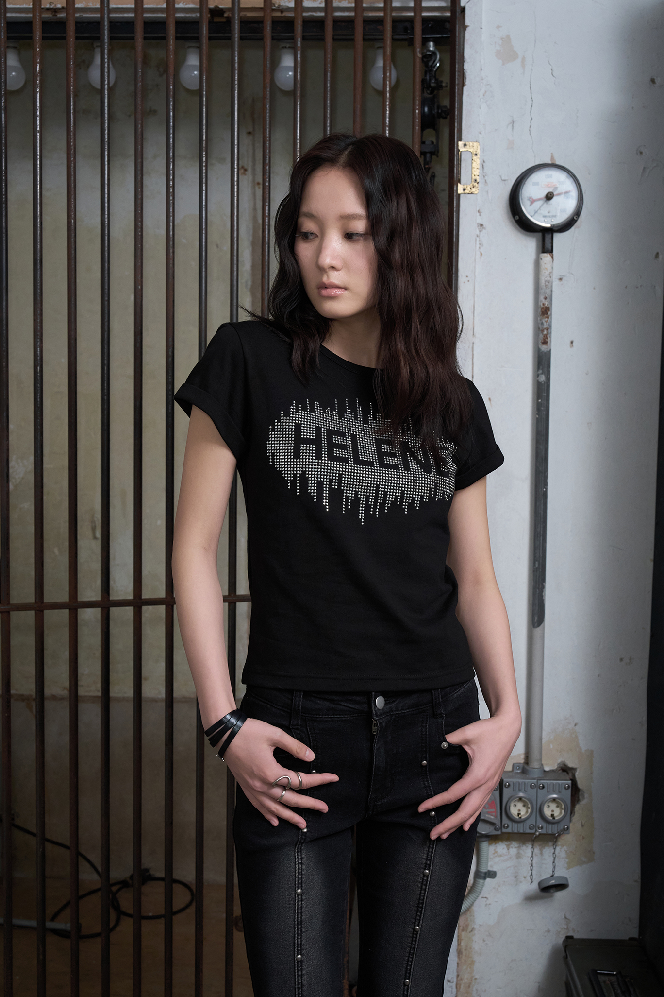 - 와일드한 무드의 스터드를 사용하여 스타일링에 강렬한 포인트를 줍니다.