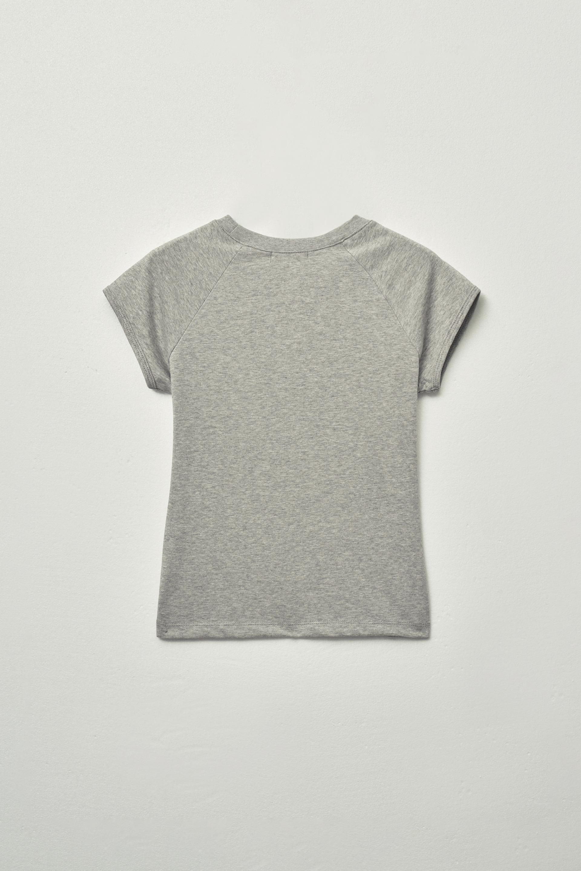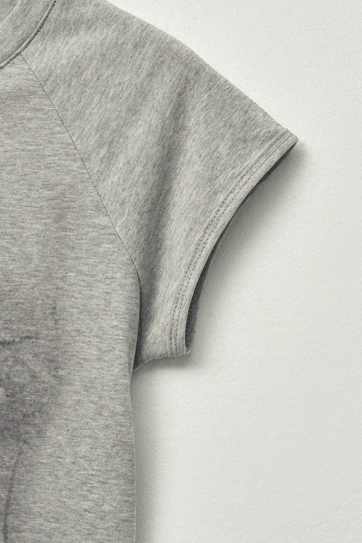 - 숄더 라인을 커버하는 레글런 디테일과 팔이 길어 보이는 숏한 소매 기장,