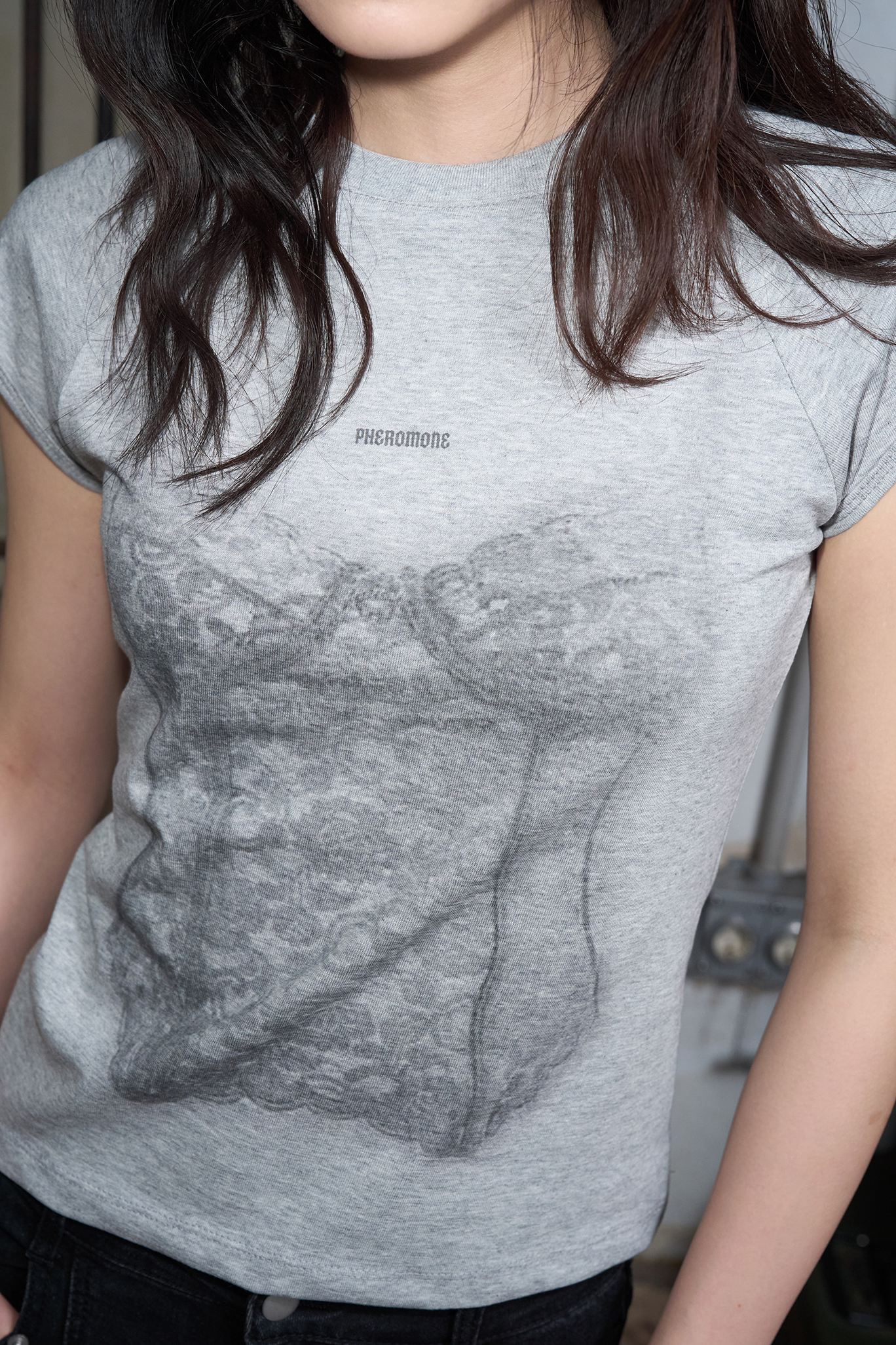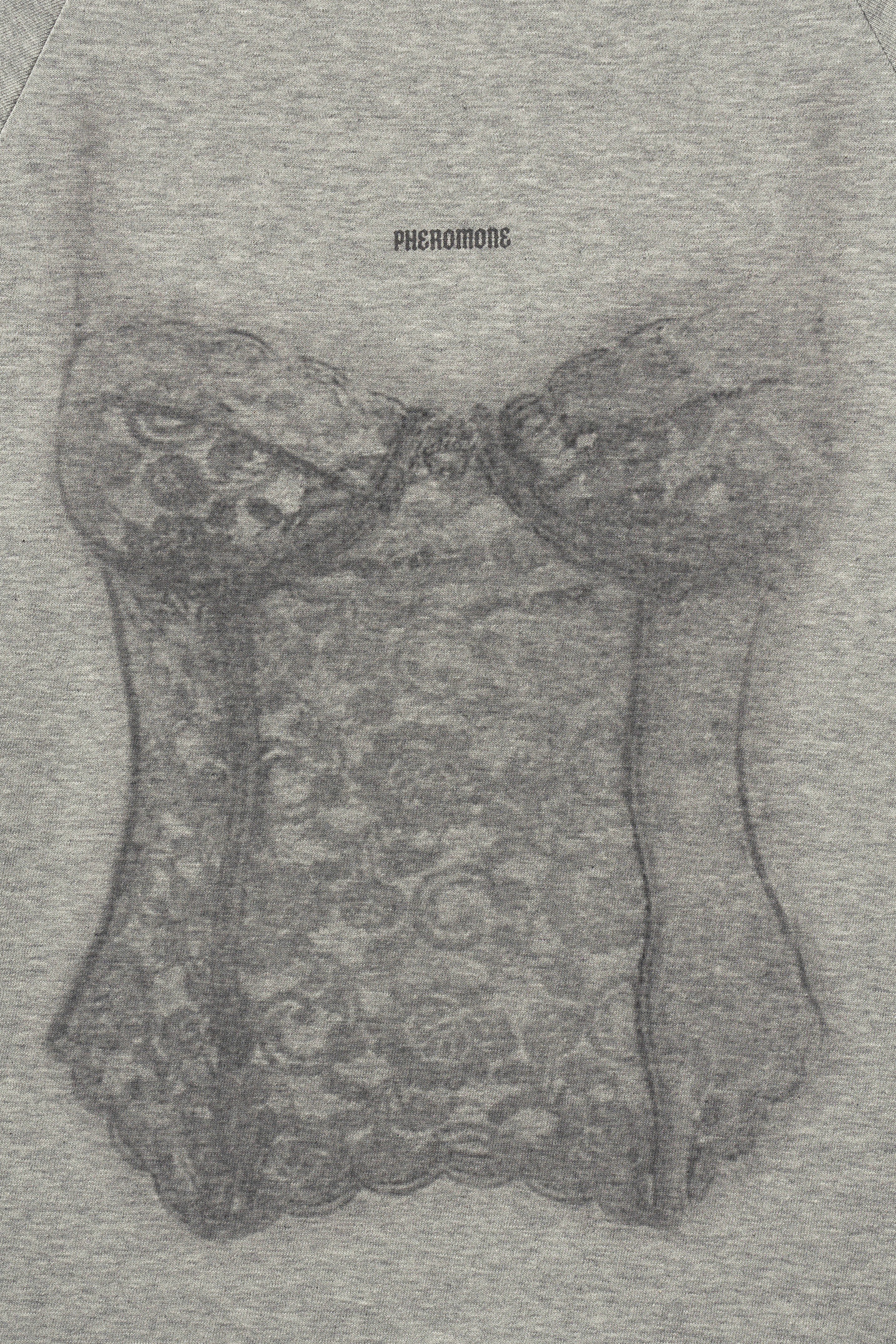 - PHEROMONE 텍스트와 코르셋 디지털 프린팅 아트워크를 믹스했습니다.