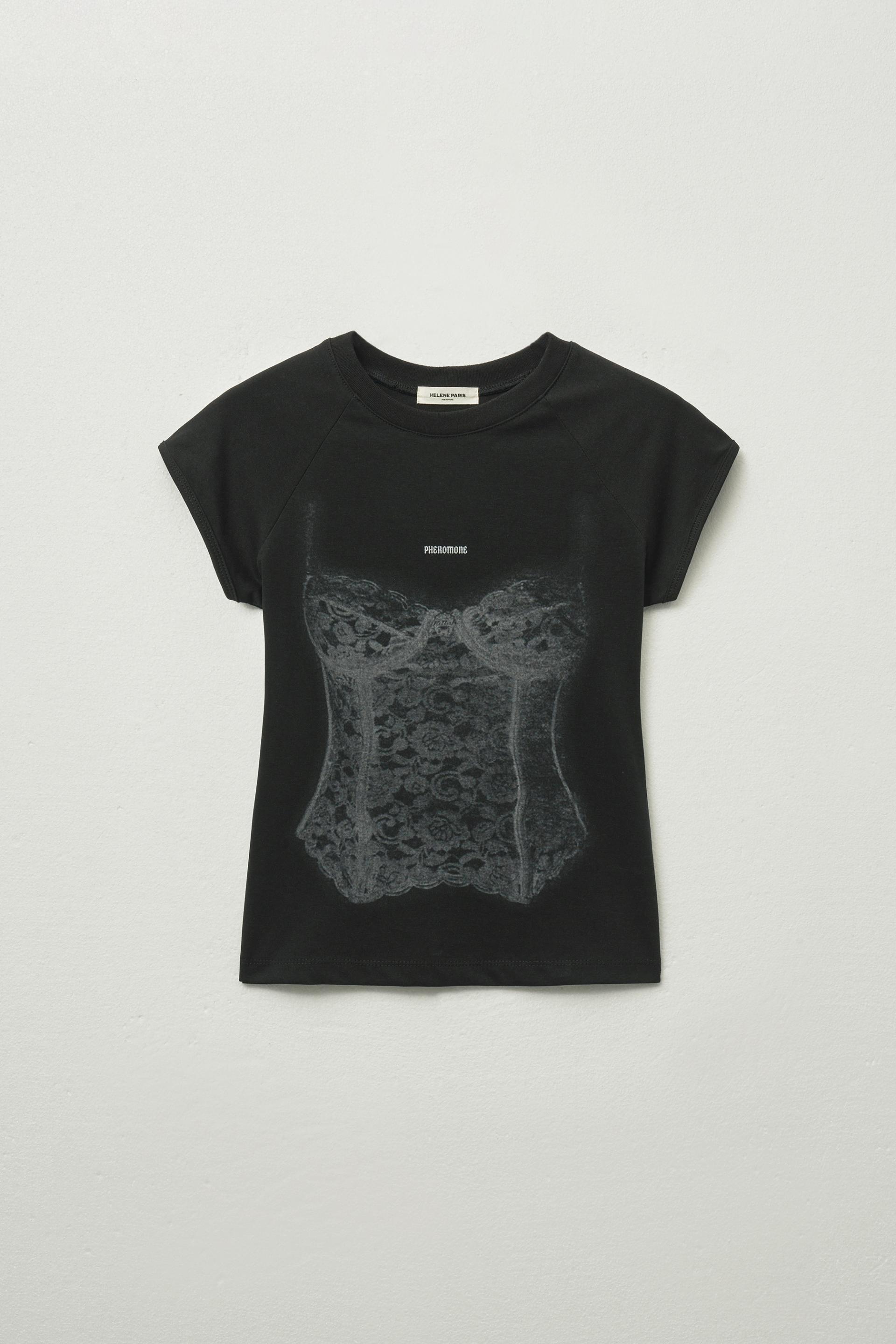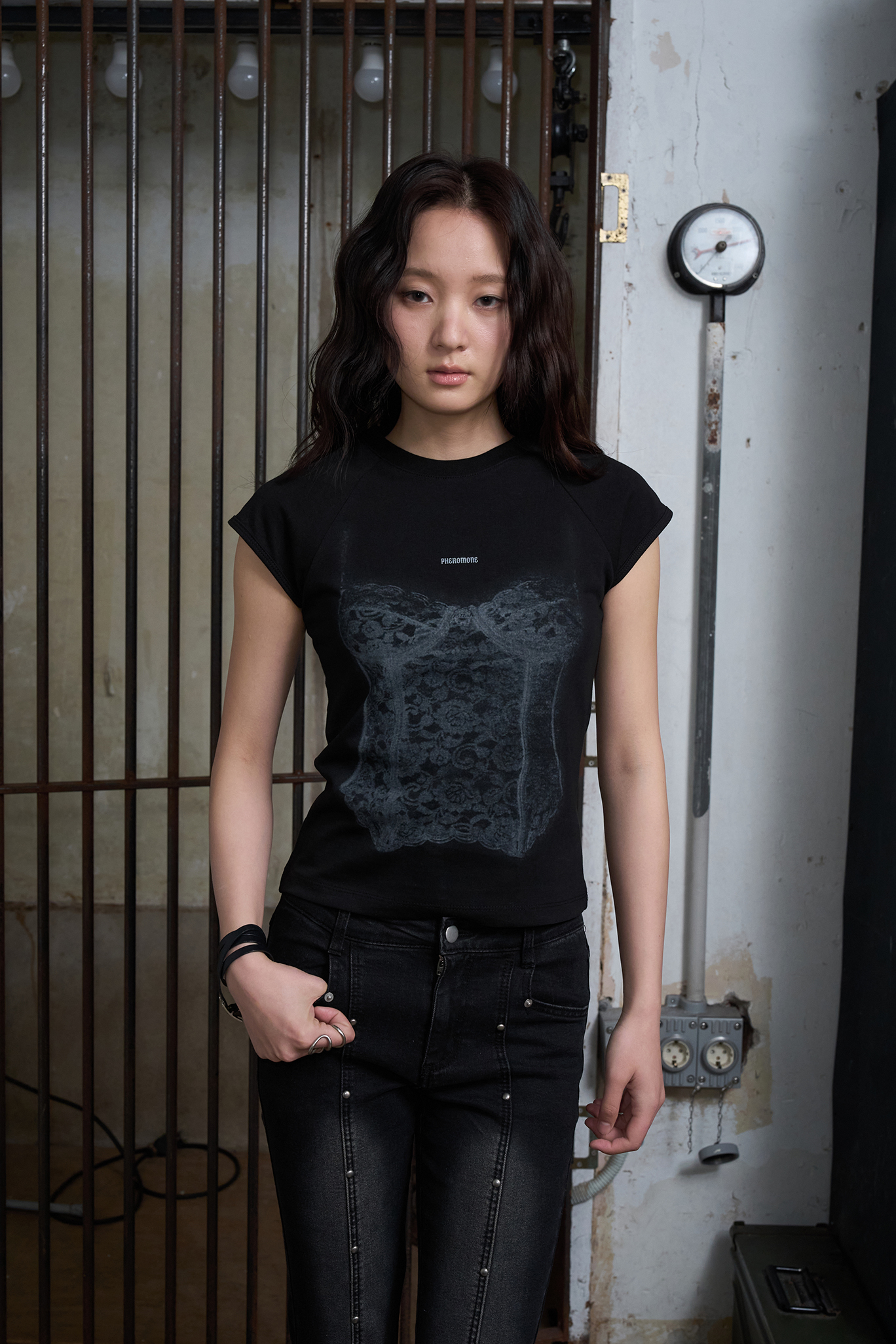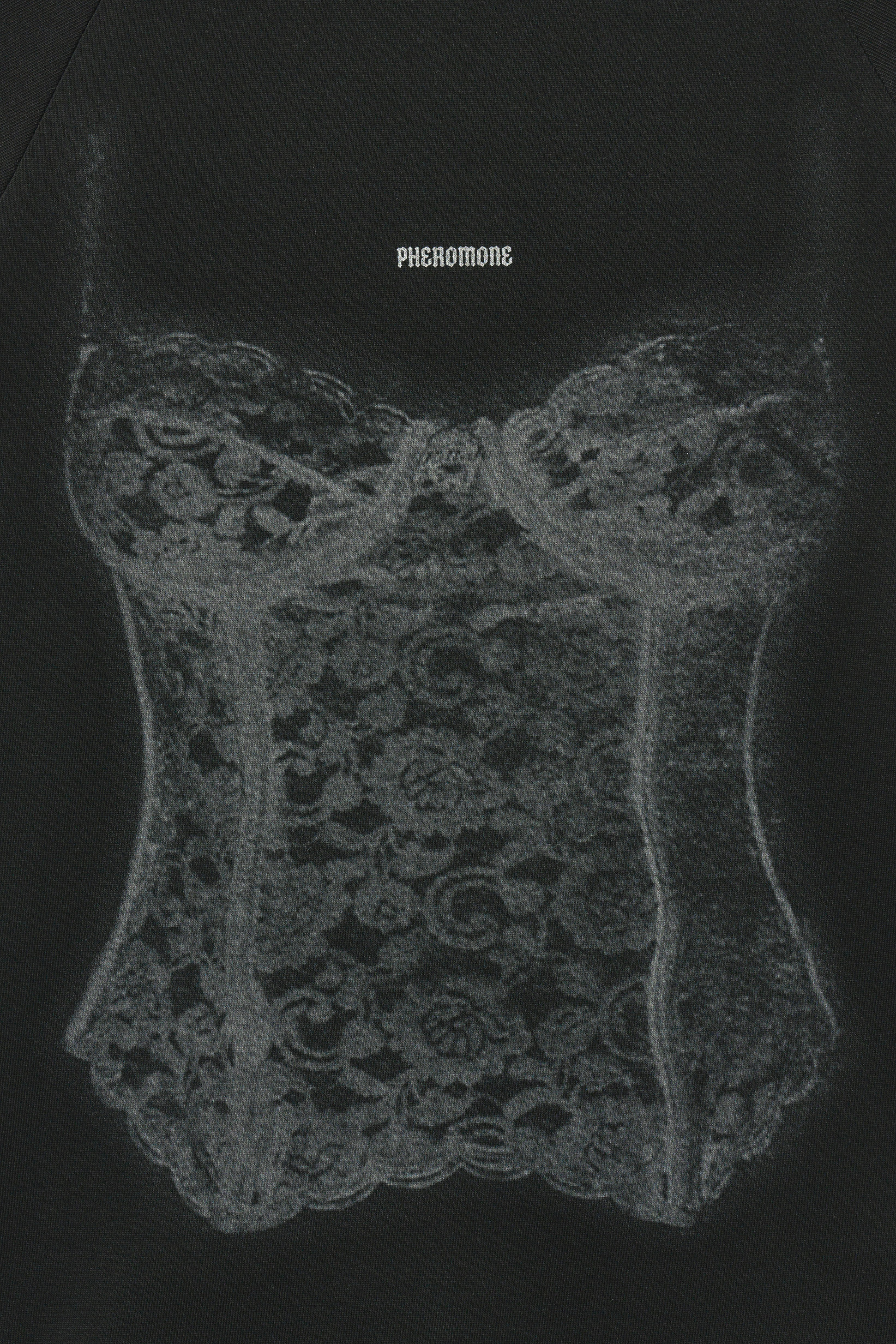 - PHEROMONE 텍스트와 코르셋 디지털 프린트 아트워크를 믹스했습니다.