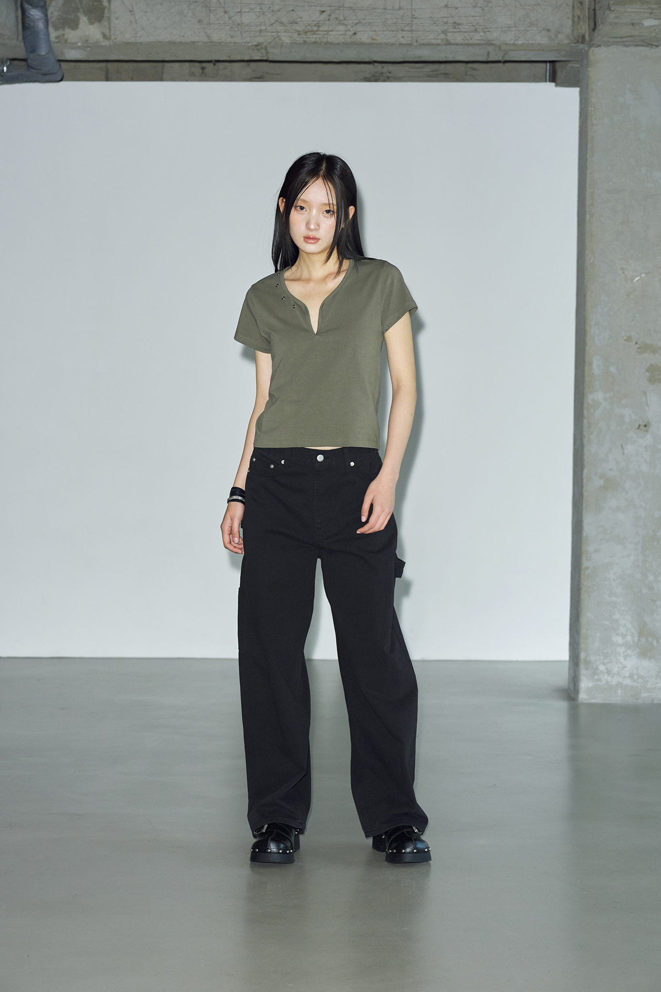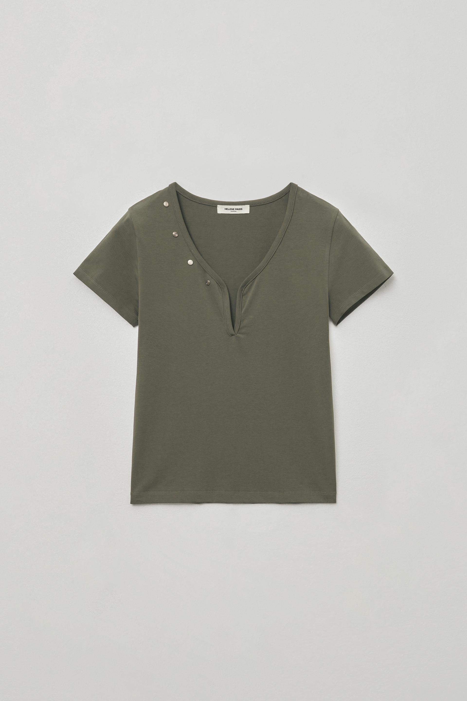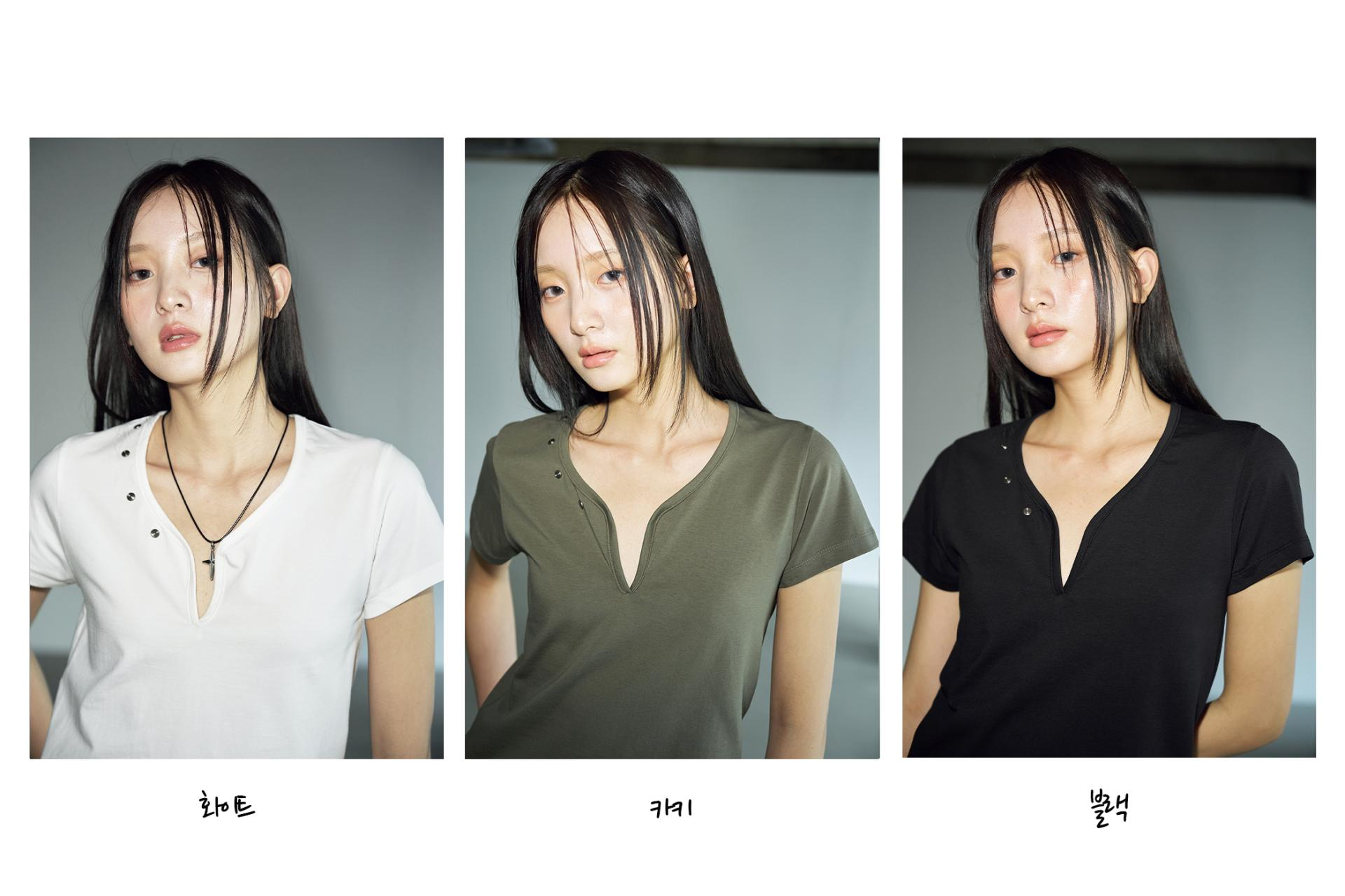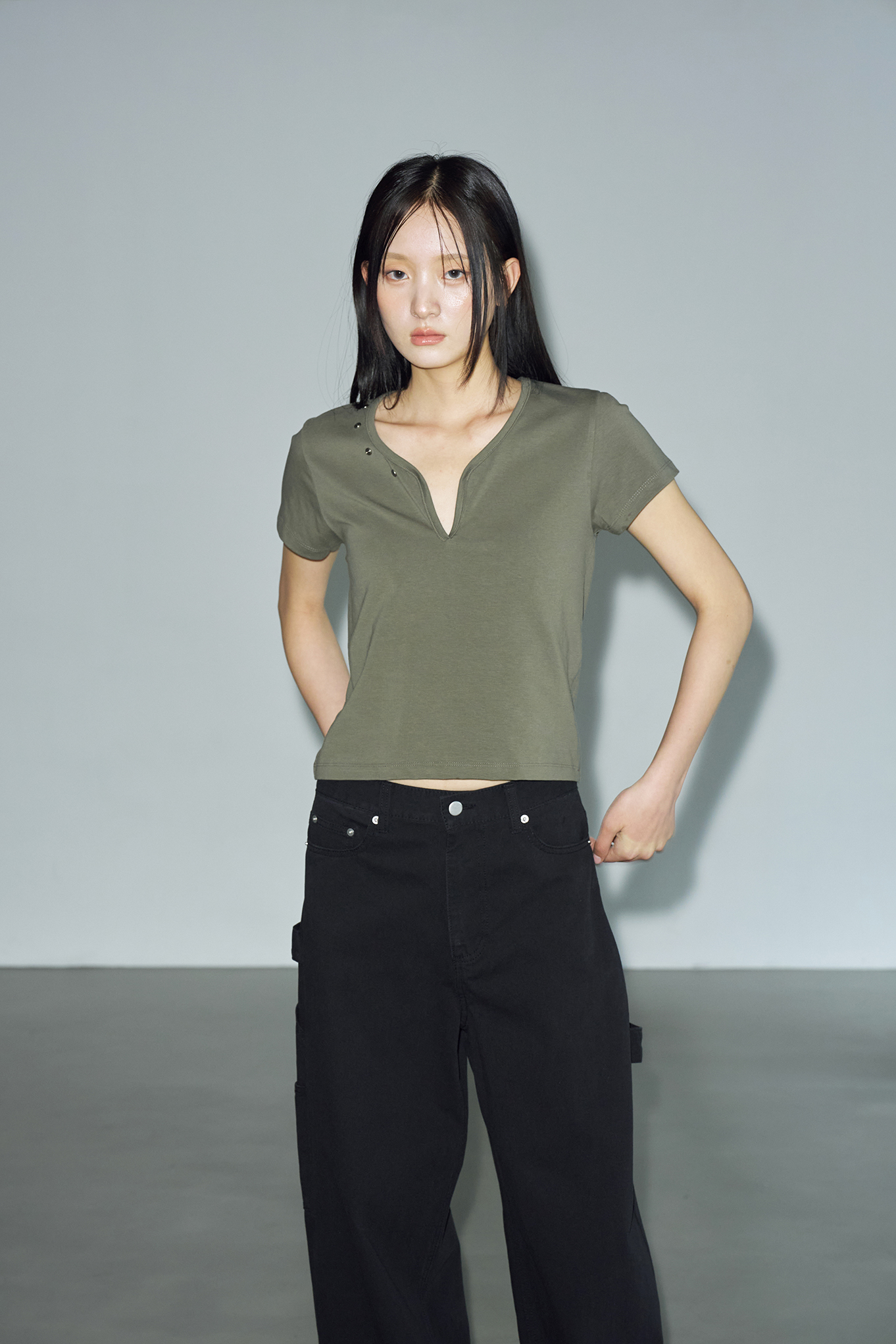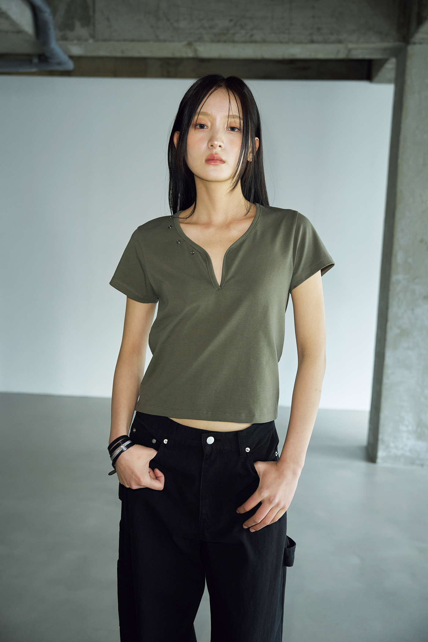 스터드 Y 네크라인 하프 슬리브 [카키]