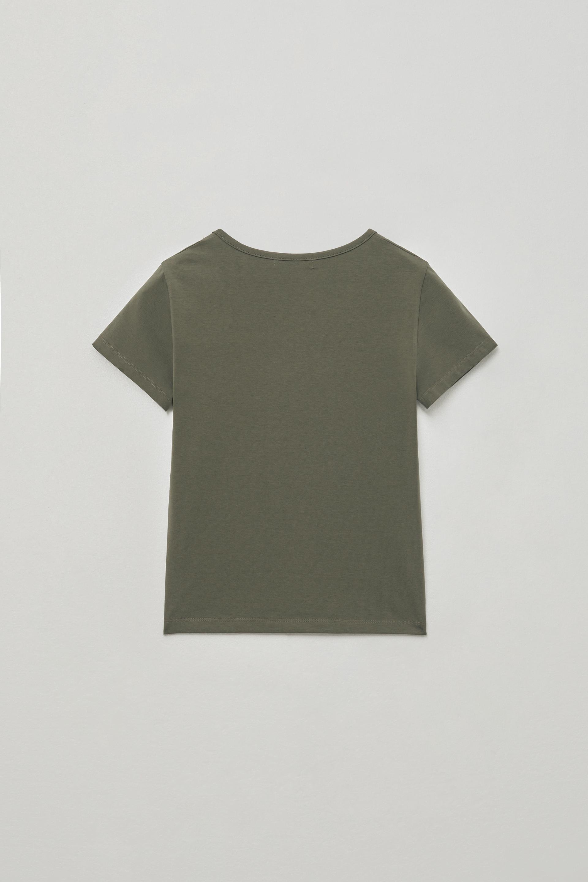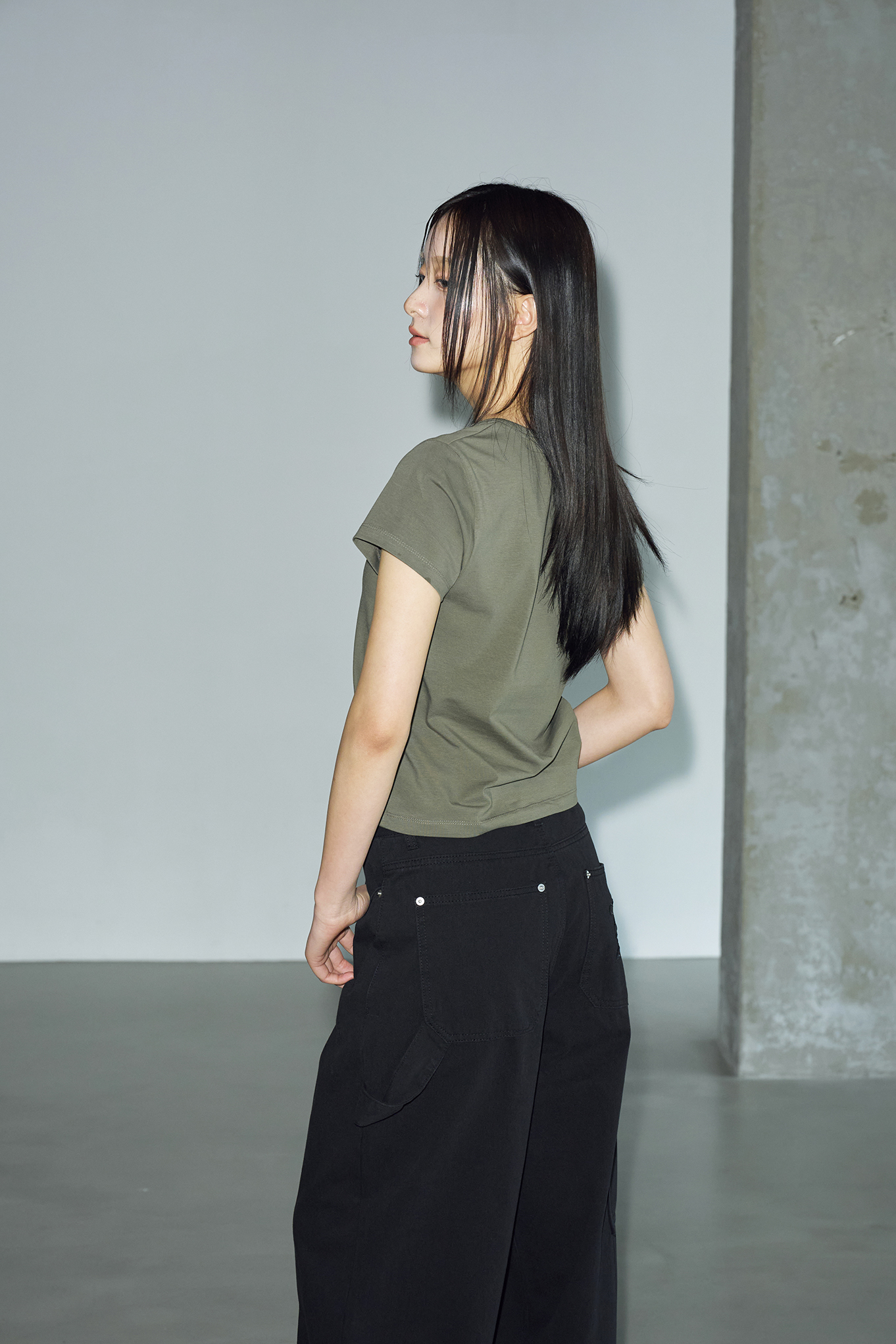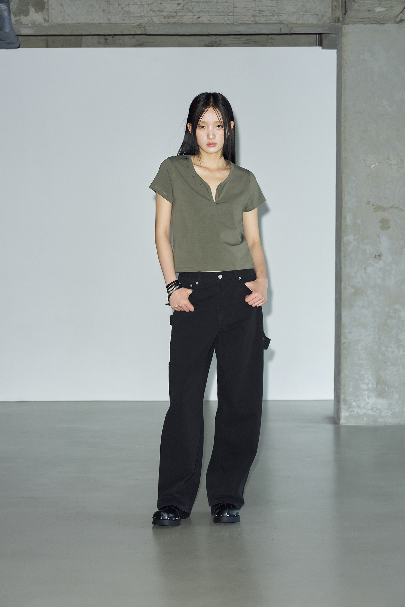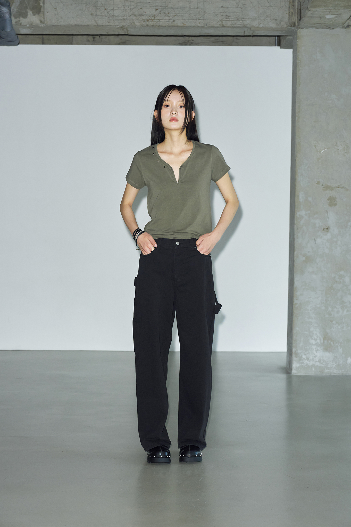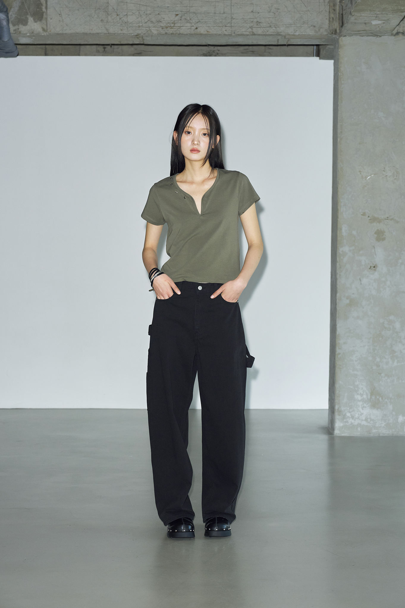 스터드 Y 네크라인 하프 슬리브 [카키]