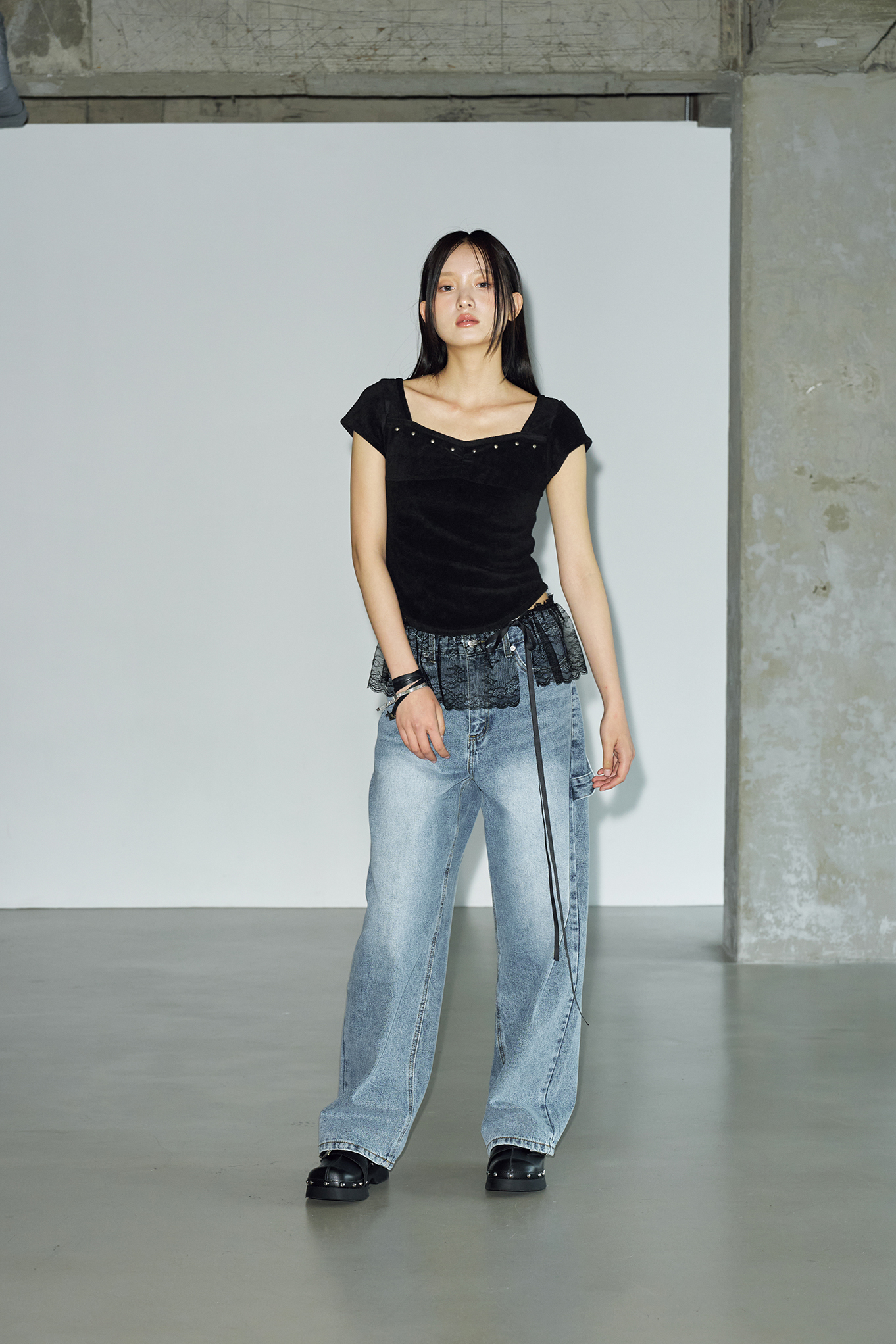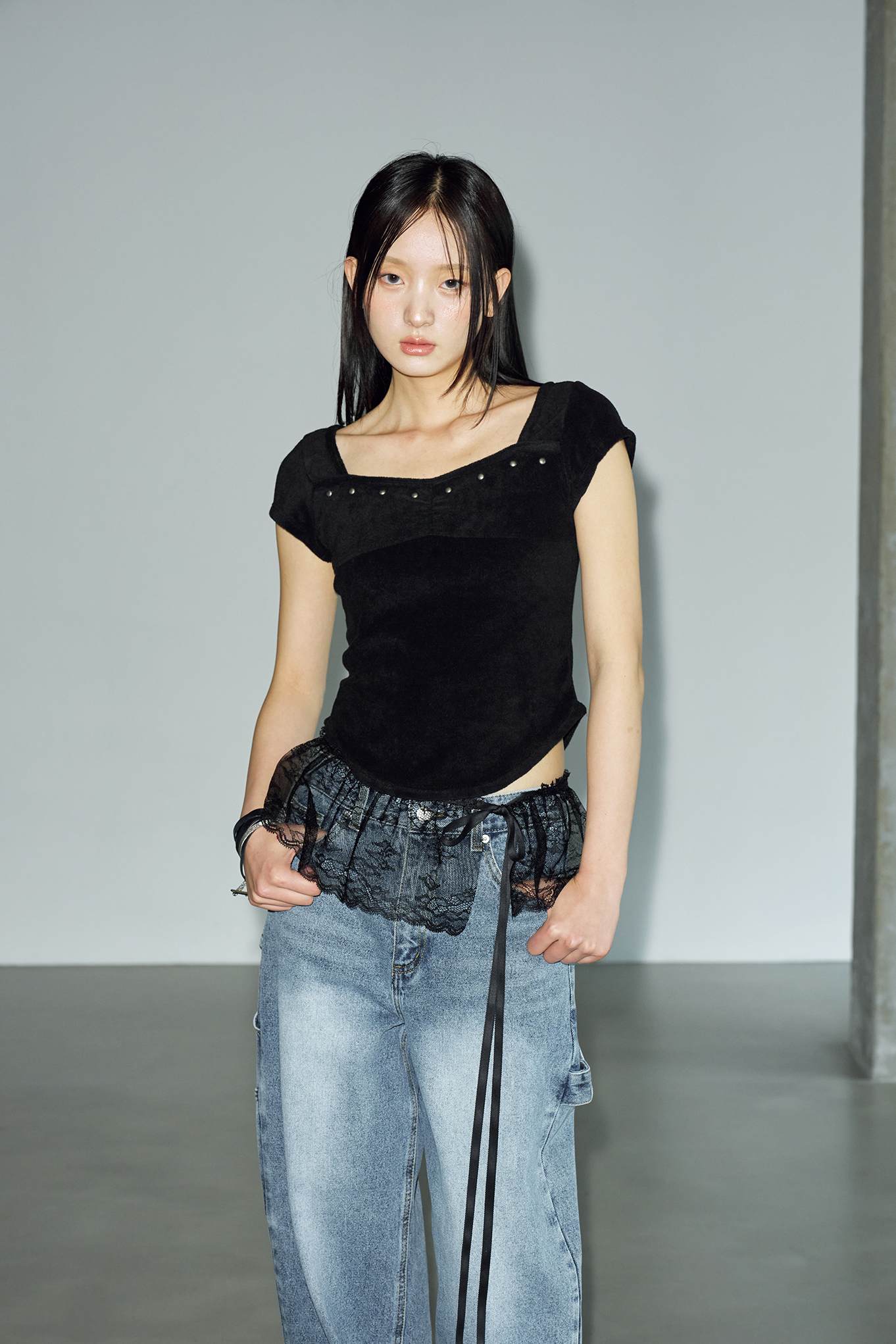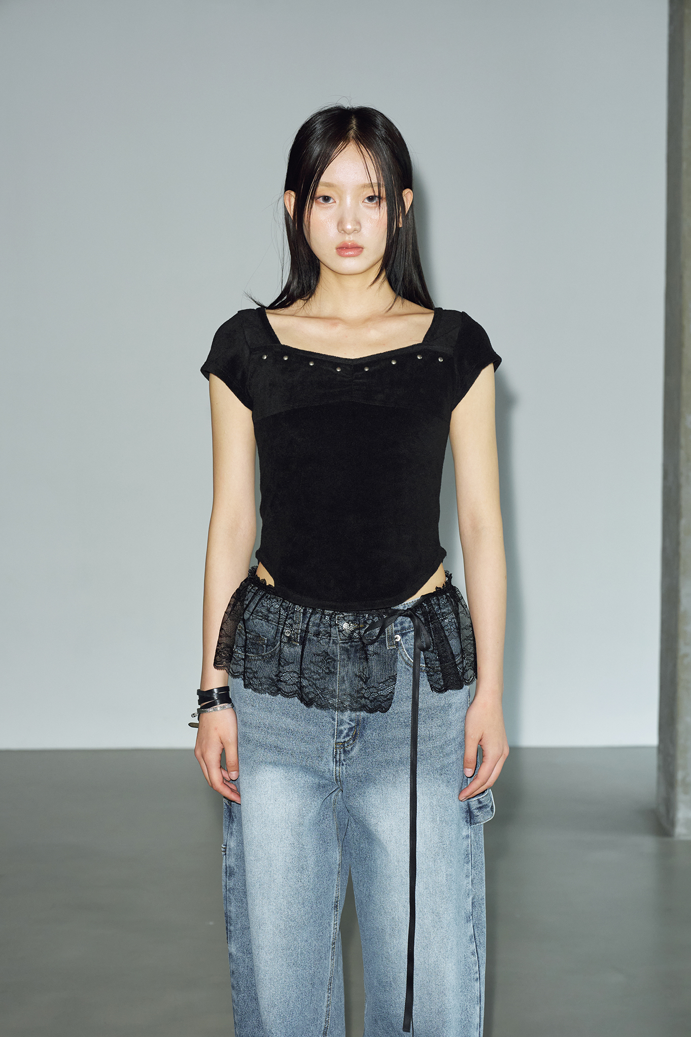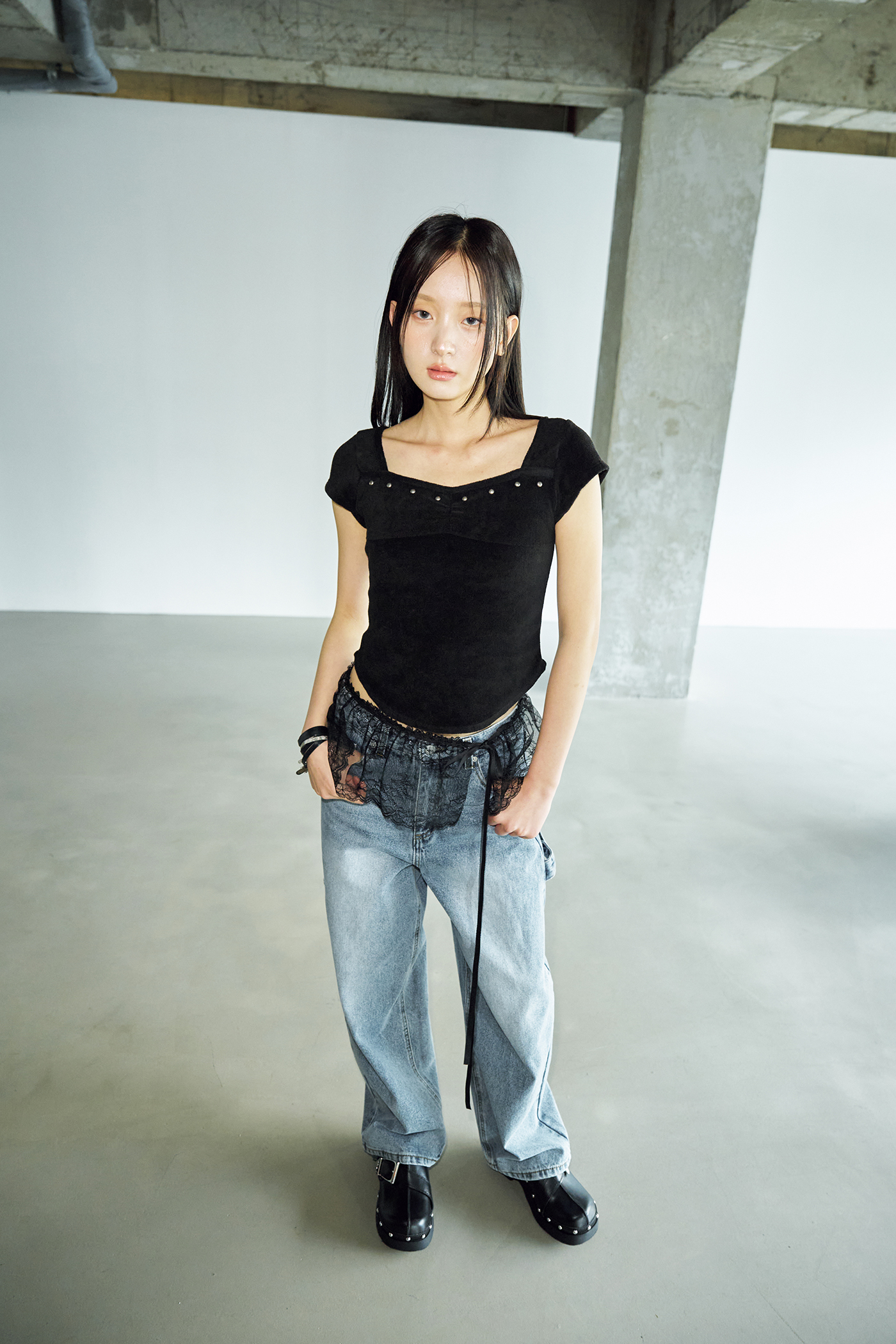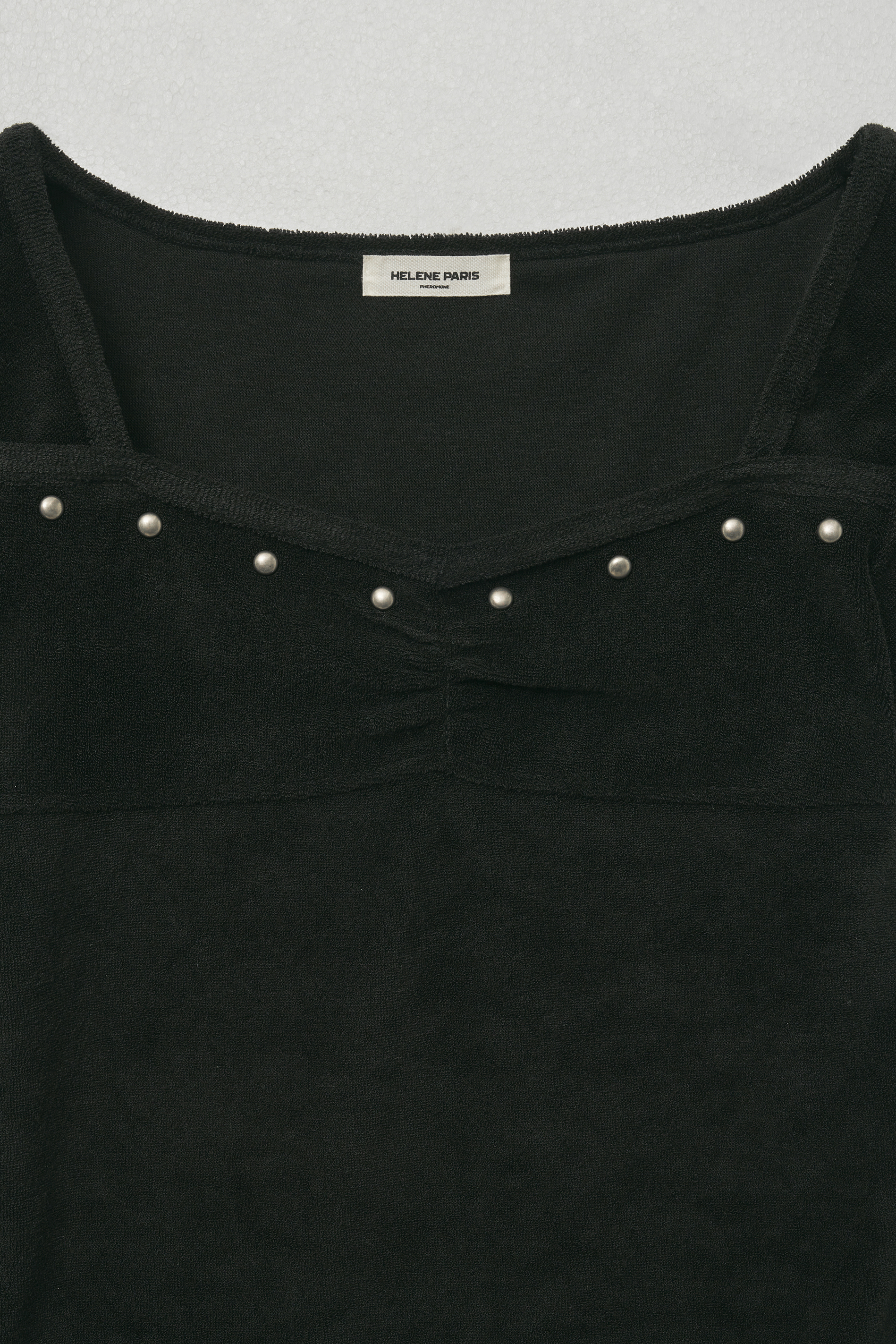 테리 스터드 스퀘어 하프 티셔츠 [블랙]