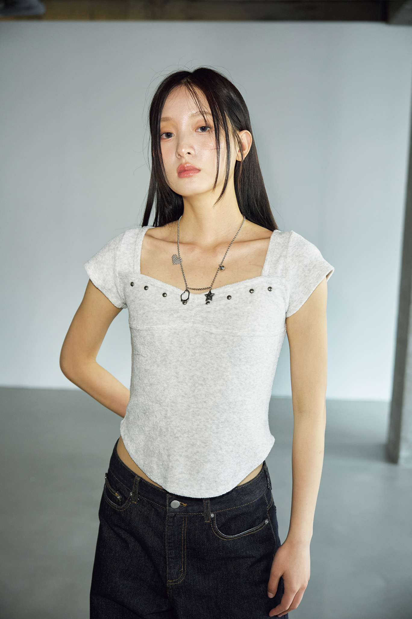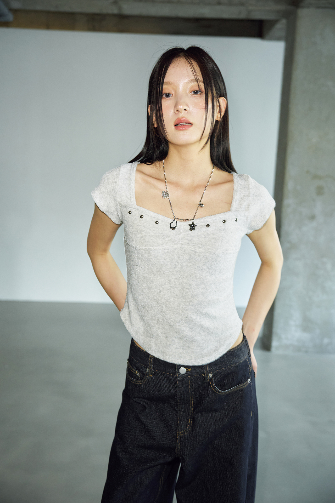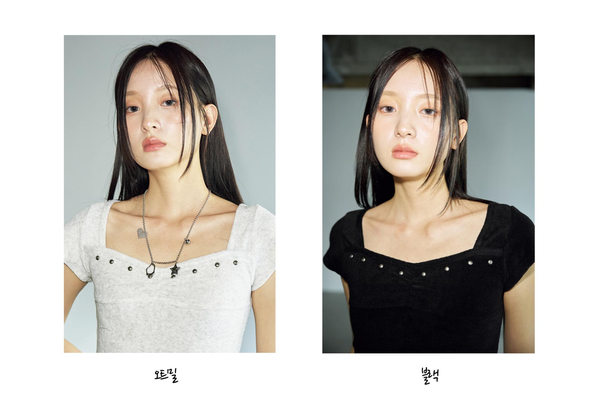 - 체스트 라인에 절개 디테일과 스터드 장식을 더해 유니크하면서도 감각적인 포인트를 더했습니다.