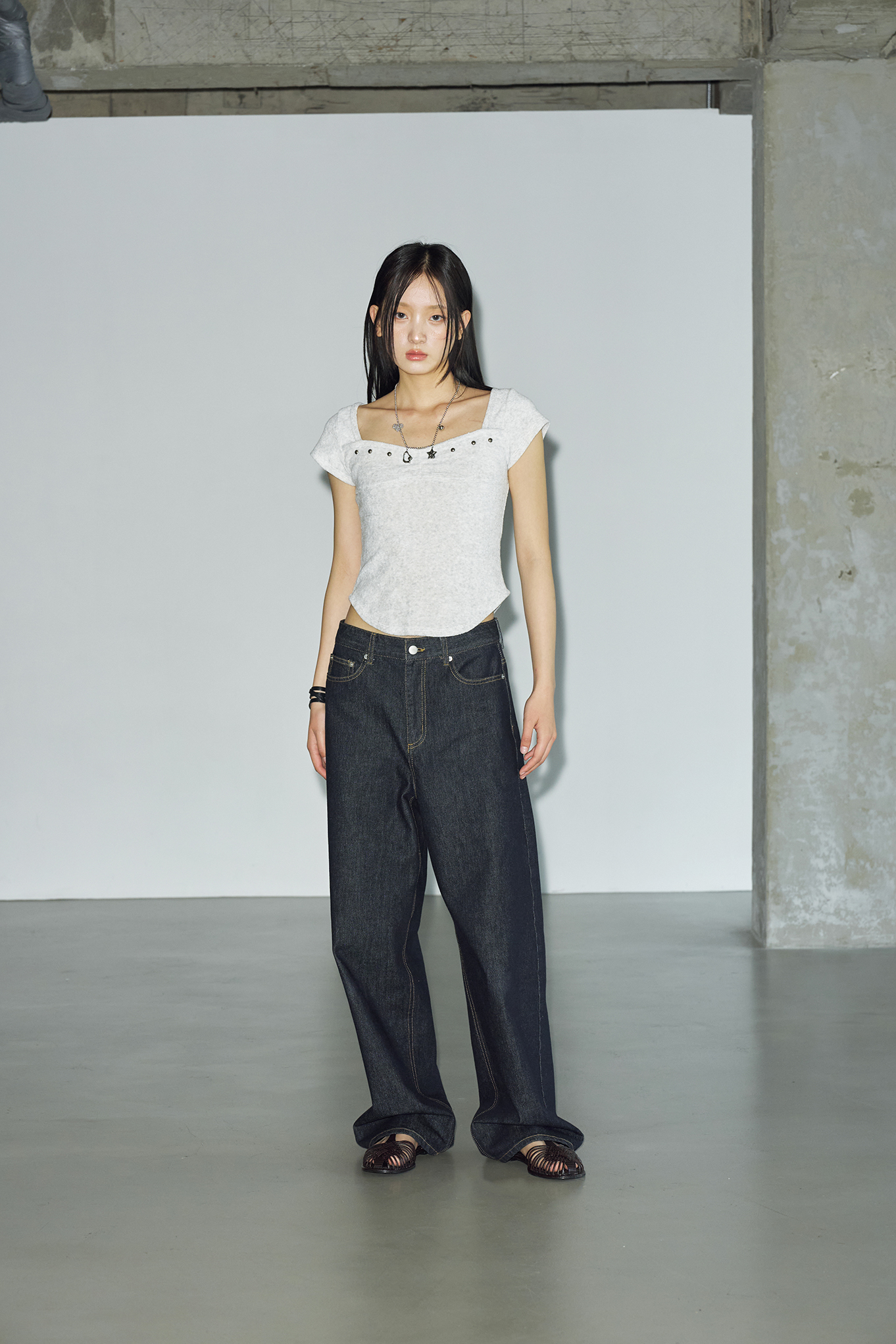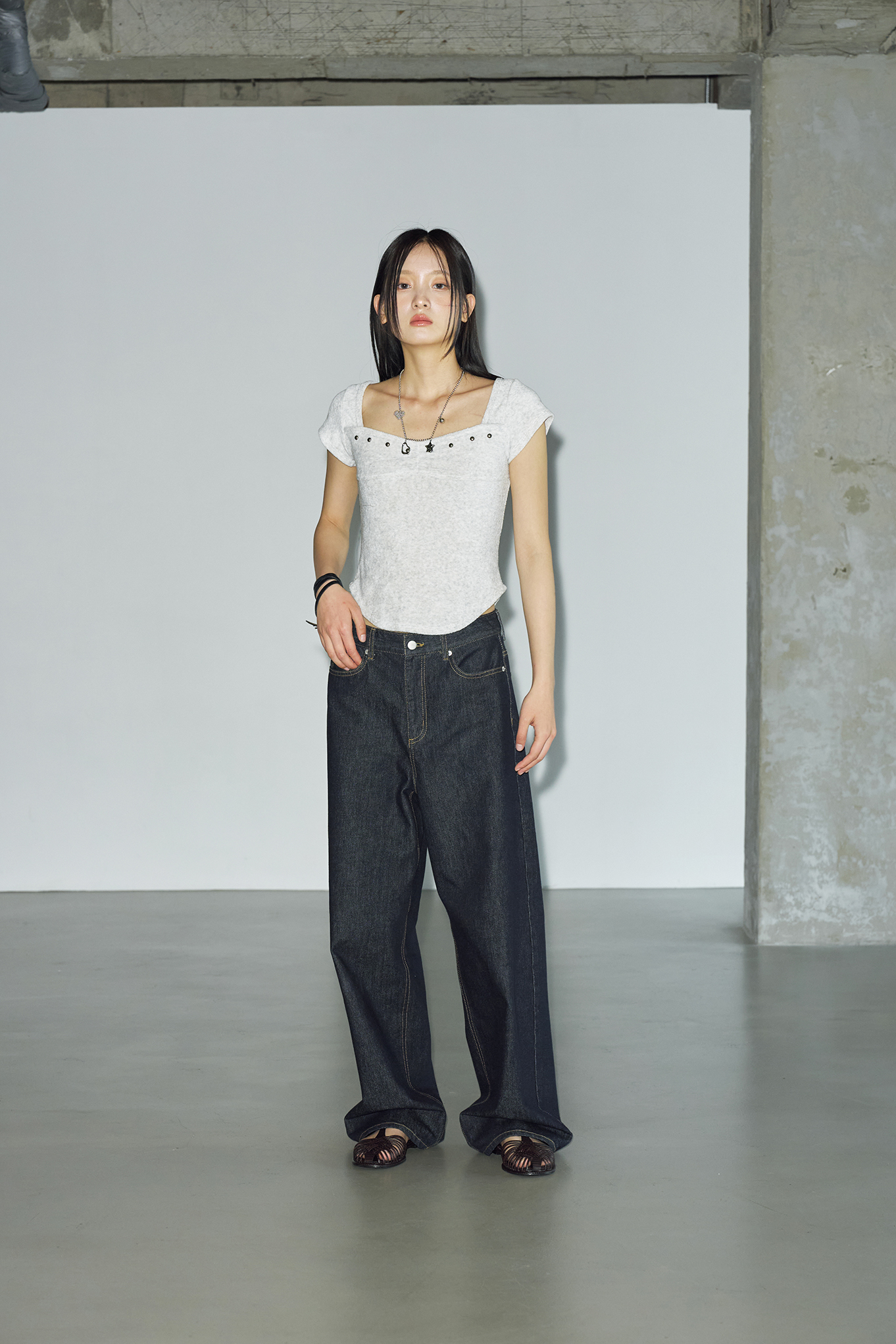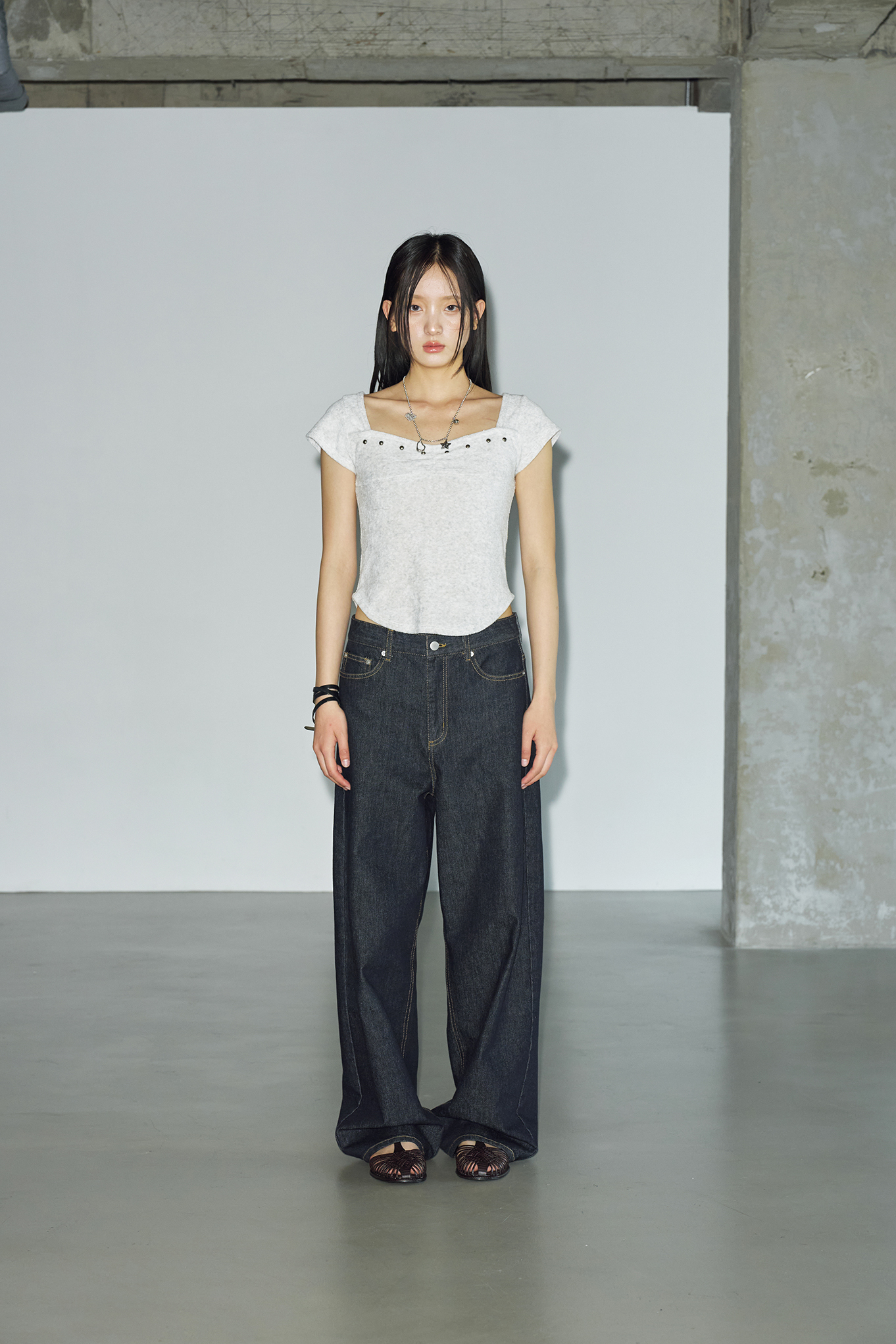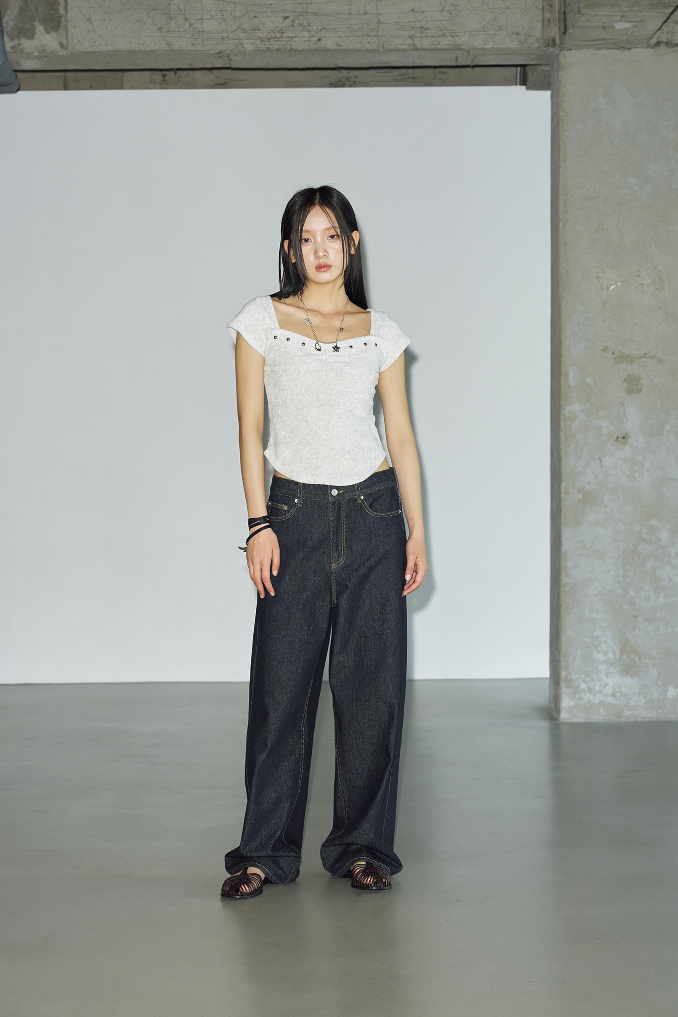 - 체스트 라인에 절개 디테일과 스터드 장식을 더해 유니크하면서도 감각적인 포인트를 더했습니다.