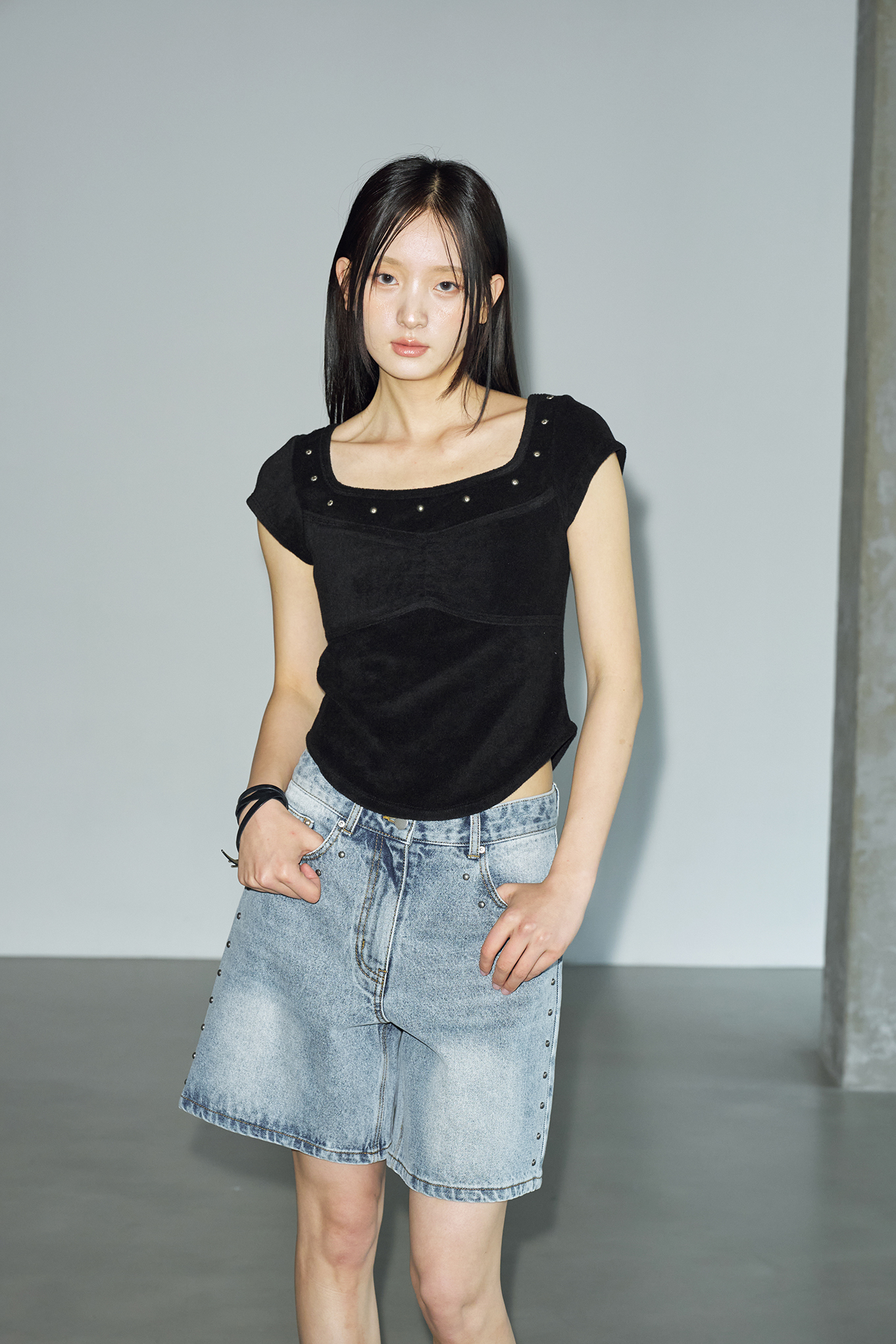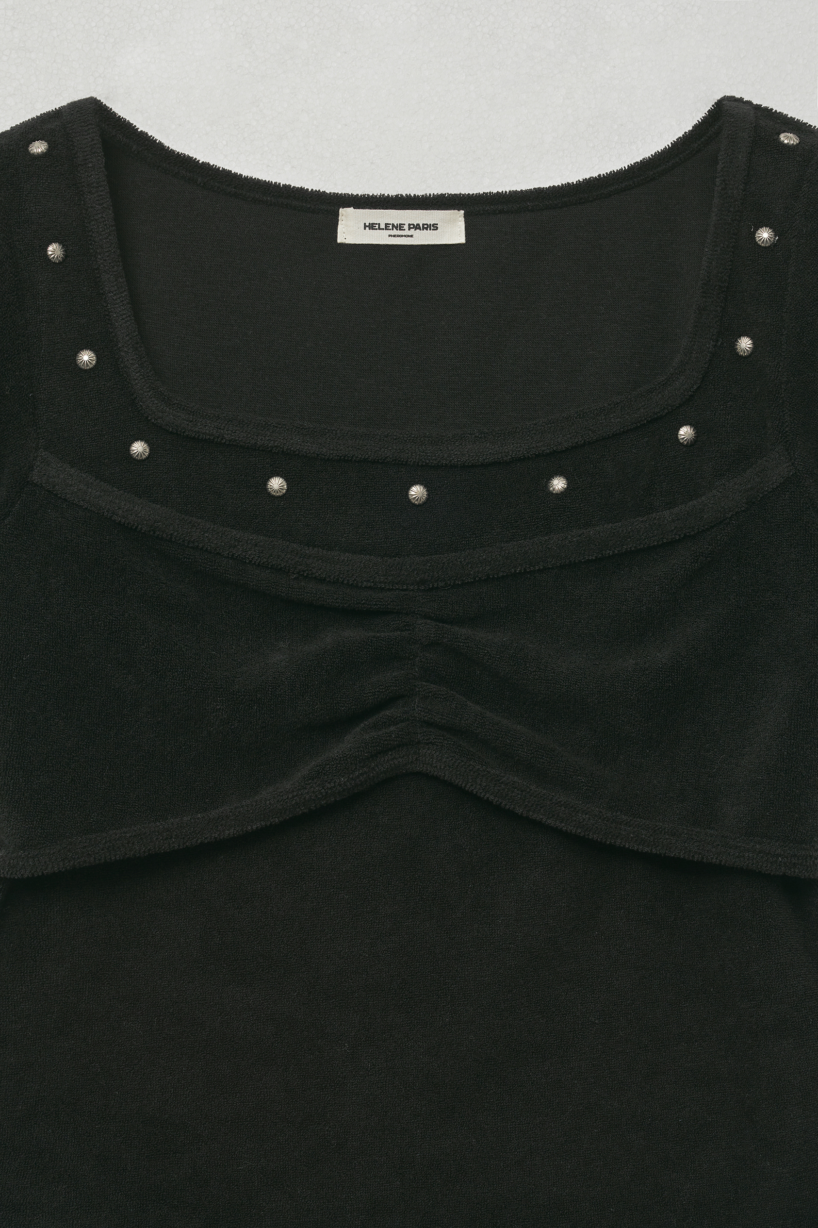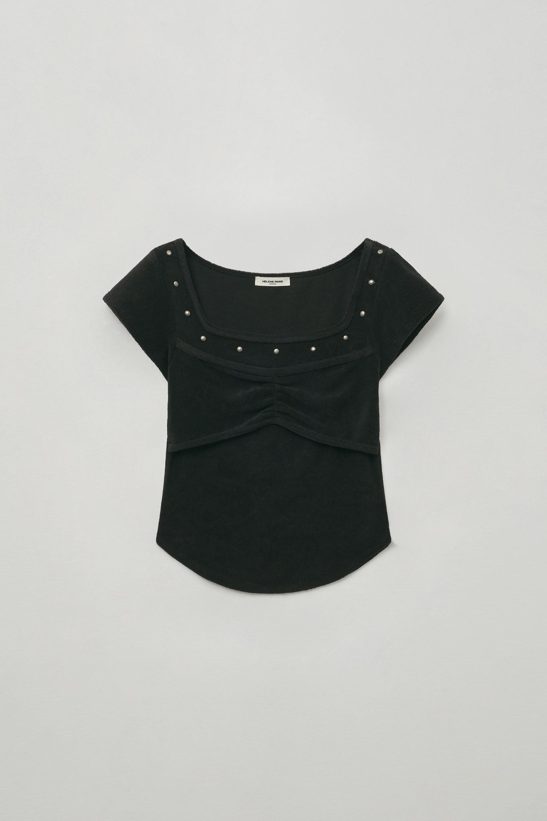 테리 레이어드 셔링 스터드 하프 티셔츠 [블랙]