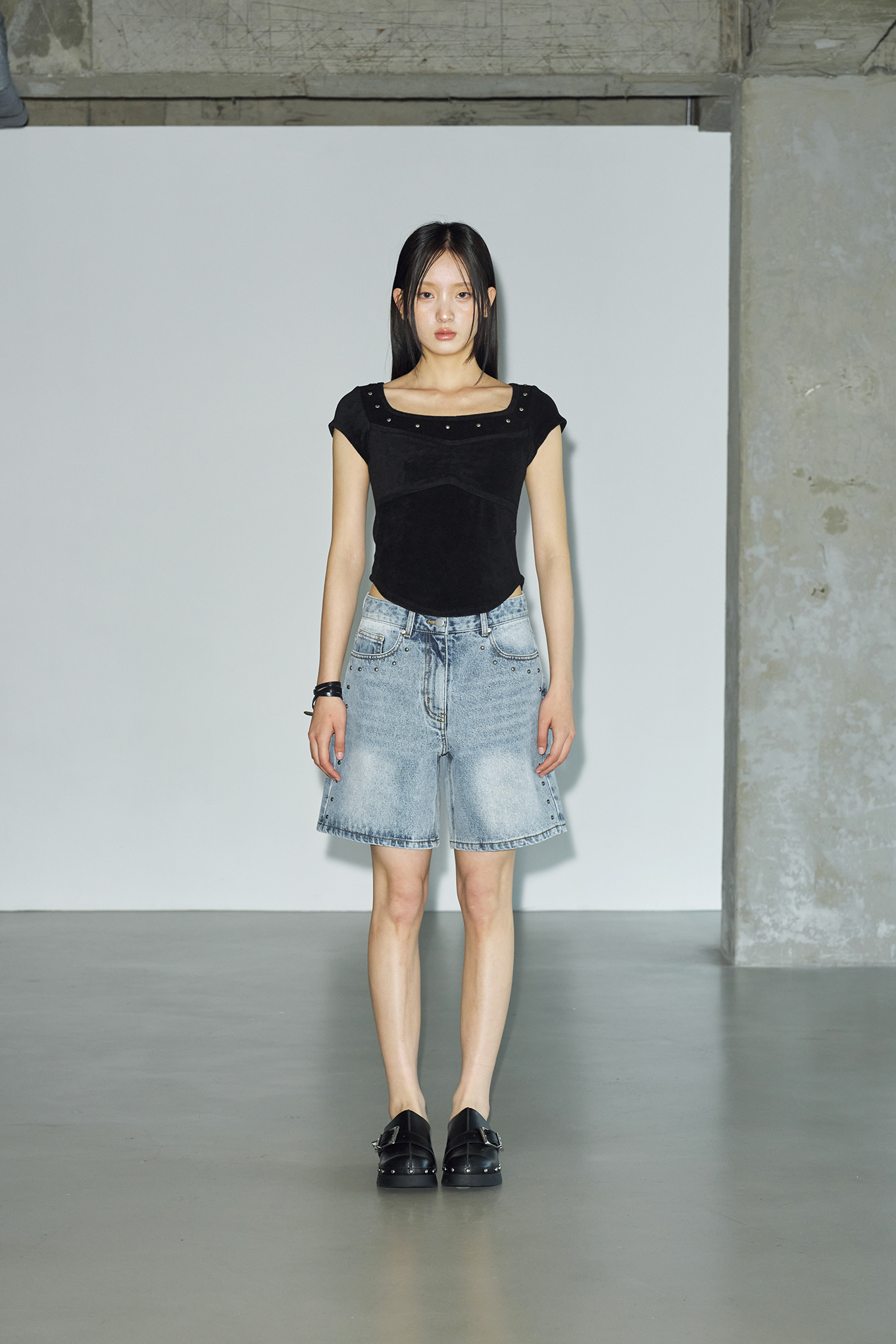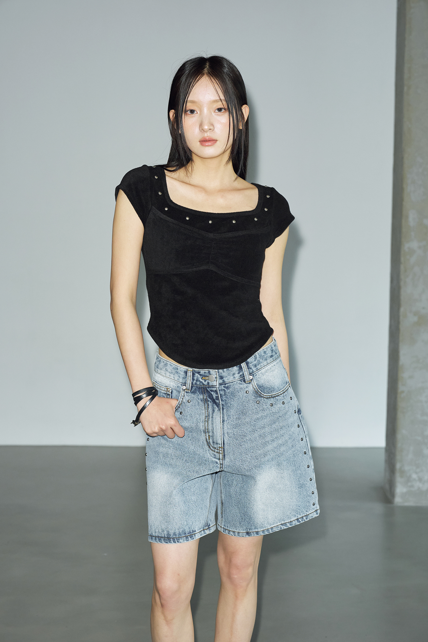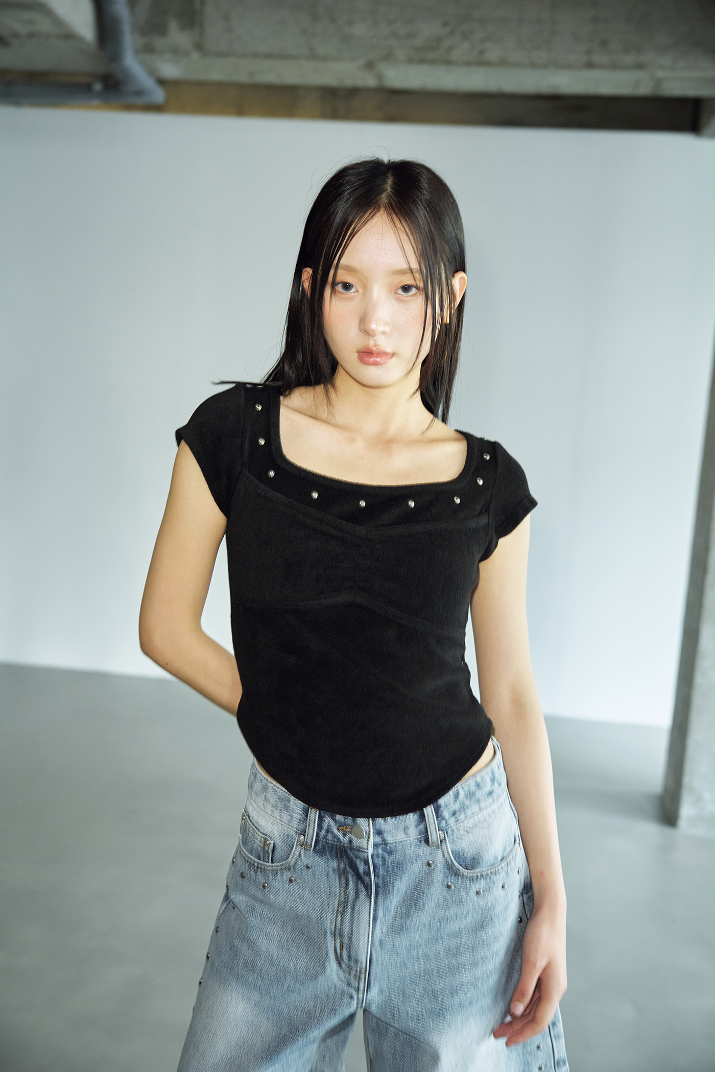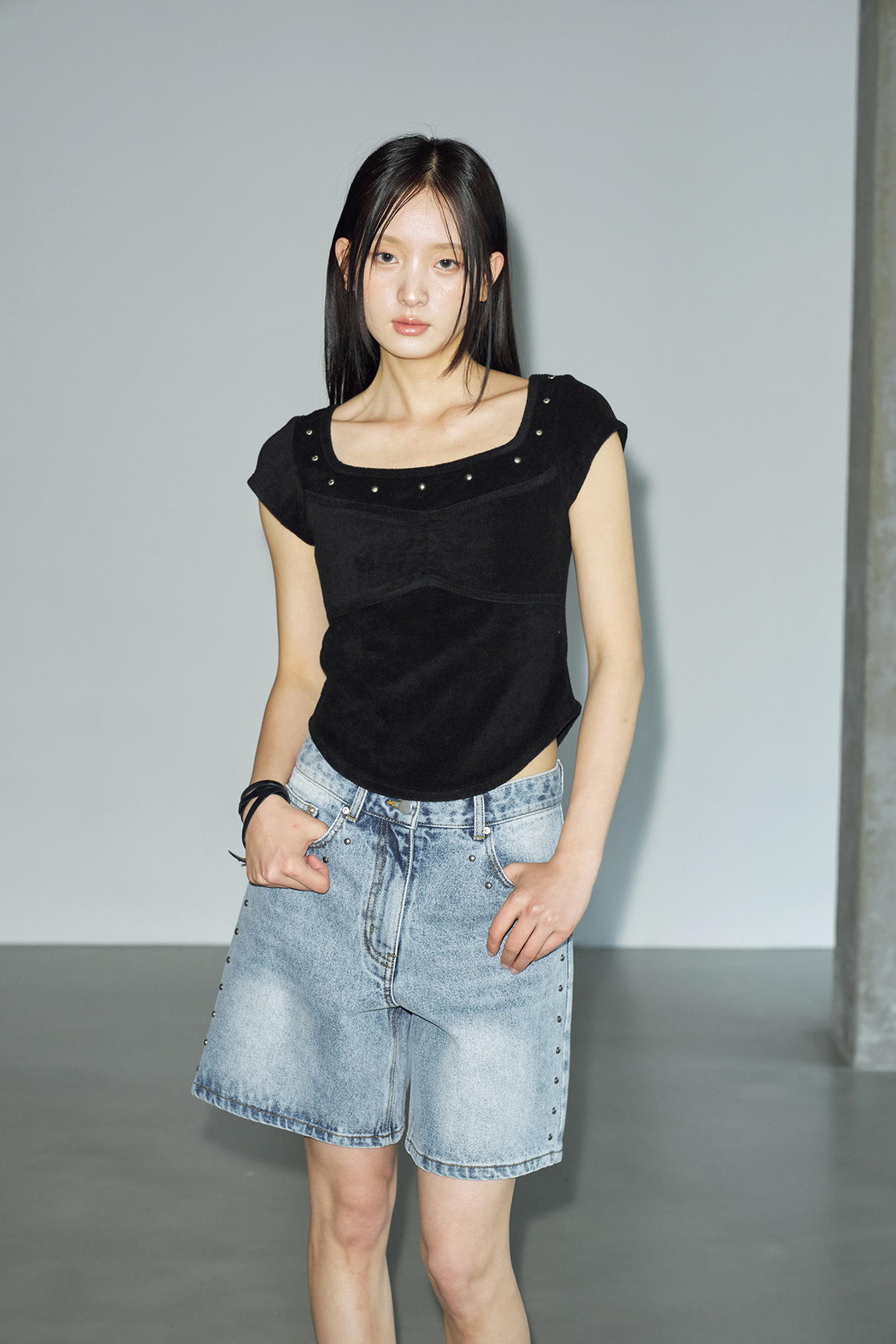 테리 레이어드 셔링 스터드 하프 티셔츠 [블랙]