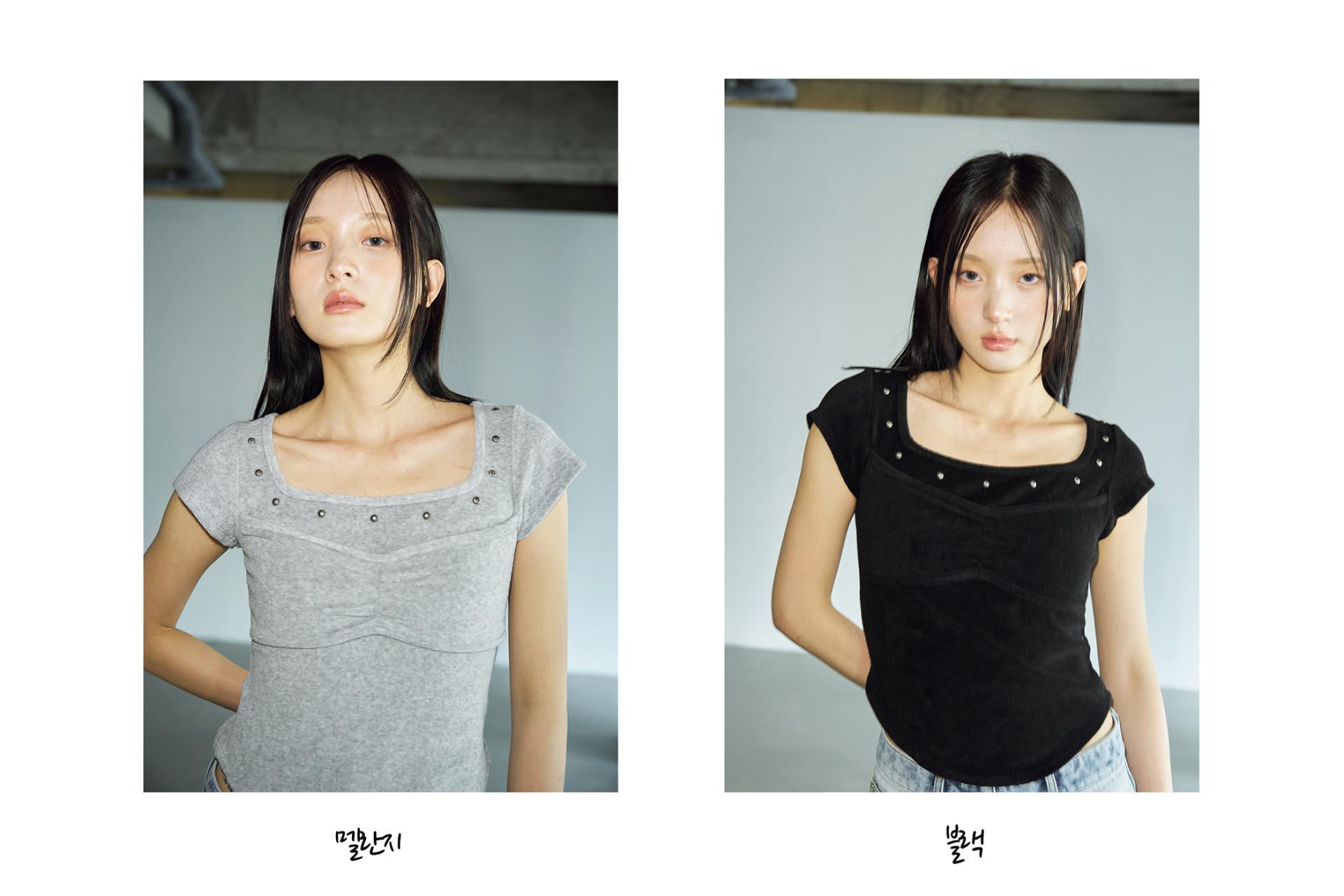 - 테리 패브릭으로 제작되어 부드럽고 편안한 착용감을 자랑하는 셔링 스터드 테리 탑입니다.
