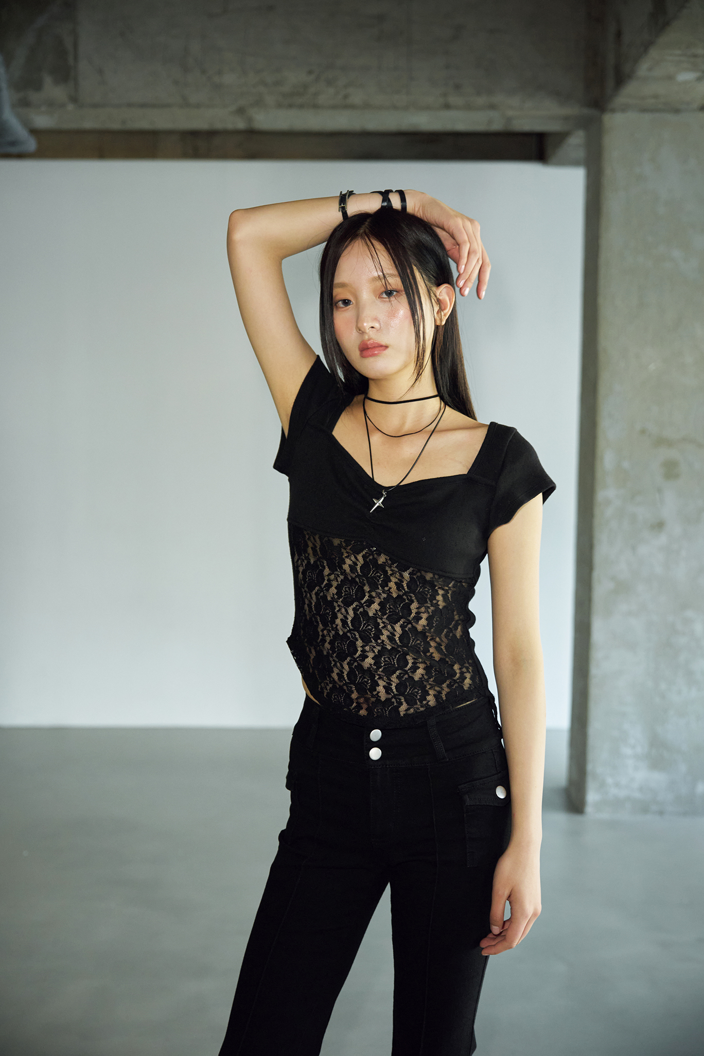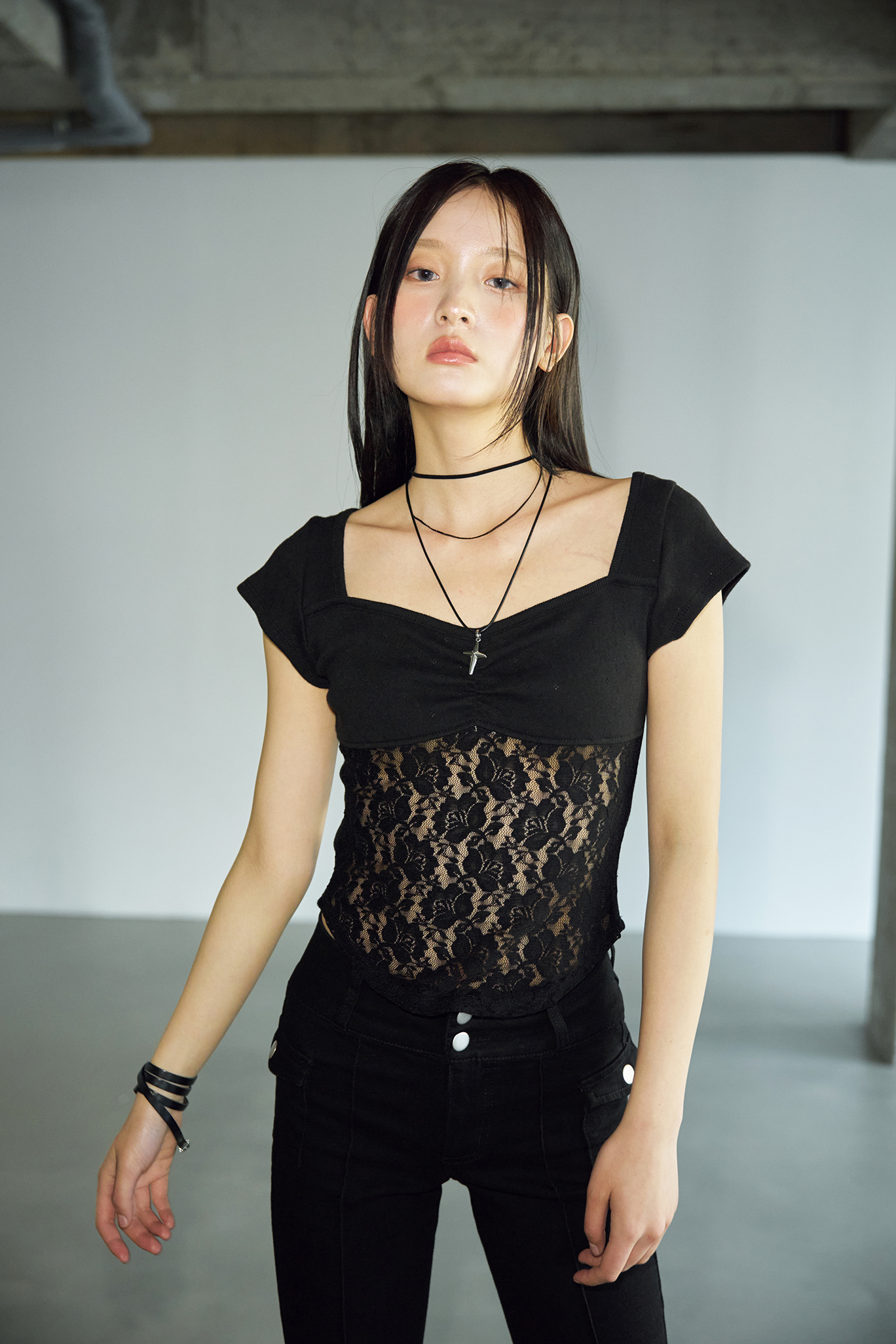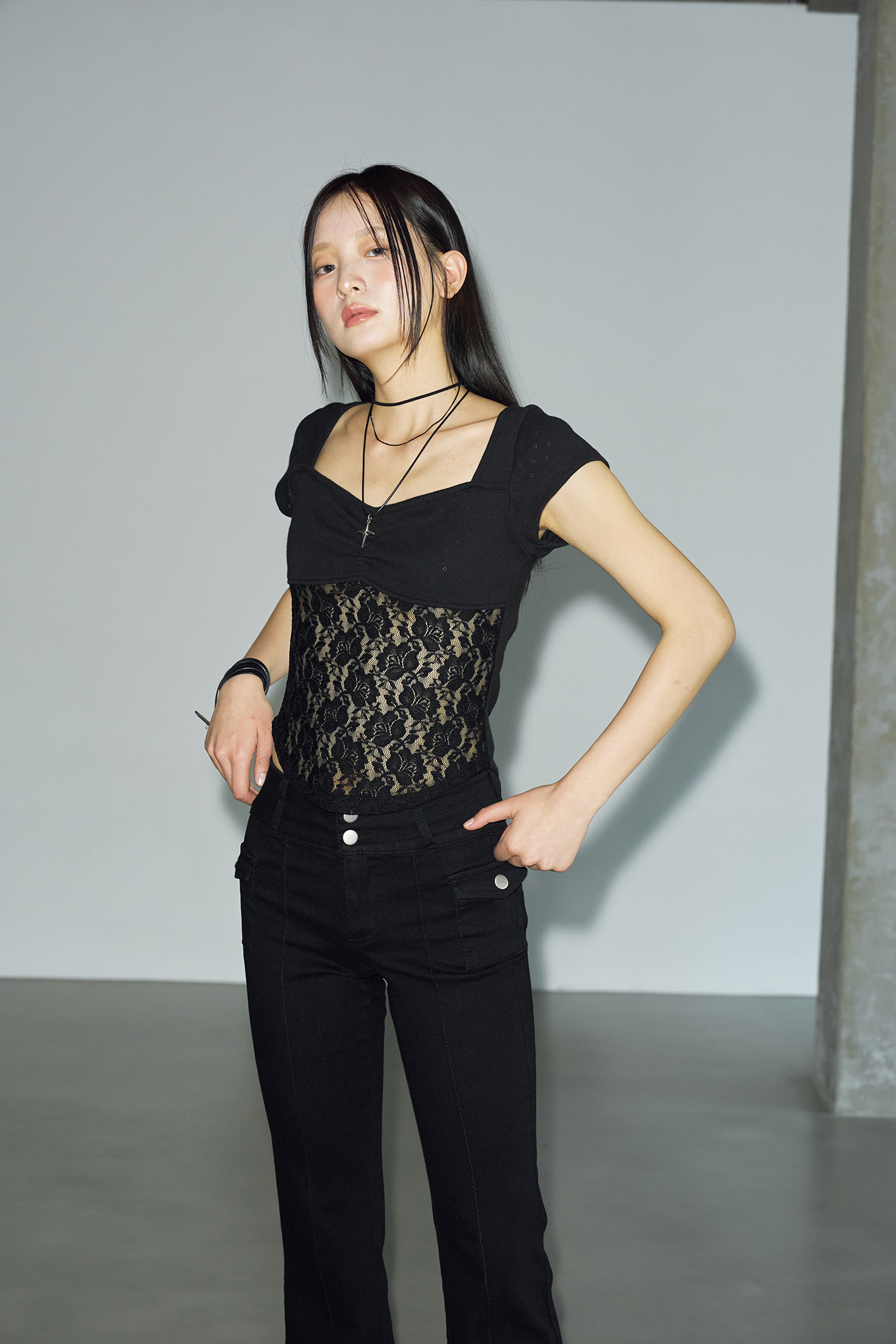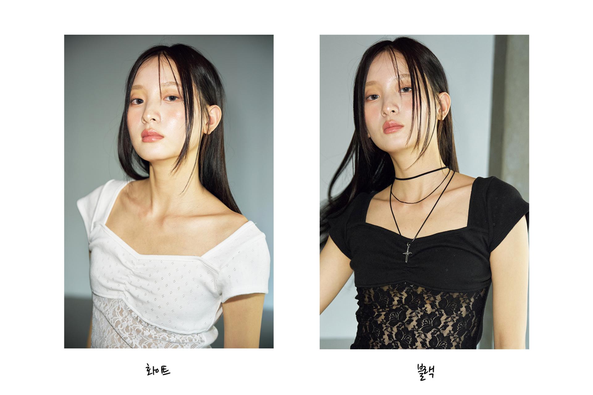 펀칭 콤비 레이스 하프 티셔츠 [블랙]