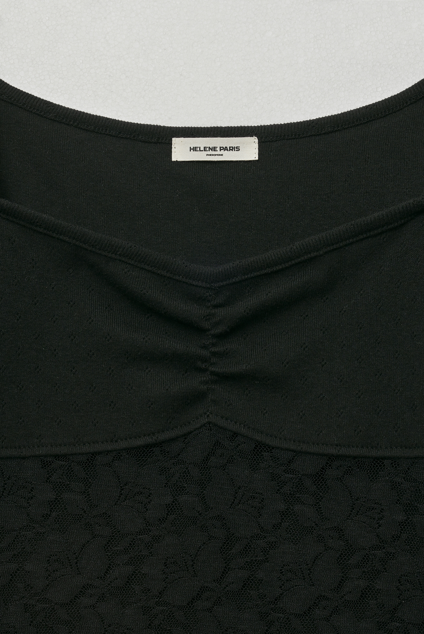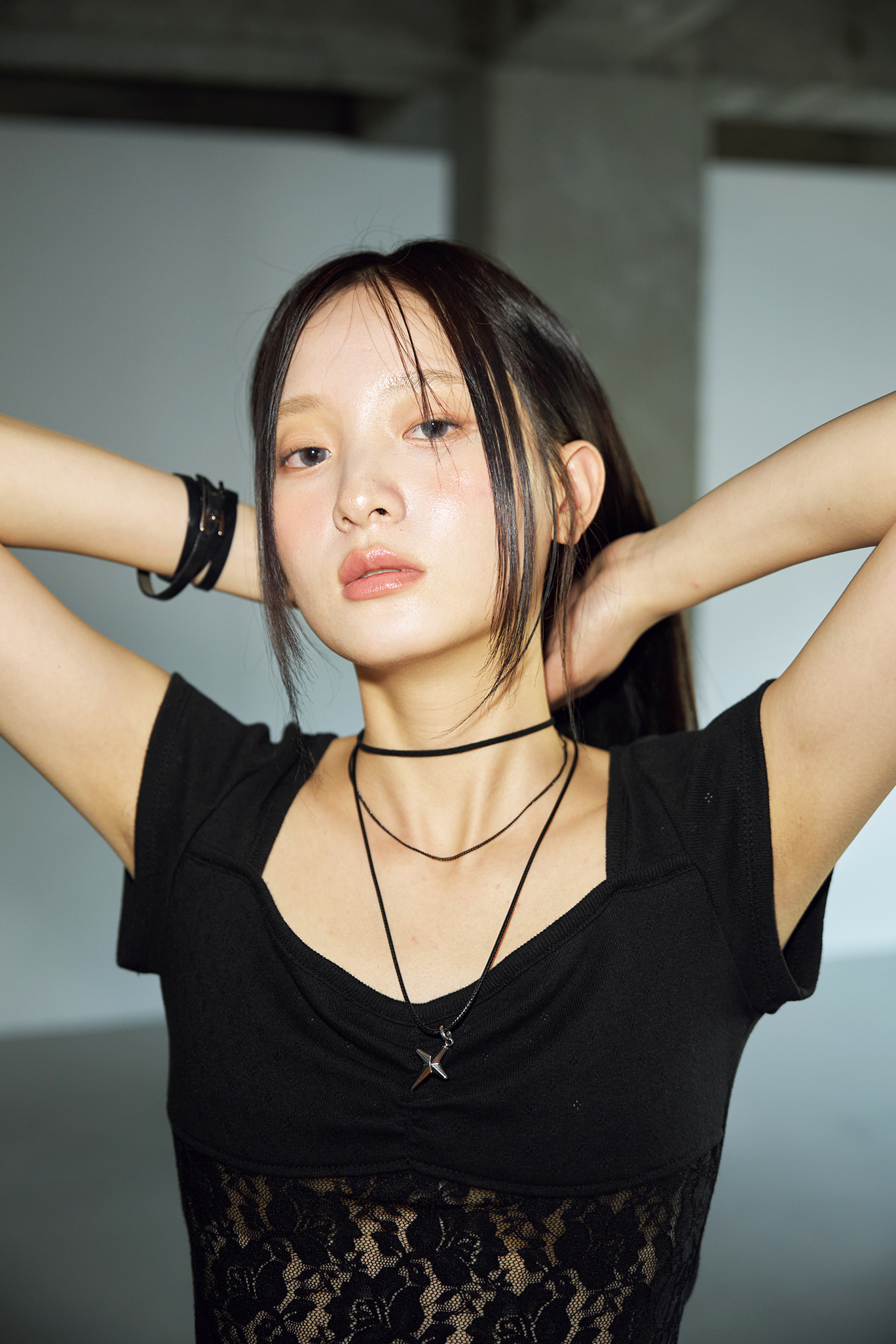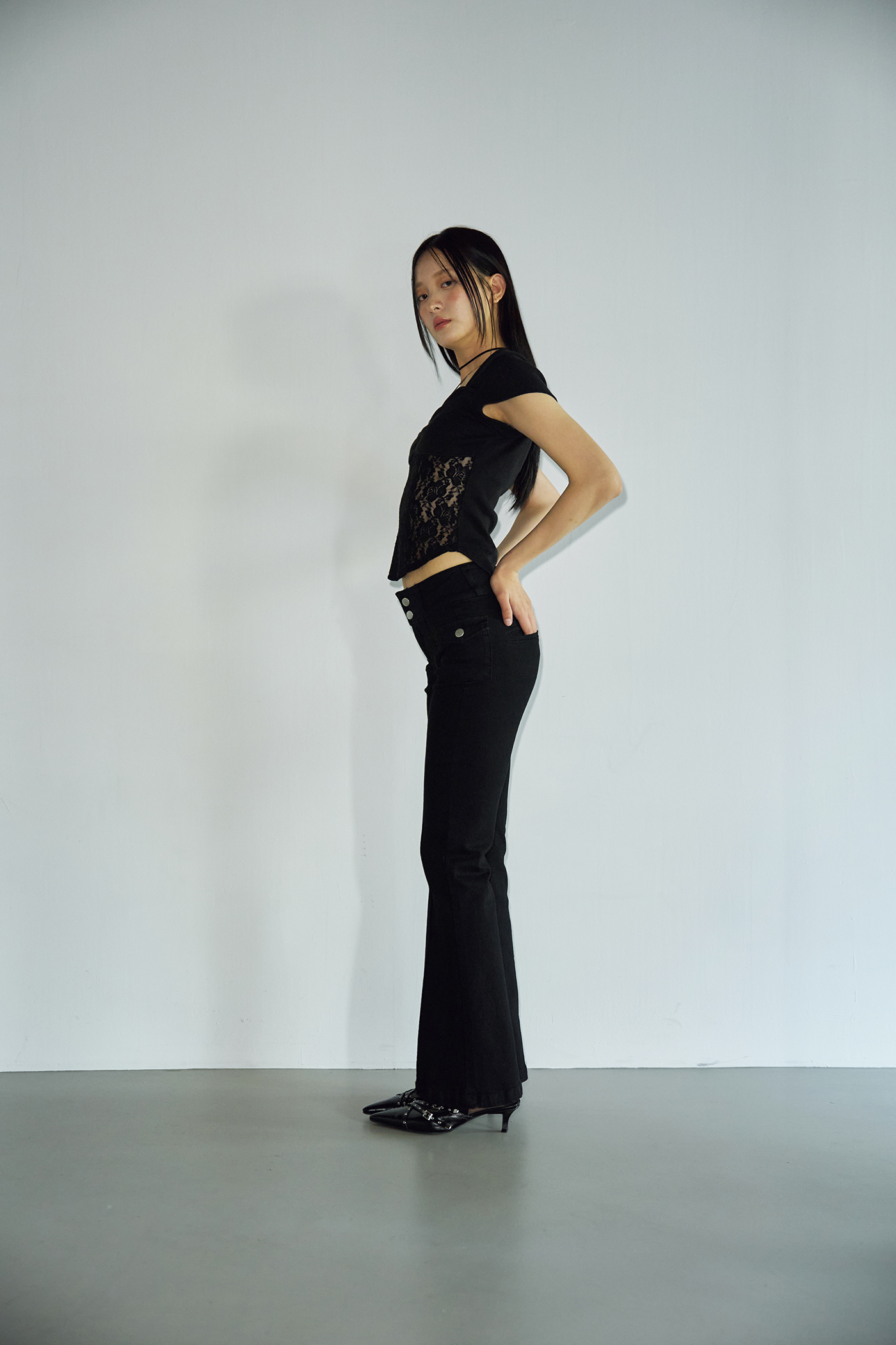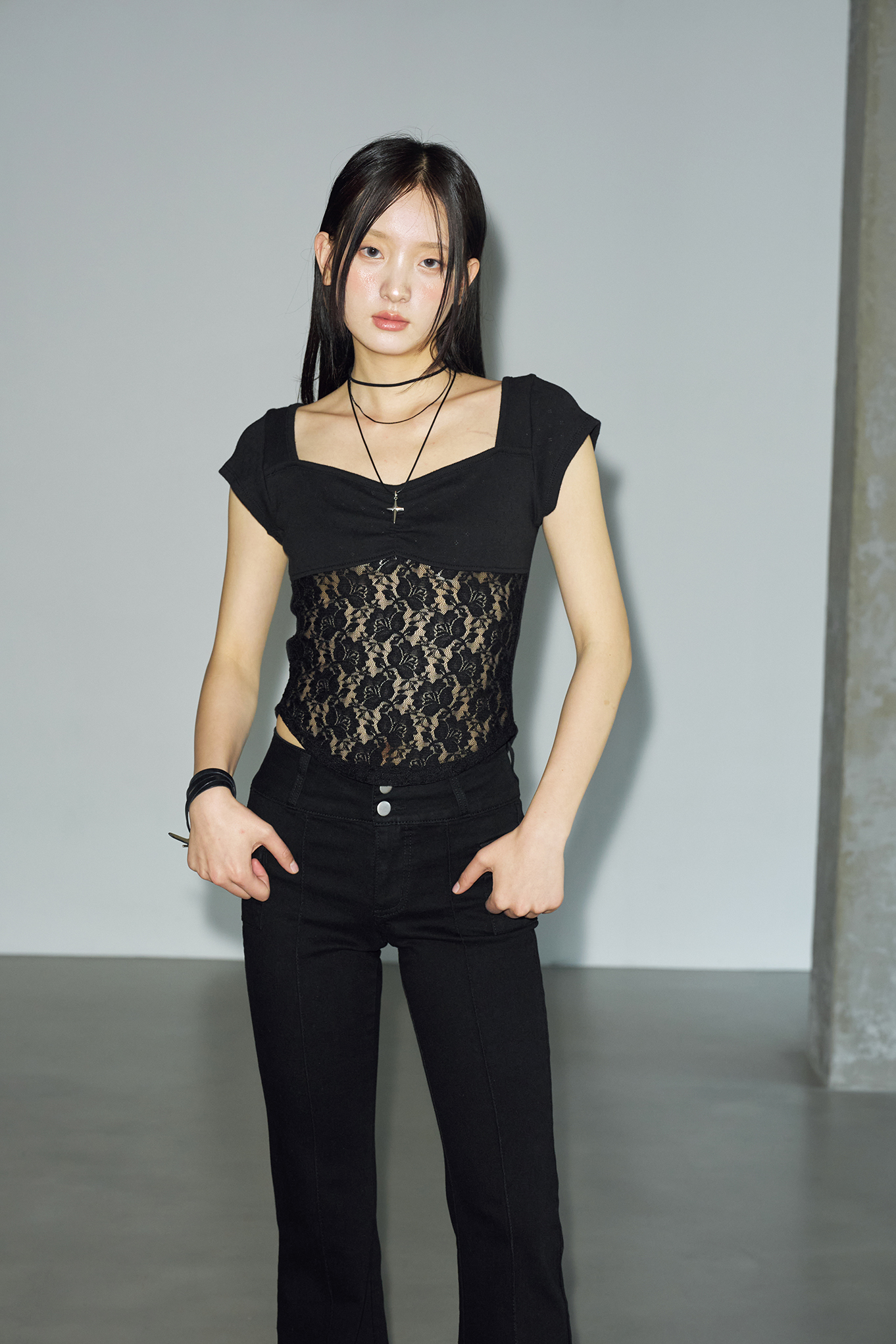 펀칭 콤비 레이스 하프 티셔츠 [블랙]