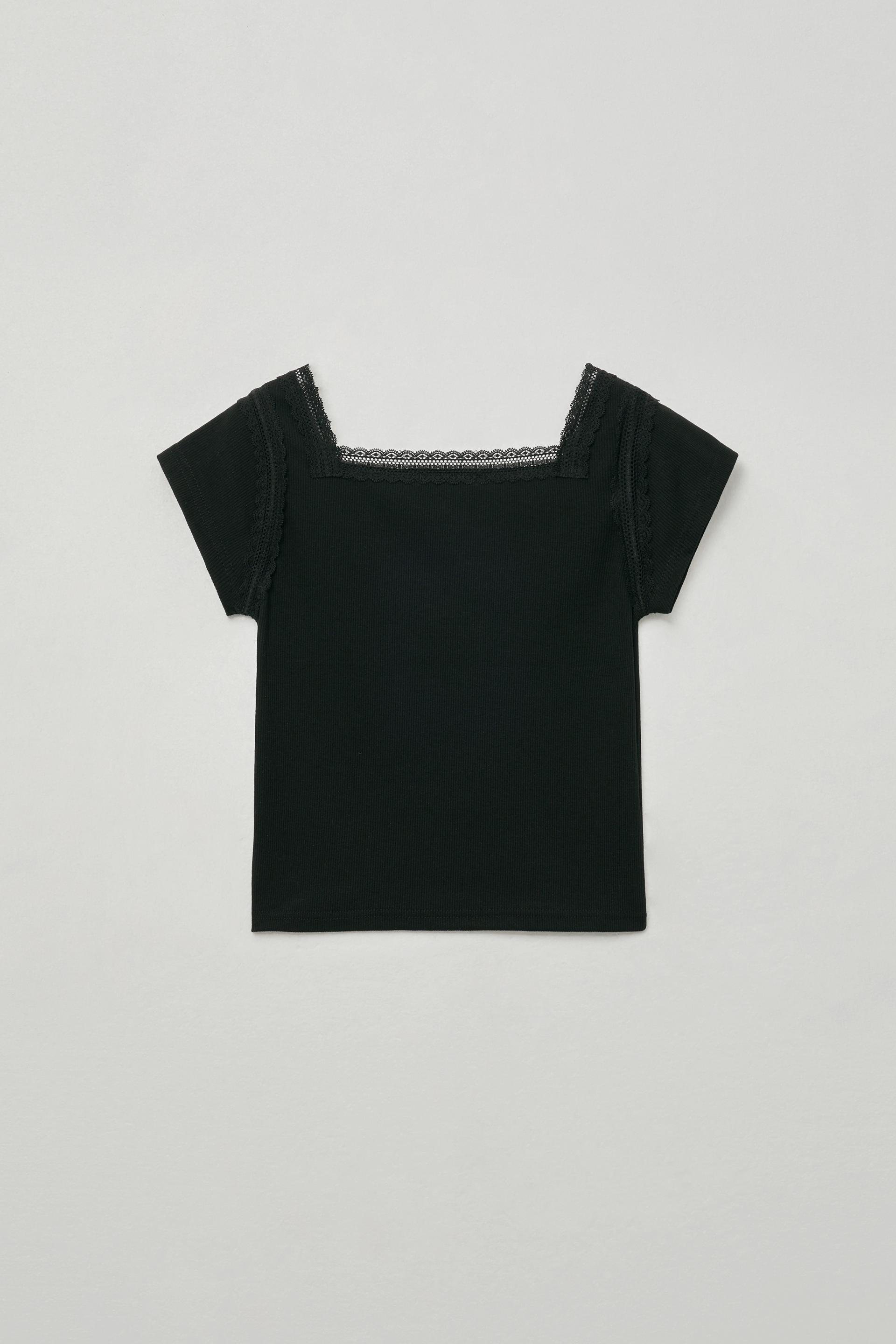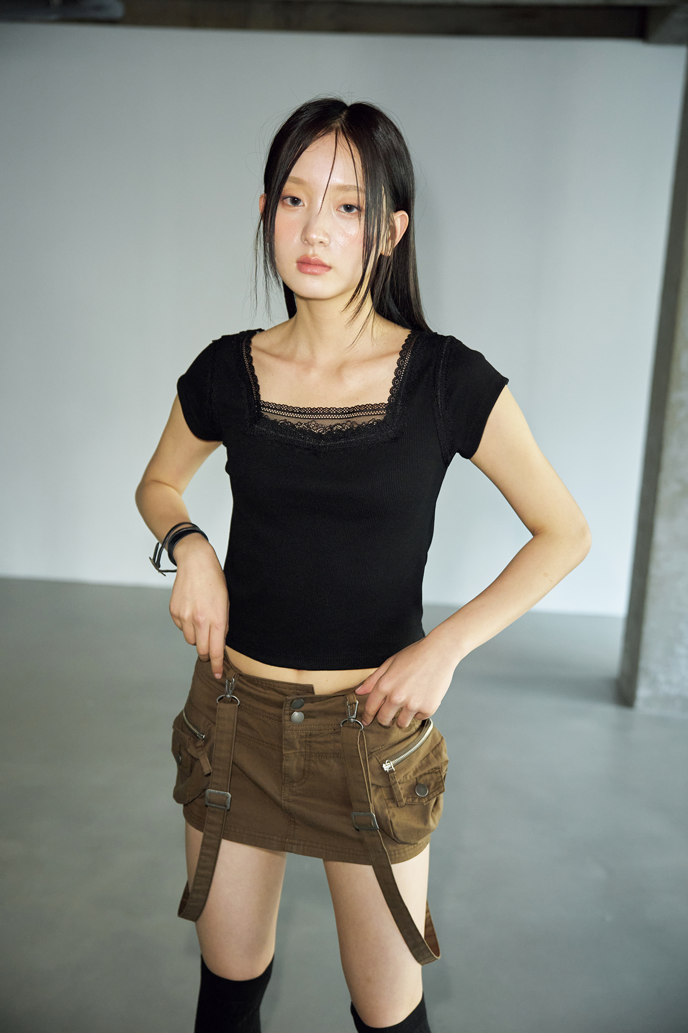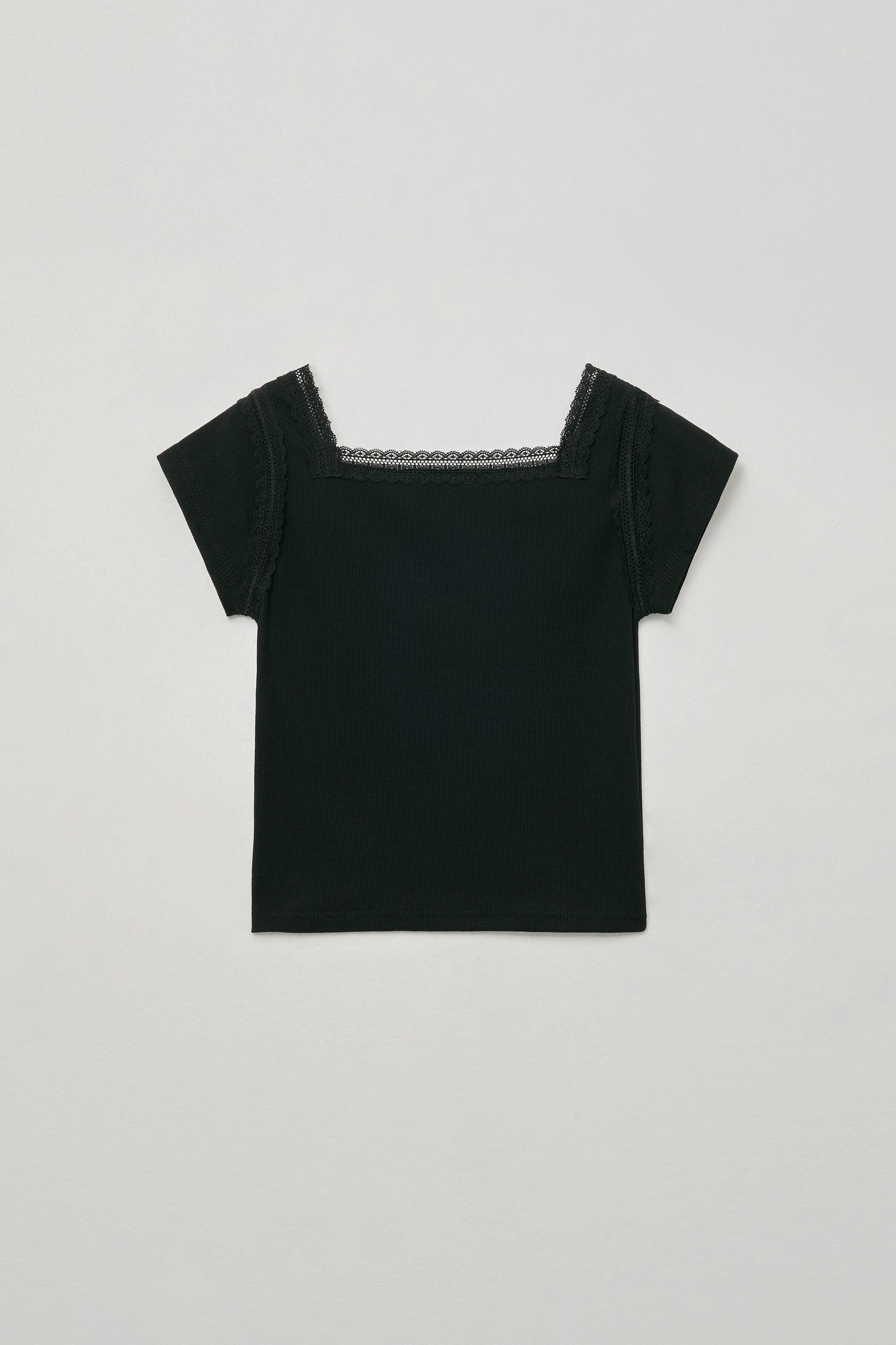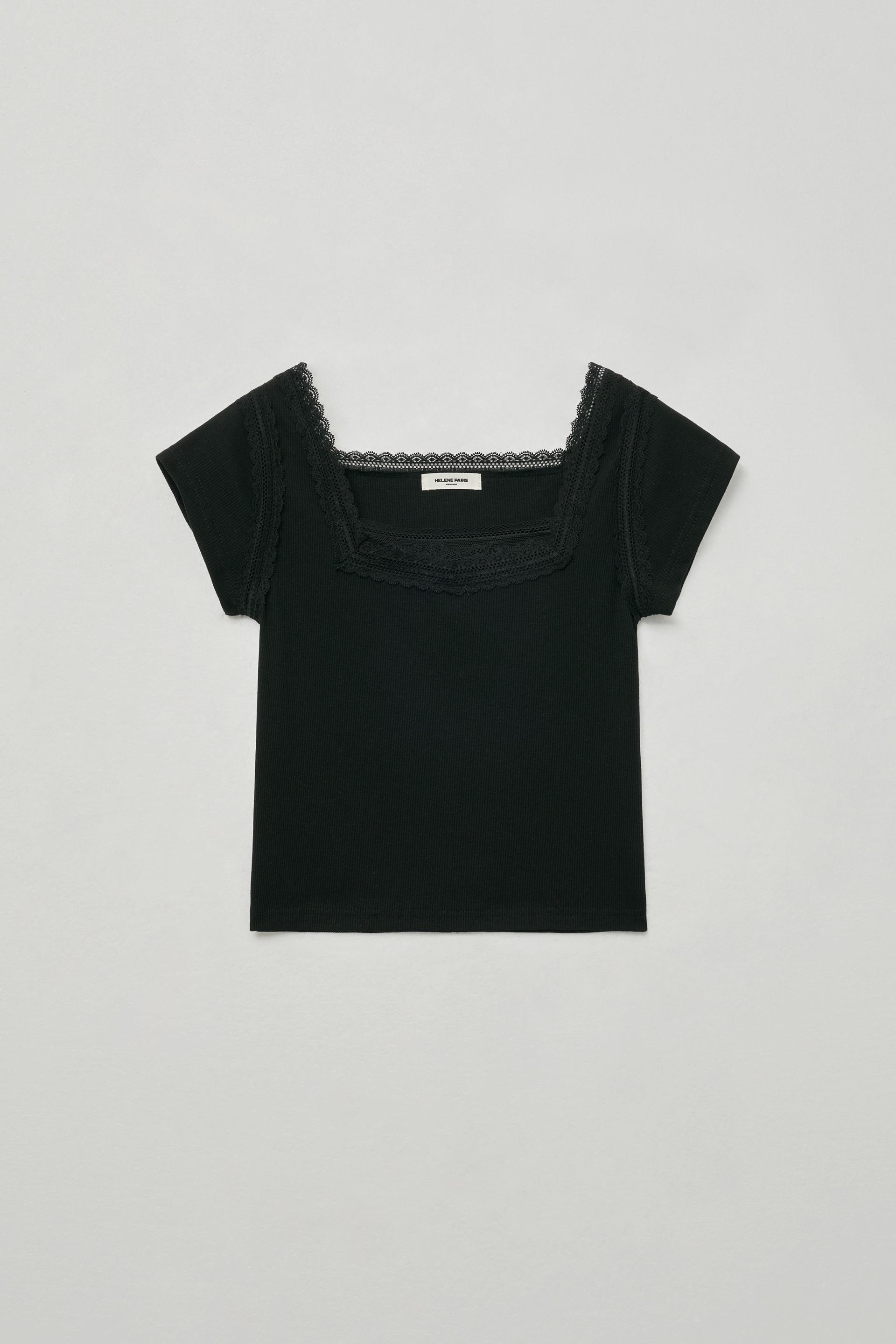 - 스퀘어 넥 디자인에 레이스 디테일로 세련된 분위기를 더한 크롭 티셔츠입니다.